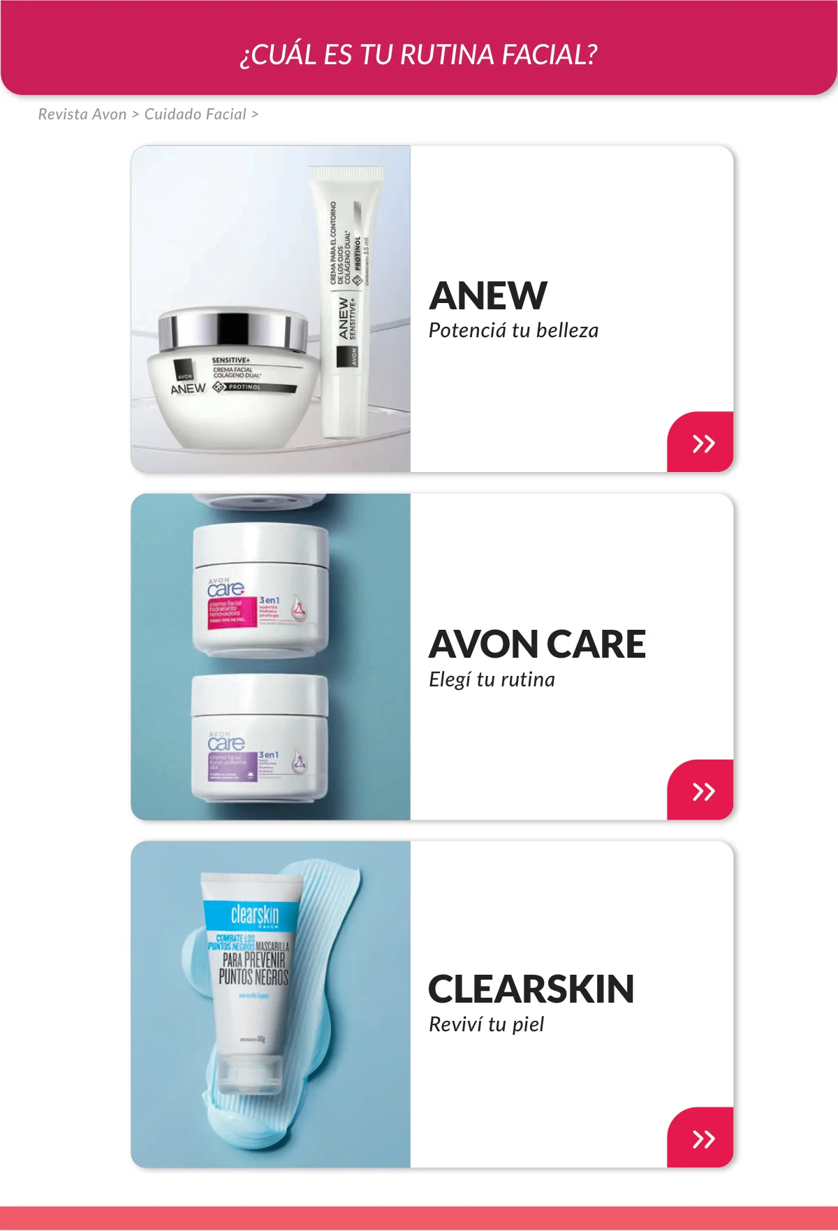 Care, Clear Skin, Anew y Avon, todas al unísono para traer con sus cremas, geles y ampollas lo que tu cuerpo pide para estar siempre fresco, revitalizado y feliz.