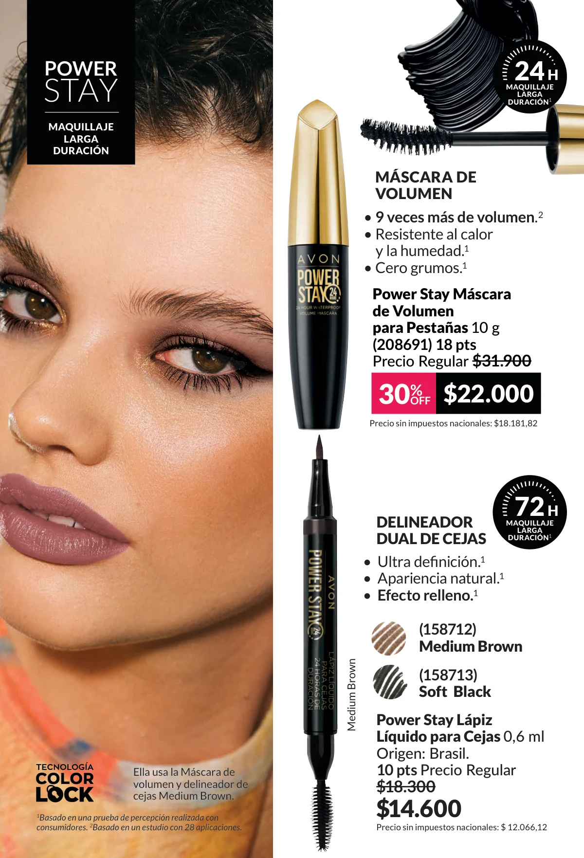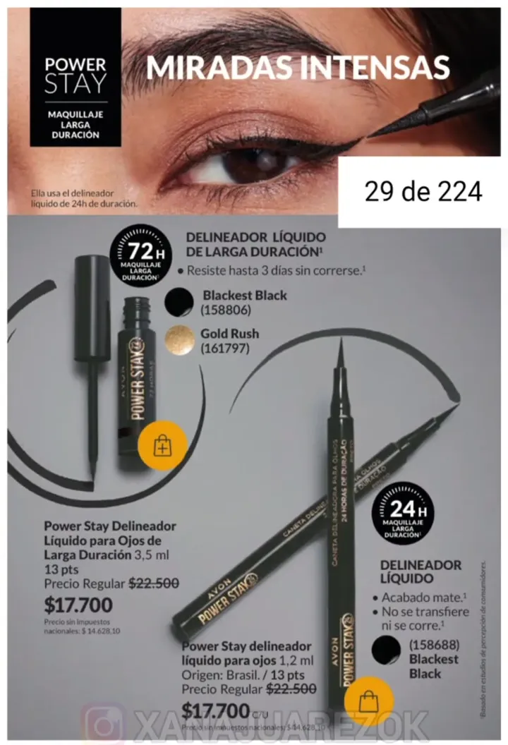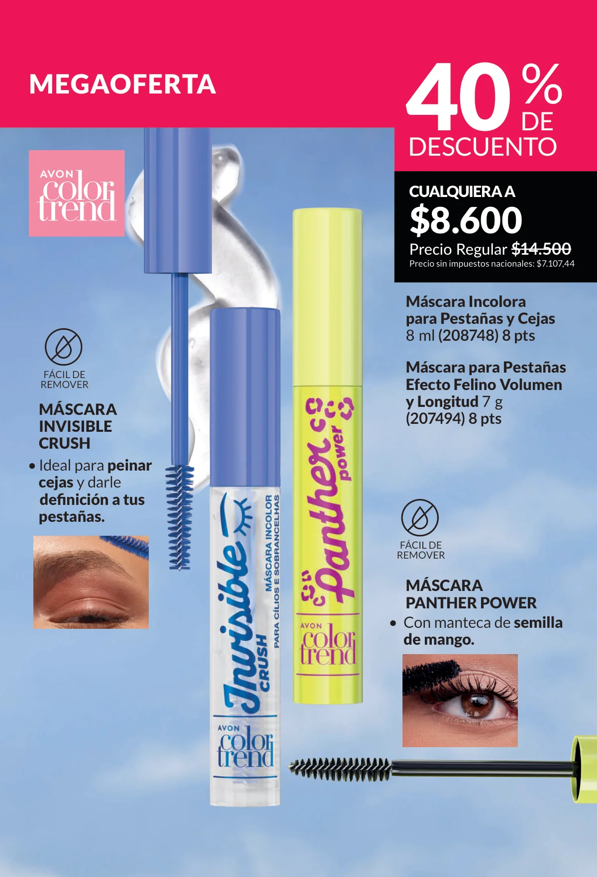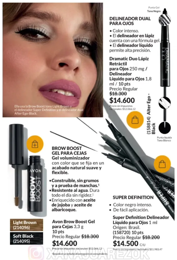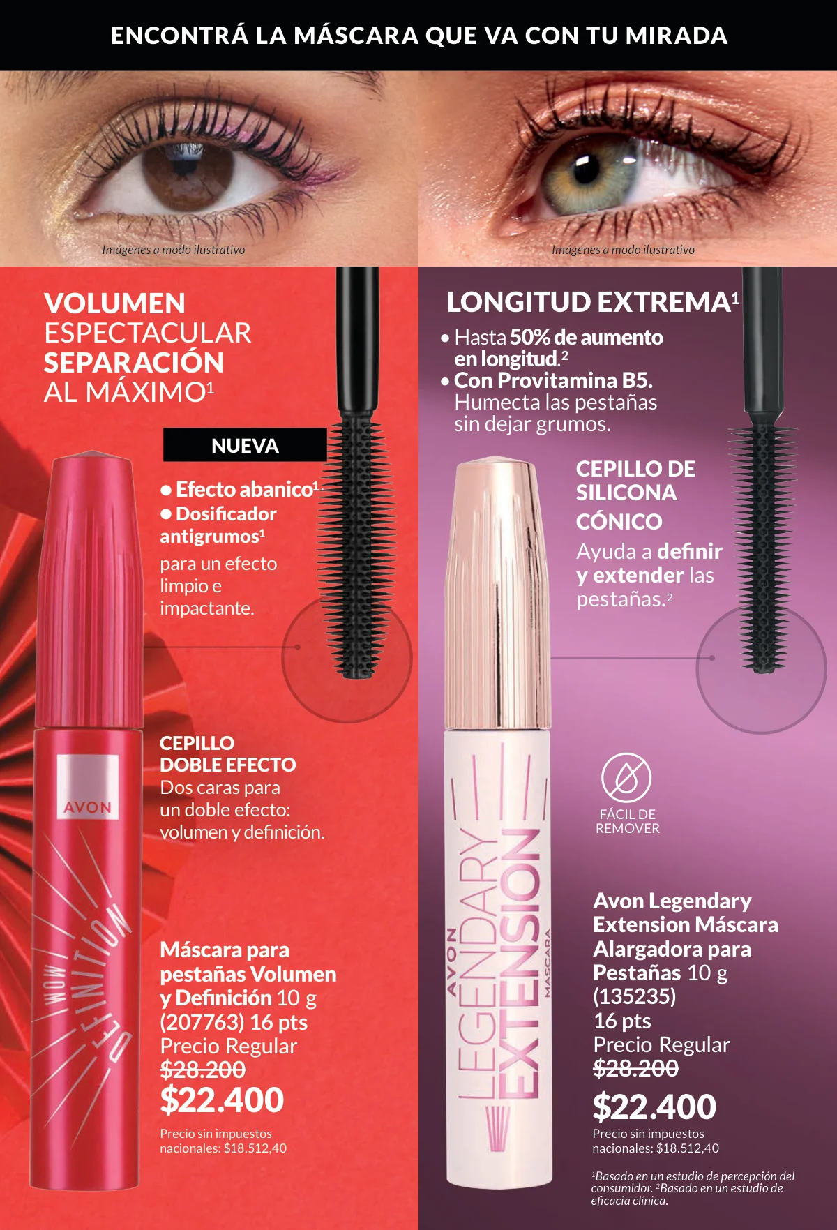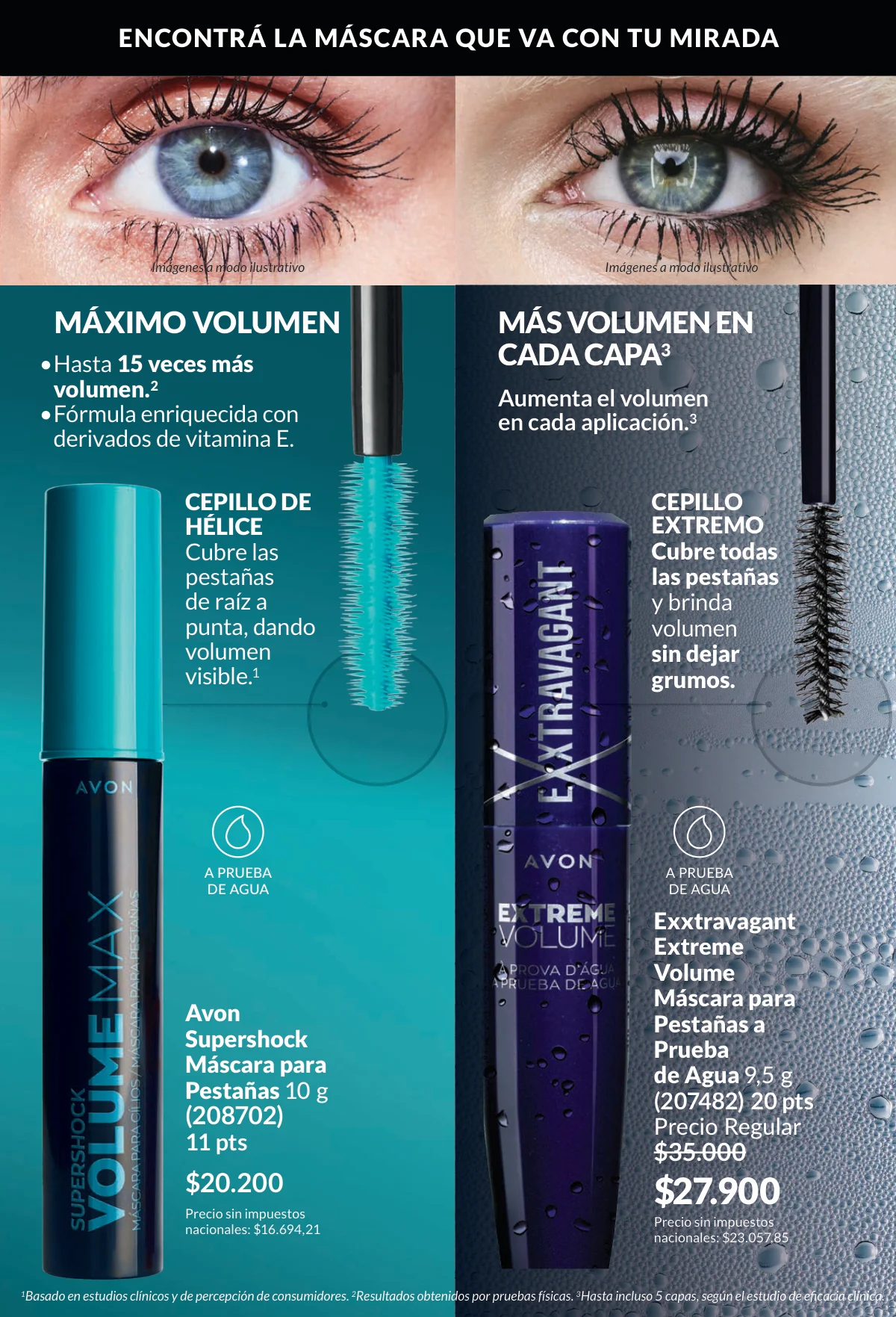 Para iniciar y ver con mejor perspectiva, las máscaras para pestañas efecto súper long es lo primero a destacar. Seguidamente, los delineadores líquidos, estos de colores y a un precio de 2 x 1, son un infaltable en tu próximo pedido.