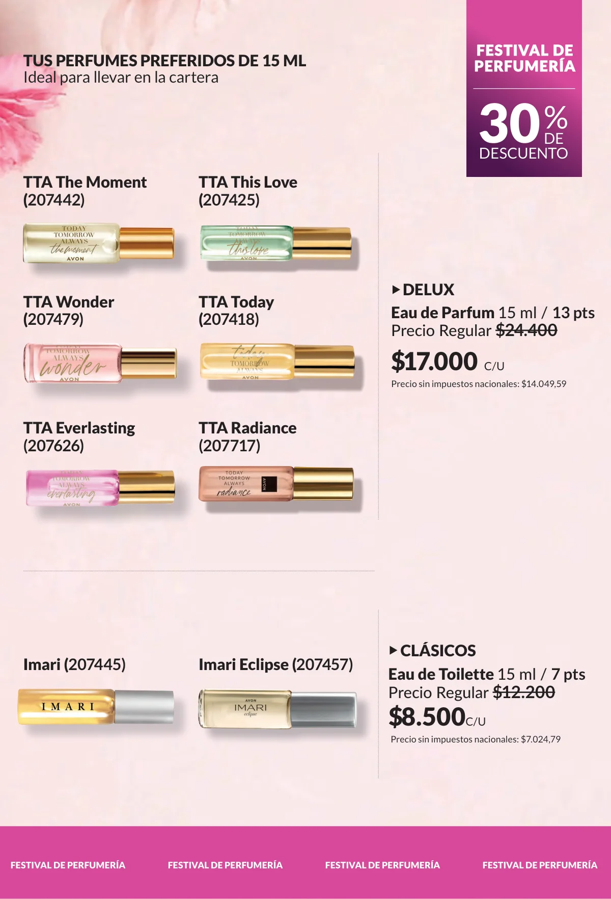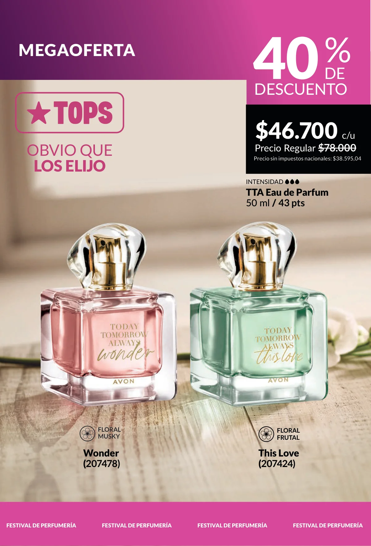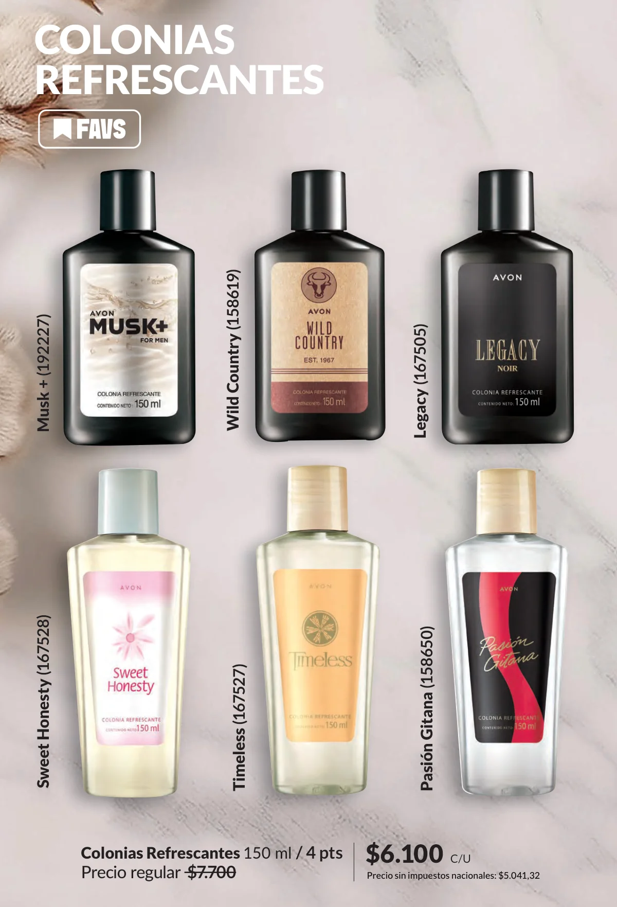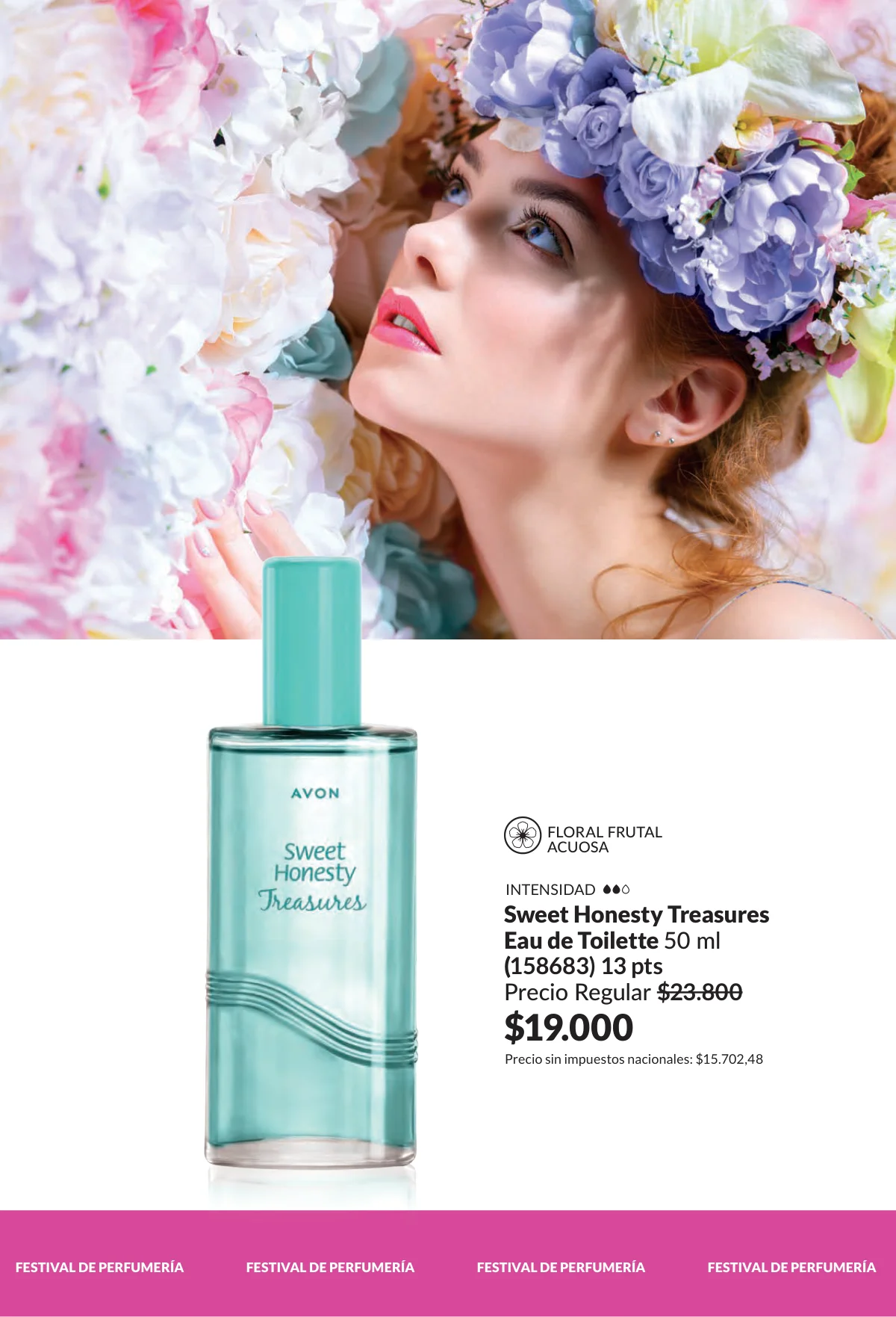 Los perfumes de catálogo Avon campaña 6 2026 también entran en la promoción de este mes. ¿Qué podés llevar en descuento? Muchísimas presentaciones como Sweet Honesty al 30% off, cualquiera de las fragancias de Scent Mix (30% off) o el set de eau de toilette, desodorante roll-on y aerosol a un 45% off.