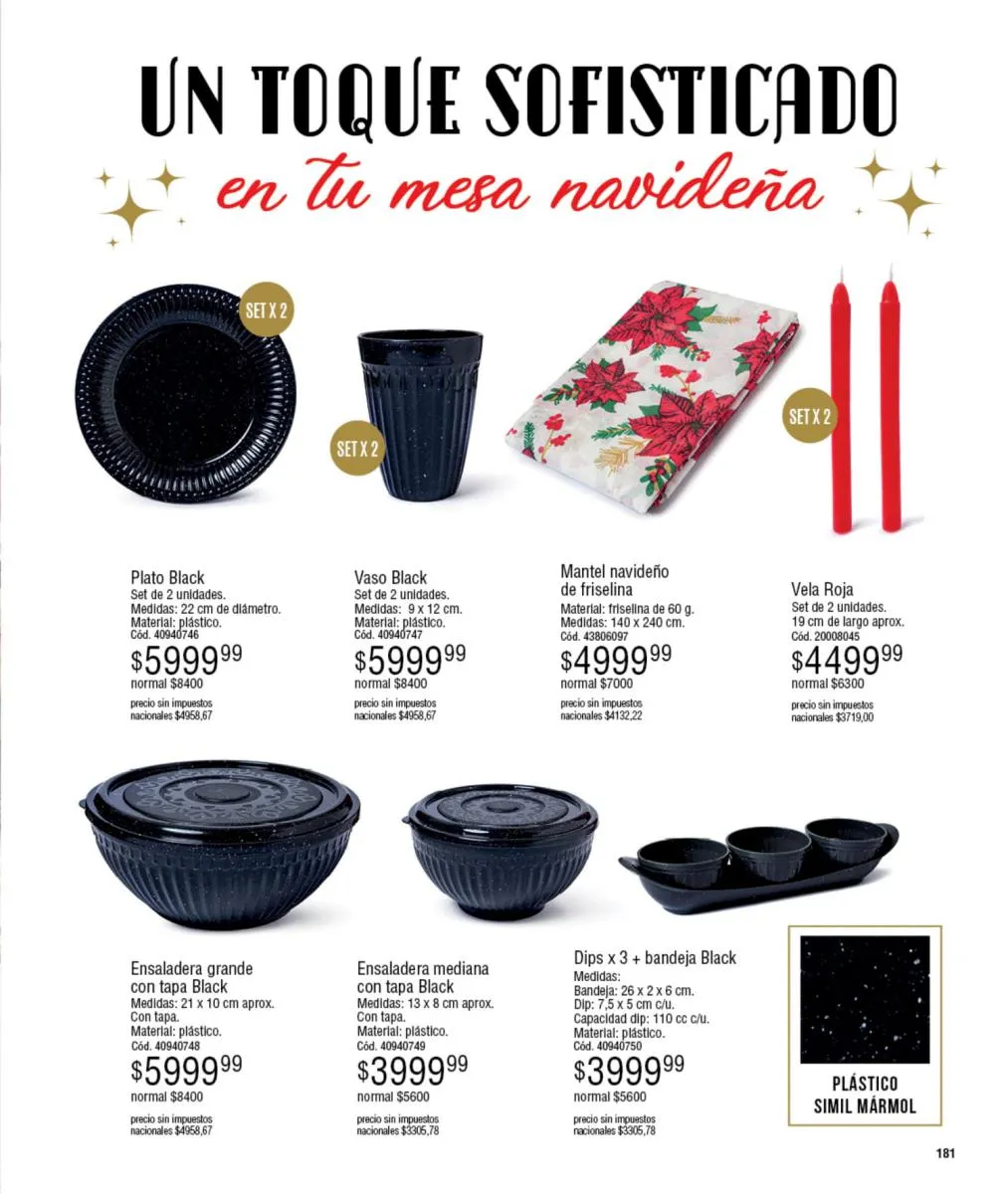 - Lo mejor para tu hogar desde la página, 146 y en la 182 con los mejores detalles para vestir tu mesa en esta Navidad: frapera, camino de mesa, bowls, moldes de silicona y mucho más para que prepares las comidas favoritas de tu familia en estas fiestas.