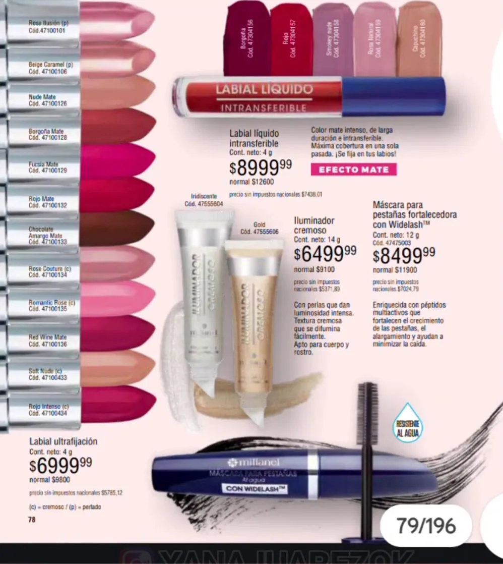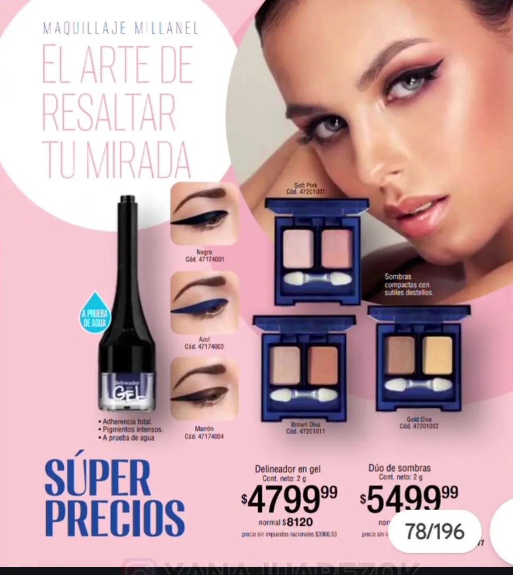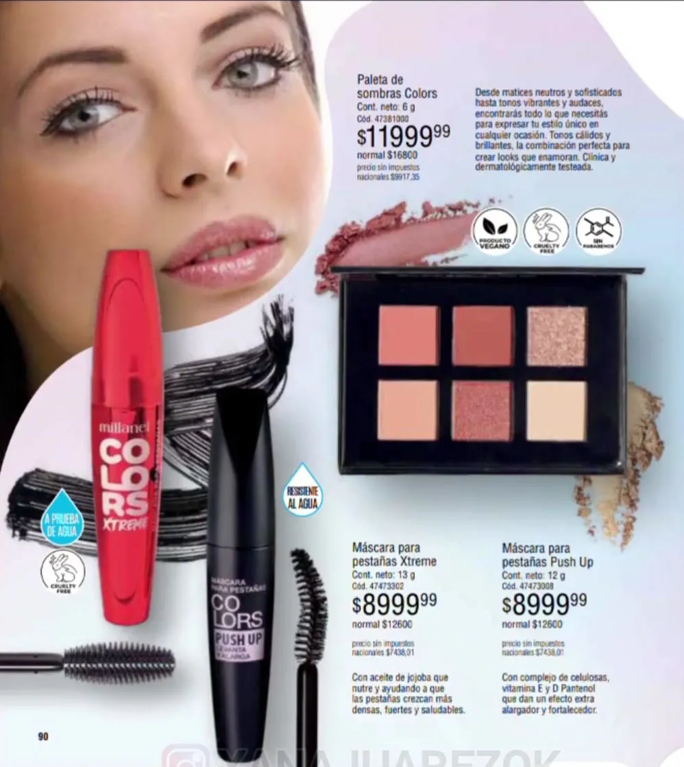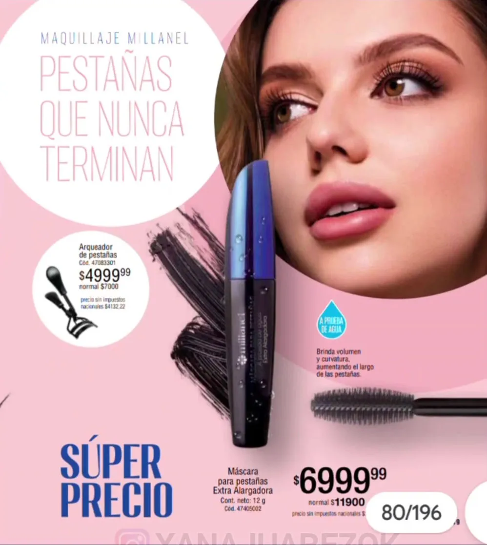 - Con la Máscara para pestañas de la linea Millanel disponible en color negro lograras un acabado perfecto con resistencia al agua, además le dará firmeza y volumen a tus pestañas, 12 g. Pag 7.