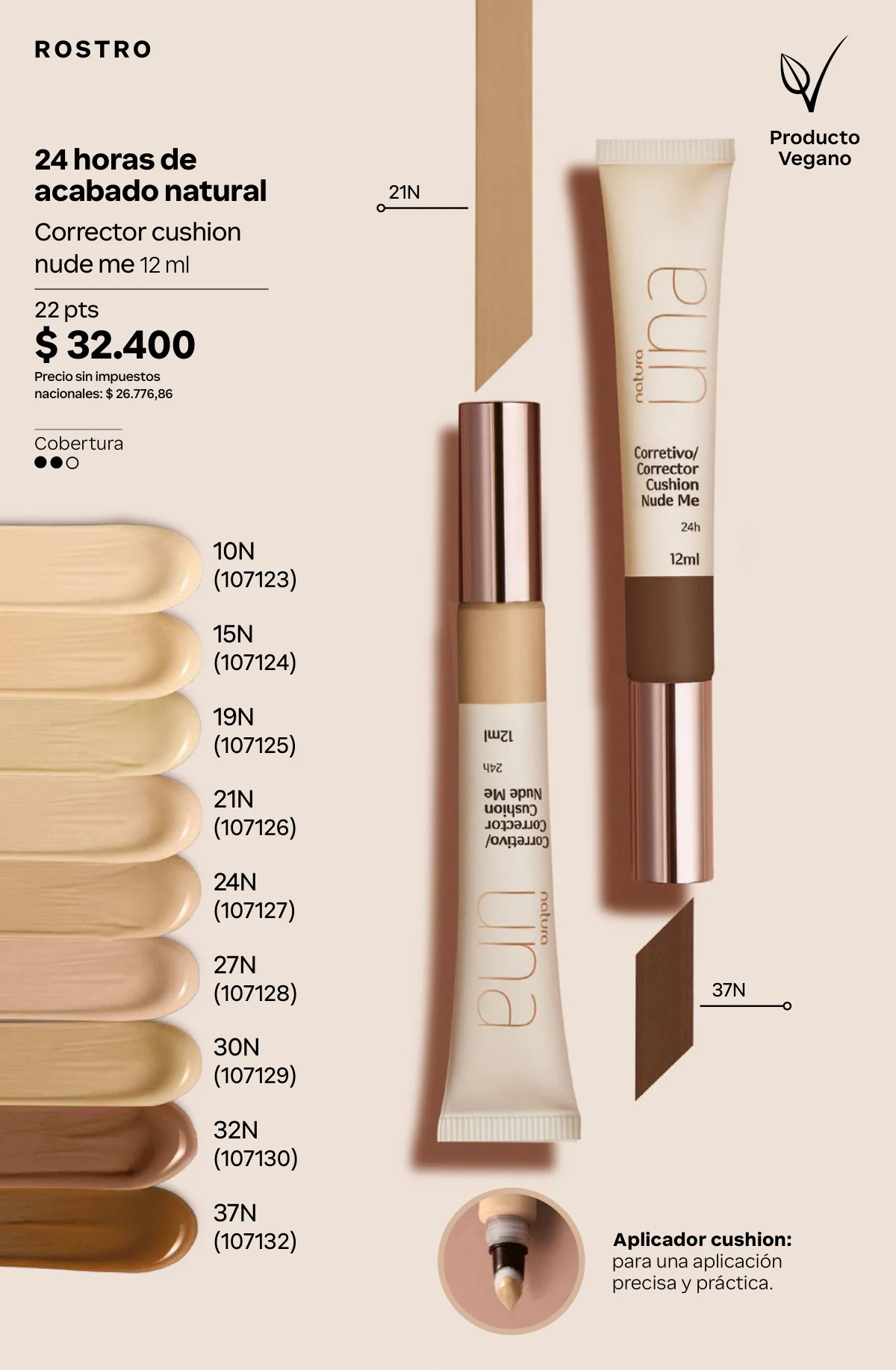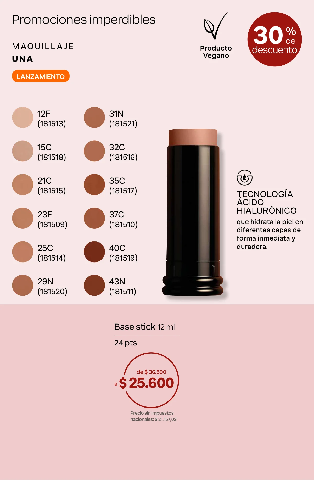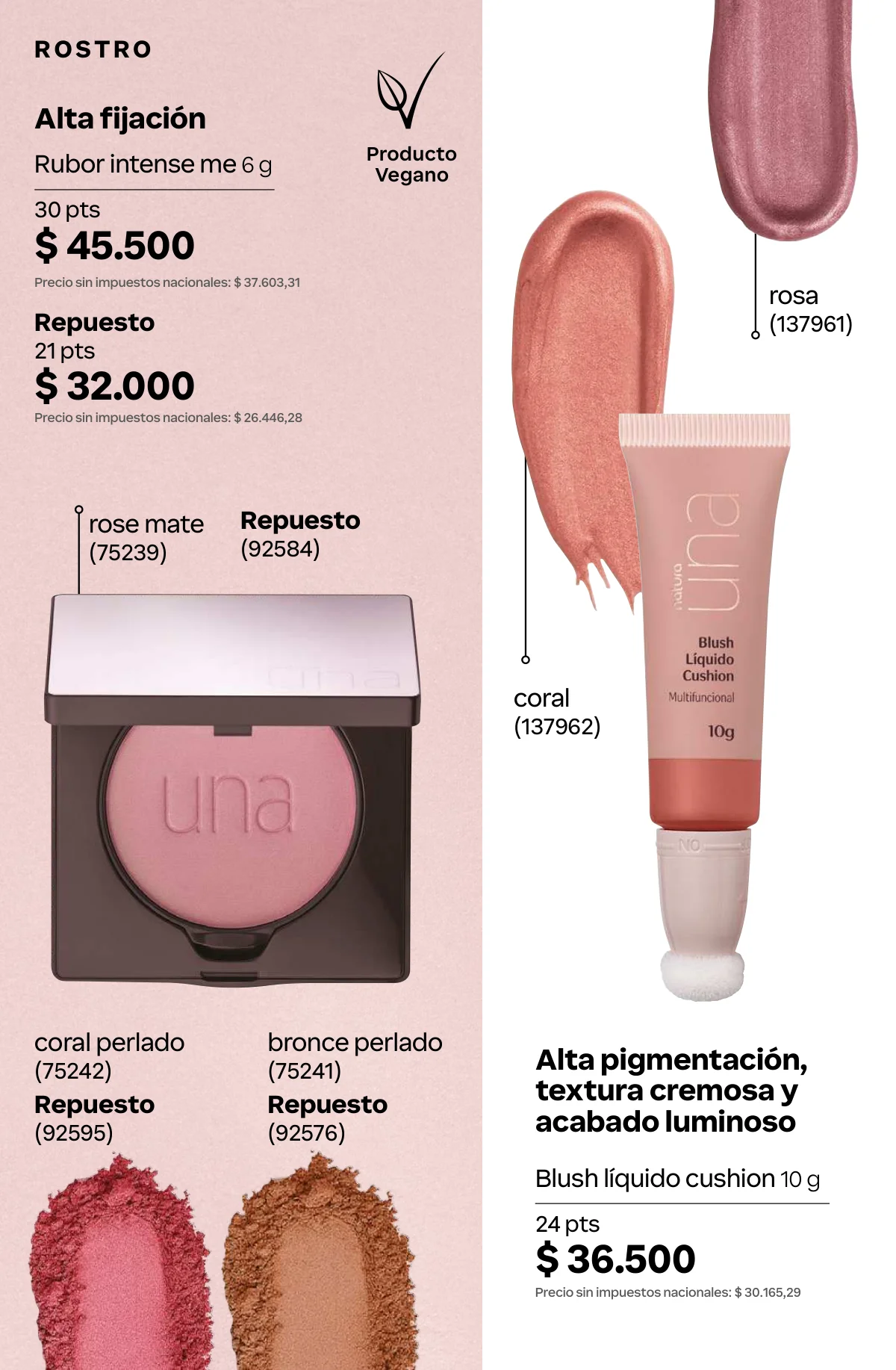 - Labial Una Cushion Multifuncional, disponible en dos tonos de 4,8 mg c/u; su versatilidad le permite ser usado como labial, sombra y rubor, gracias a su aplicador exclusivo con esponja.
