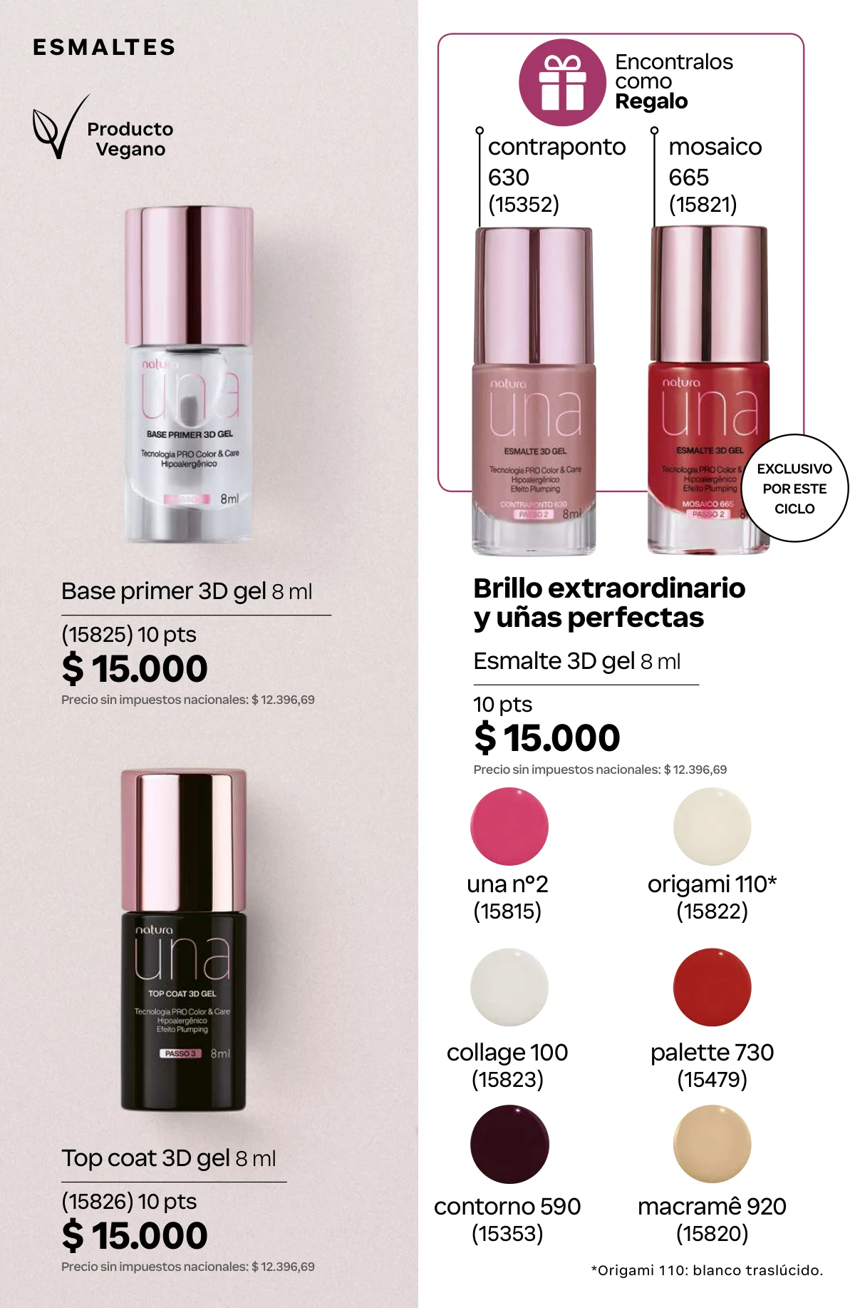 - Esmalte 3D gel de 5 ml. Con tecnología Pro Color & Care que le brinda una máxima protección a tus uñas, disponible en dos tonos.