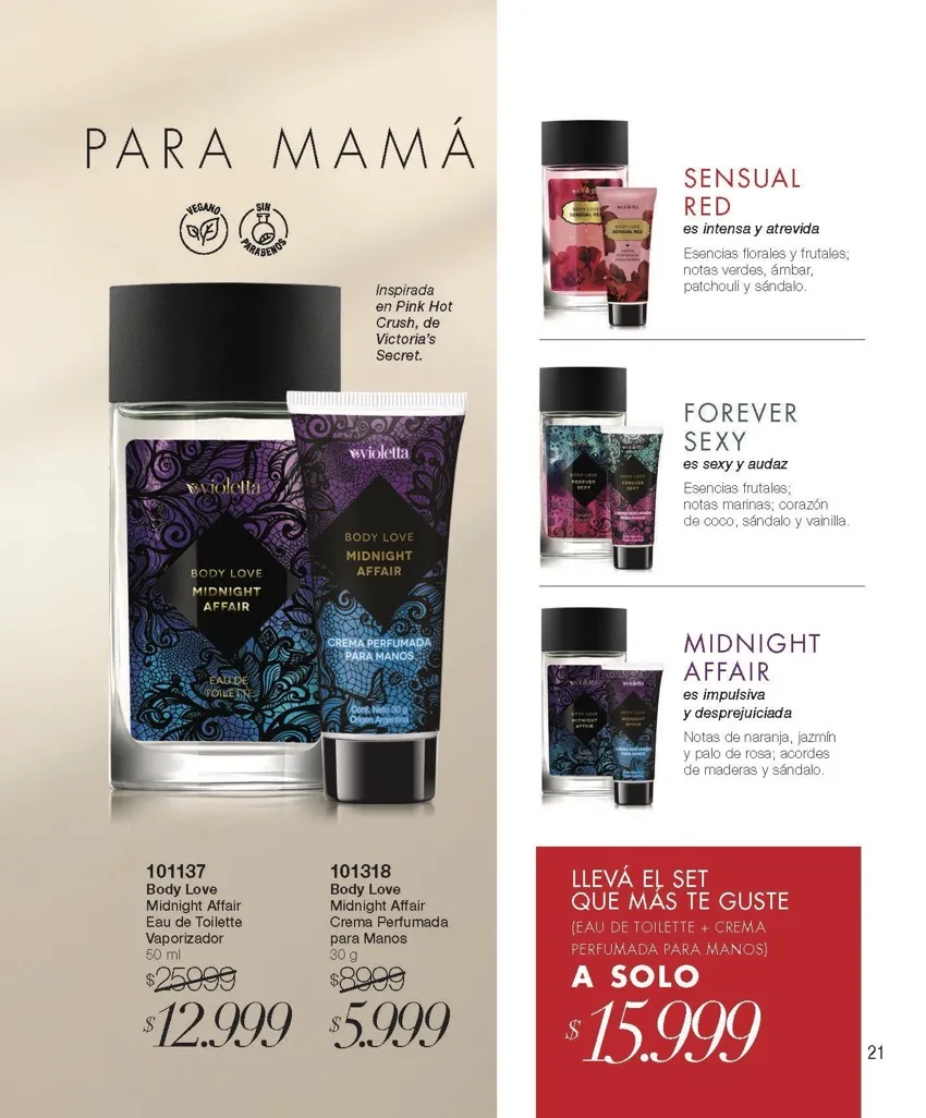 Hazla sentir divina y consiente su piel con la variedad de cosméticos y accesorios que encontrarás en el catálogo Violetta campaña 14 2025 Argentina. En esta temporada queremos brindarle a esas madres que dan todo por cada uno de nosotros lo mejor en fragancias dulces y suaves. Además de todo para el cuidado de su piel.