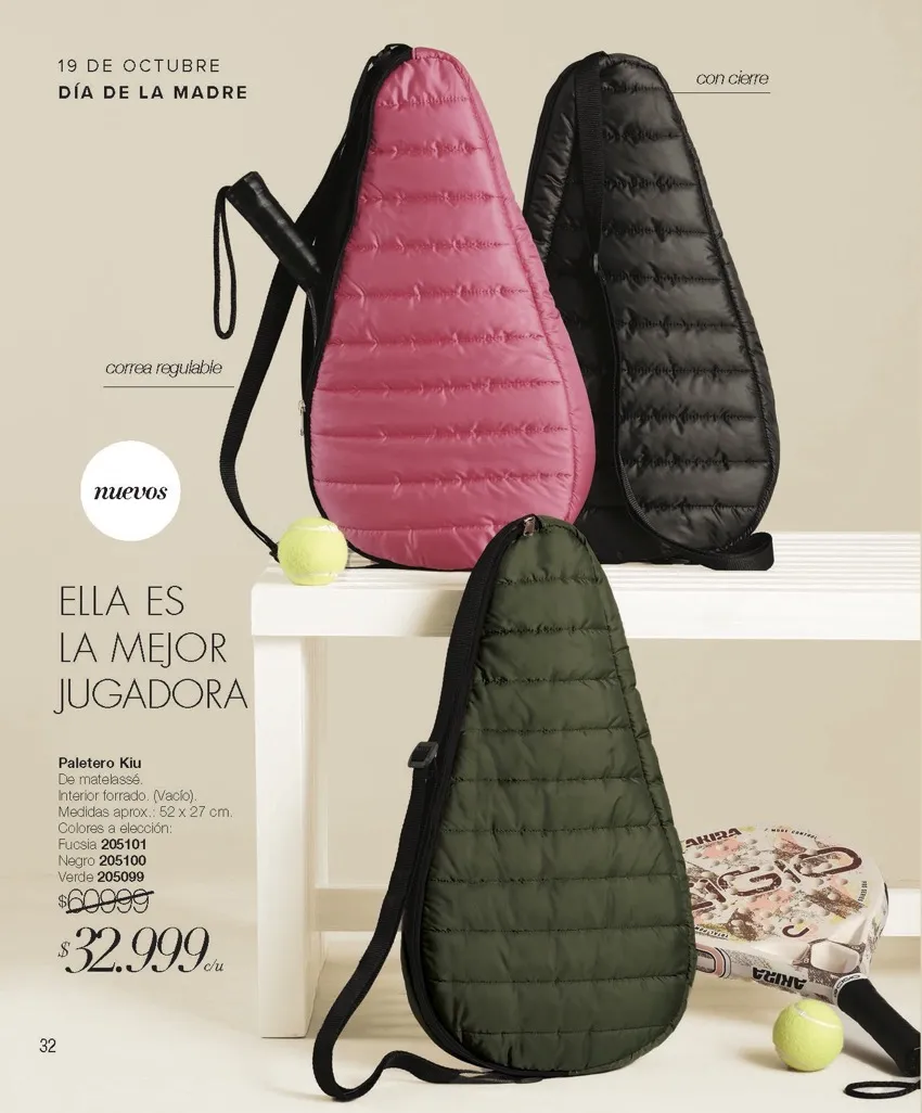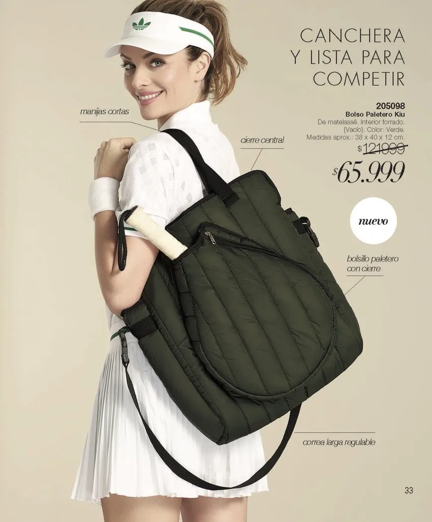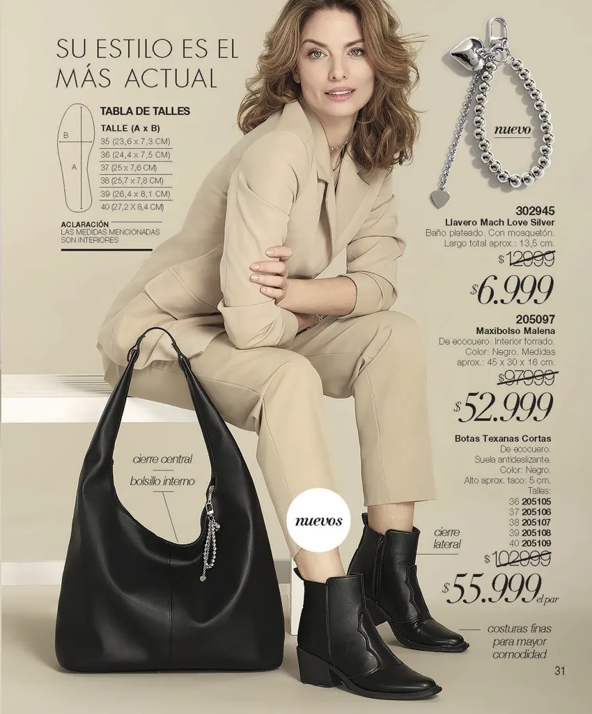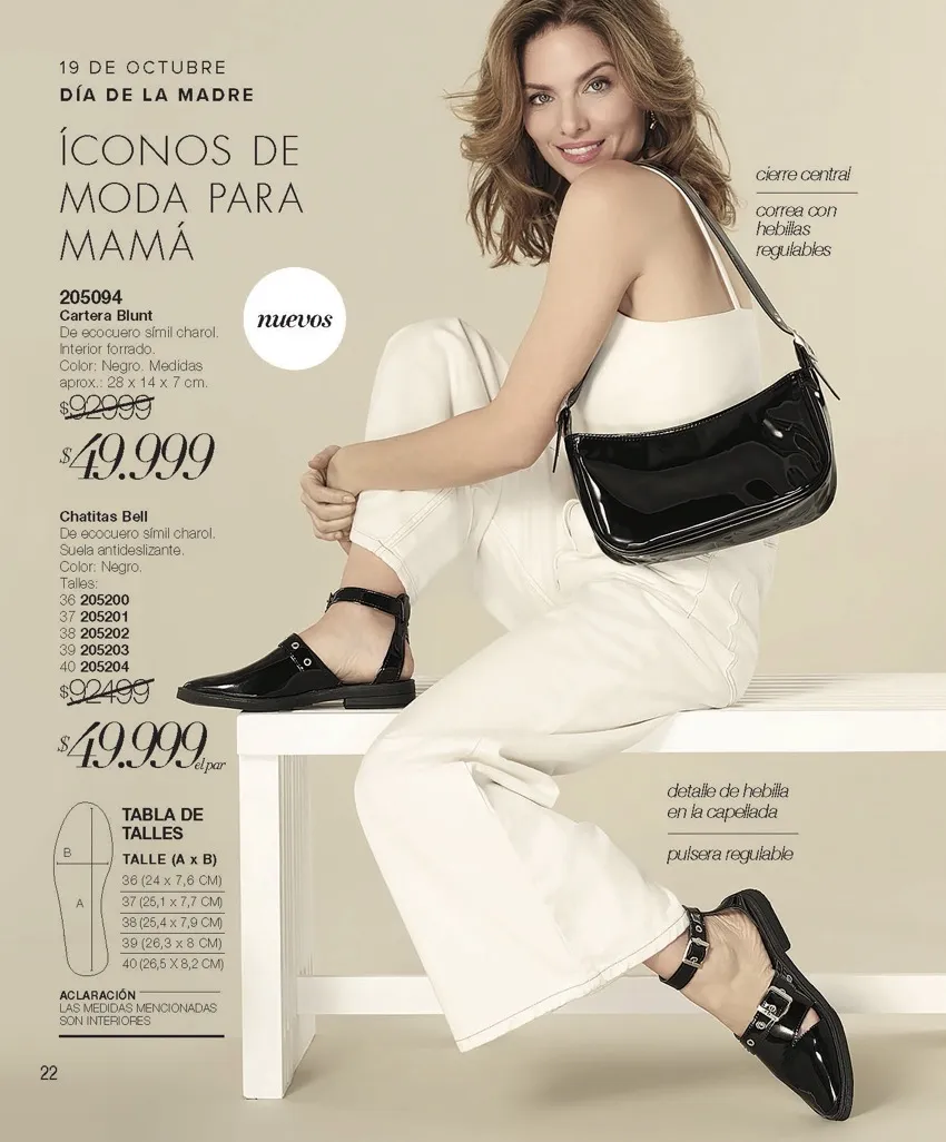 - Cartera Gianna Blue fabricada en símil de cuero granado, medidas aproximadas: 44 x 30 x 11 cm, disponible en color azul. Pag 19.