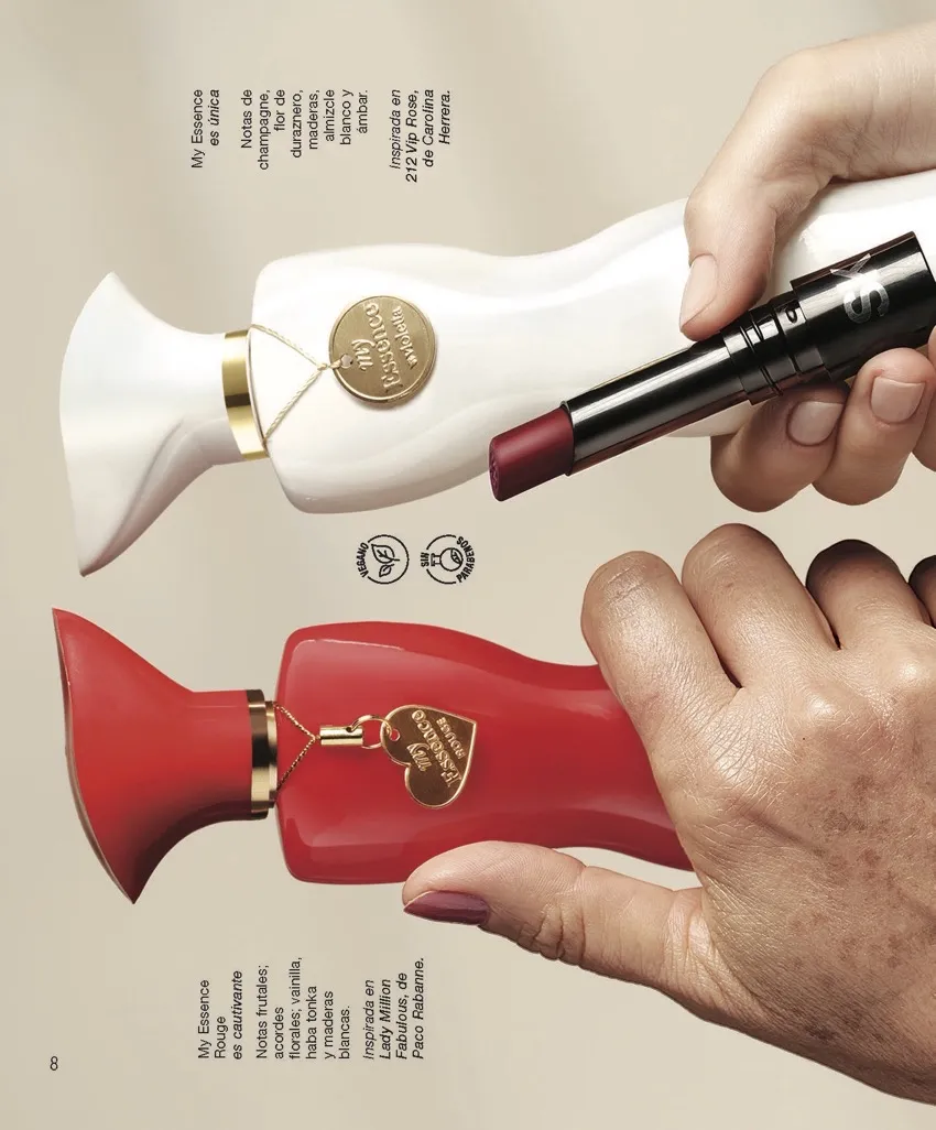 - Eau de toilette vaporizador de 95 ml de la línea My Essence Rouge con esencias florales y toques de vainilla, inspirada en Lady Million Fabulous de Pacco Rabbane. Pag 3.