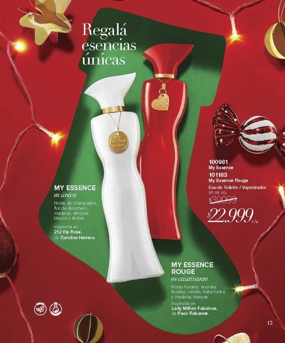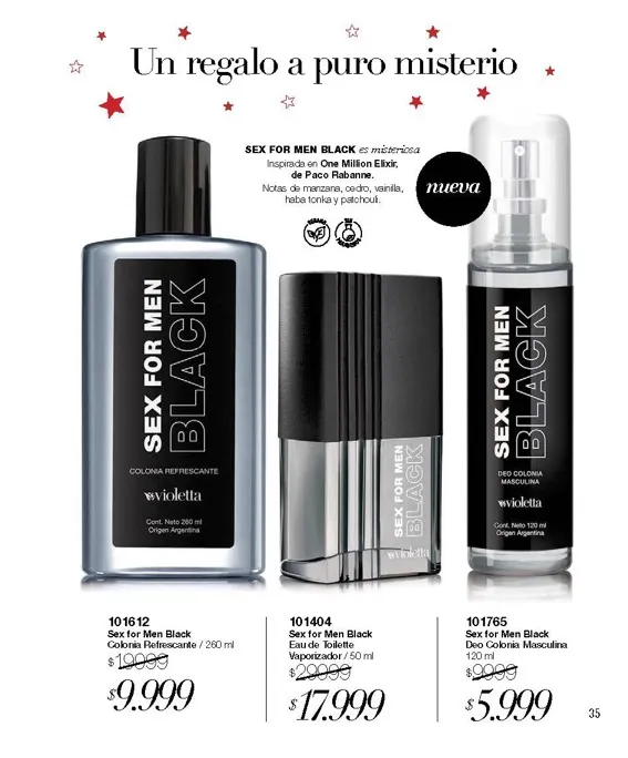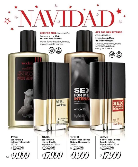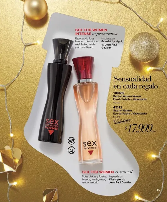 - A nivel de fragancias hay varias que te resultarán ideales para obsequiar. Las presentaciones de 15 ml son ideales para llevar en la cartera y las presentaciones de Sex for Women y My Essence resultan perfectas para vos.