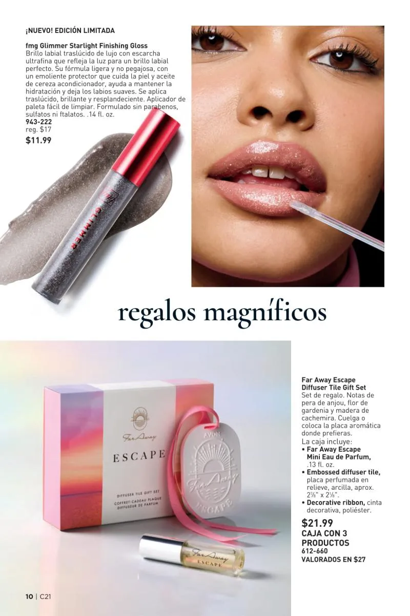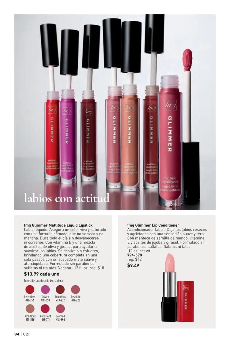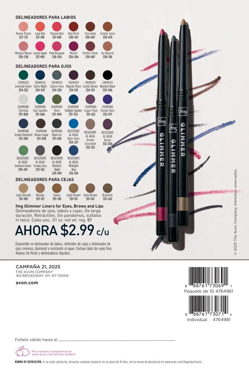 Más allá del esmalte, el catálogo Avon 21 2025 Estados Unidos pdf también dedica espacio al poder transformador del color de labios. La gama fmg Glimmer Satin Lipstick vuelve a lucirse con tonos de alto impacto como el llamativo Tulip, un fucsia eléctrico que realza cualquier look. Su fórmula cremosa con extracto de granada ofrece un acabado satinado y modulable, apto tanto para un maquillaje de día como de noche.