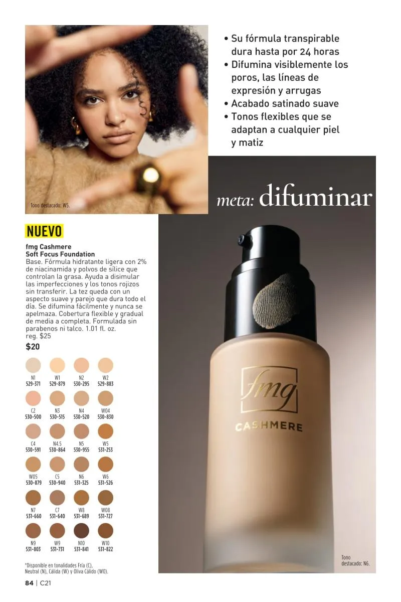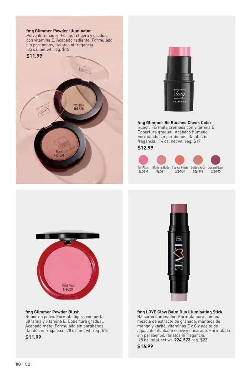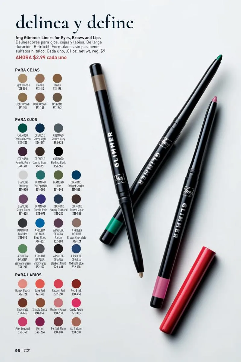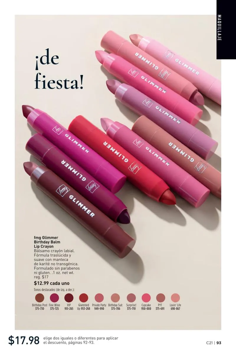 Más allá del esmalte, el catálogo Avon 21 2025 Estados Unidos pdf también dedica espacio al poder transformador del color de labios. La gama fmg Glimmer Satin Lipstick vuelve a lucirse con tonos de alto impacto como el llamativo Tulip, un fucsia eléctrico que realza cualquier look. Su fórmula cremosa con extracto de granada ofrece un acabado satinado y modulable, apto tanto para un maquillaje de día como de noche.