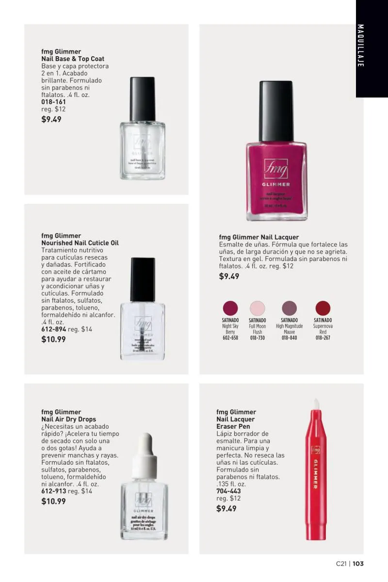 En esta edición del catálogo Avon campaña 21 2025 USA, también se resalta la importancia del cuidado de las uñas antes, durante y después de la aplicación del esmalte. El producto fmg Glimmer Nail Base & Top Coat cumple doble función como base protectora y acabado brillante. Y si necesitas corregir pequeños errores, el práctico Nail Lacquer Eraser Pen te permite limpiar los bordes sin maltratar la piel.