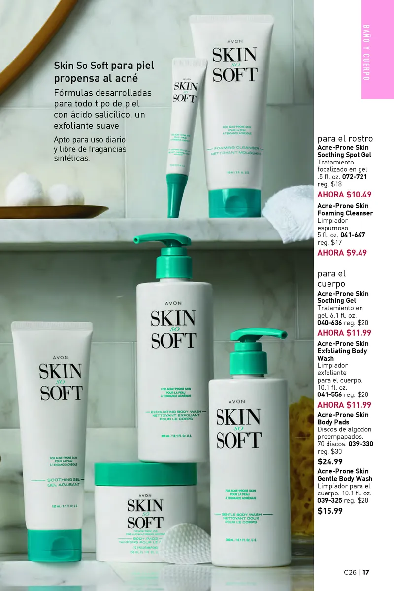 La innovación no se detiene en el cabello. El catálogo Avon campaña 26 2025 USA también lanza opciones avanzadas para el cuidado corporal, especialmente diseñadas para pieles sensibles o propensas al acné. La gama Skin So Soft Acne-Prone está formulada con ácido salicílico, ideal para mantener la piel limpia, sin brotes y libre de fragancias sintéticas. Incluye limpiadores espumosos, discos exfoliantes, geles calmantes y lociones corporales suaves que pueden usarse diariamente. Es una solución práctica para quienes buscan un equilibrio entre limpieza efectiva y cuidado delicado.