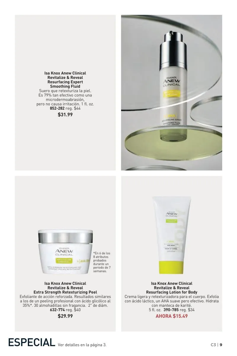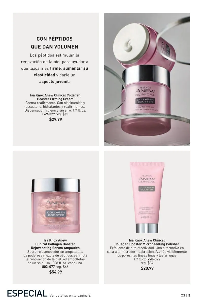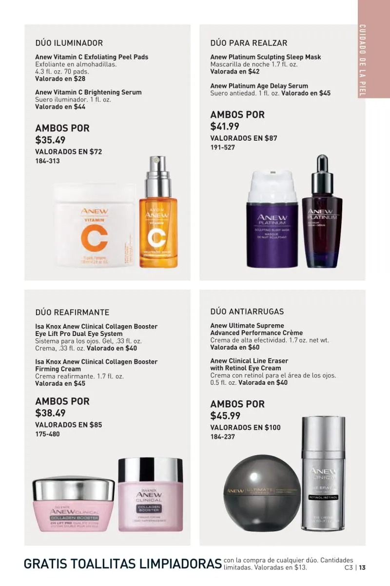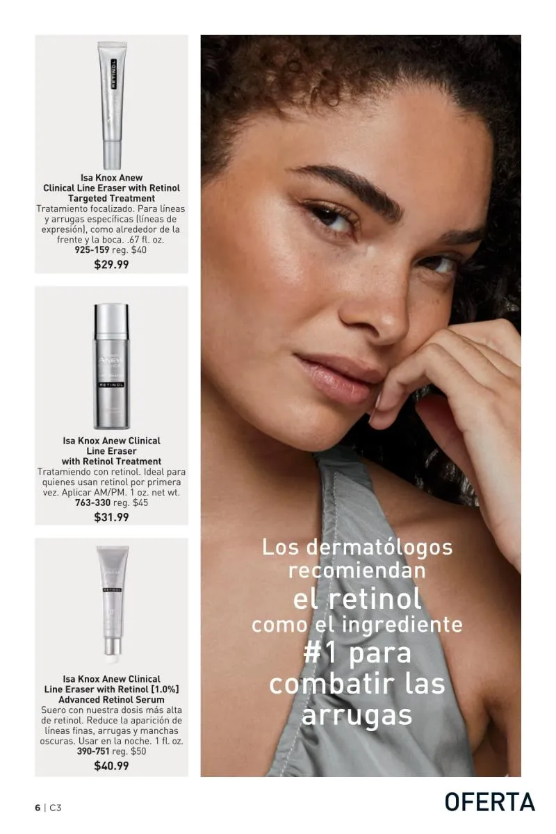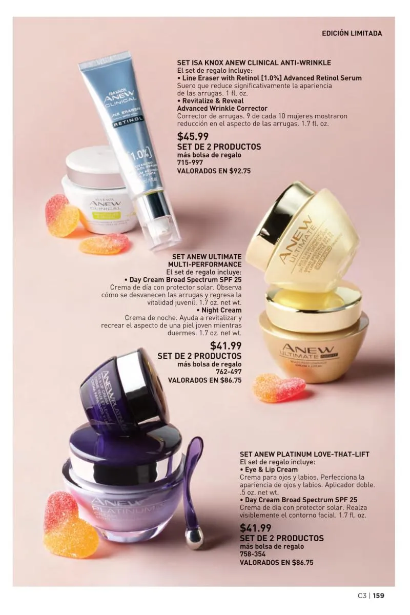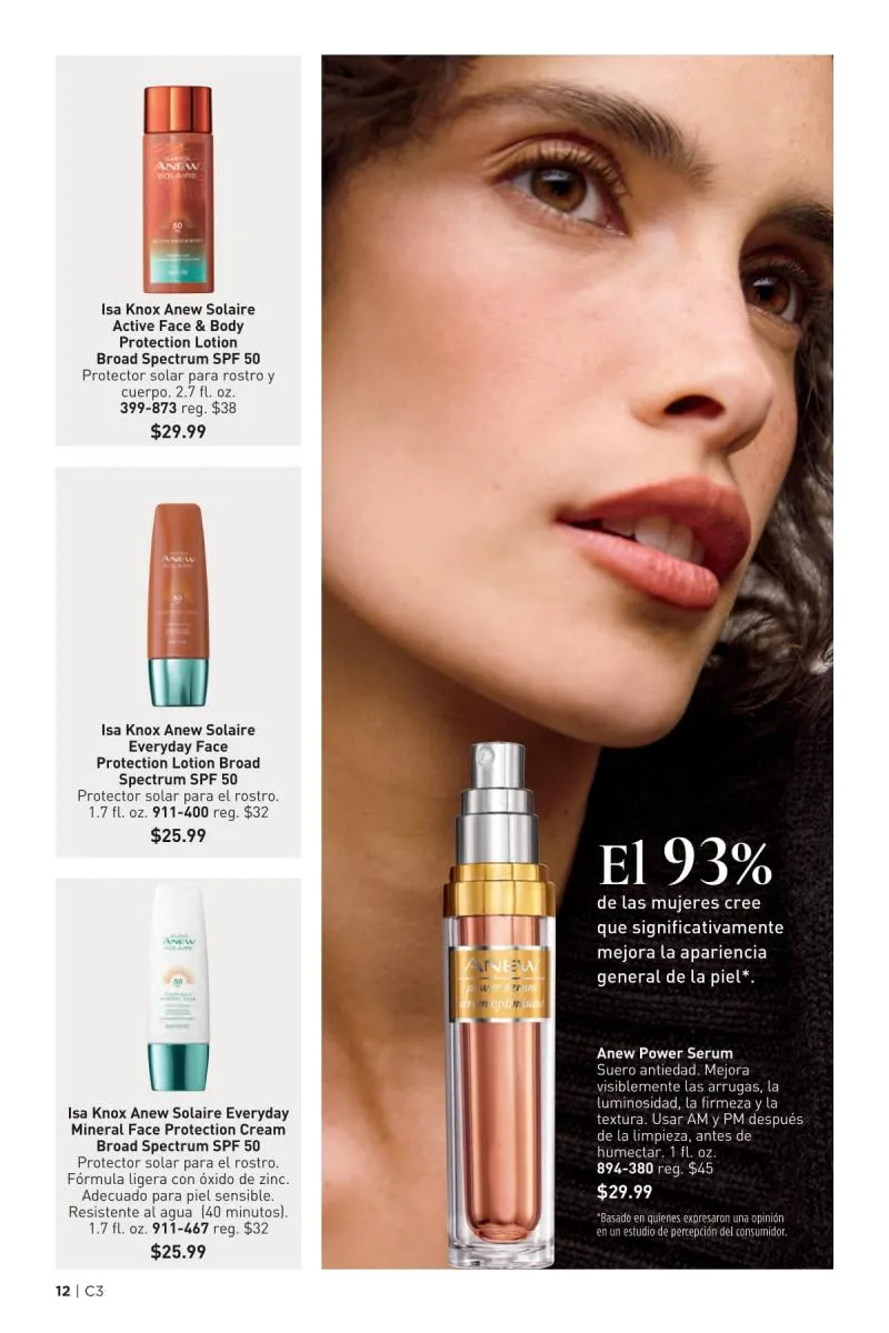 La última parte del catálogo Avon campaña 3 2026 Estados Unidos pdf está dedicada a la protección solar y a tratamientos antiedad de última generación. La línea Isa Knox Anew Solaire incluye protectores solares para rostro y cuerpo con amplio espectro SPF 50, formulados con óxido de zinc y texturas ligeras, aptas incluso para piel sensible. La resistencia al agua de hasta 40 minutos los convierte en una excelente opción para actividades al aire libre.