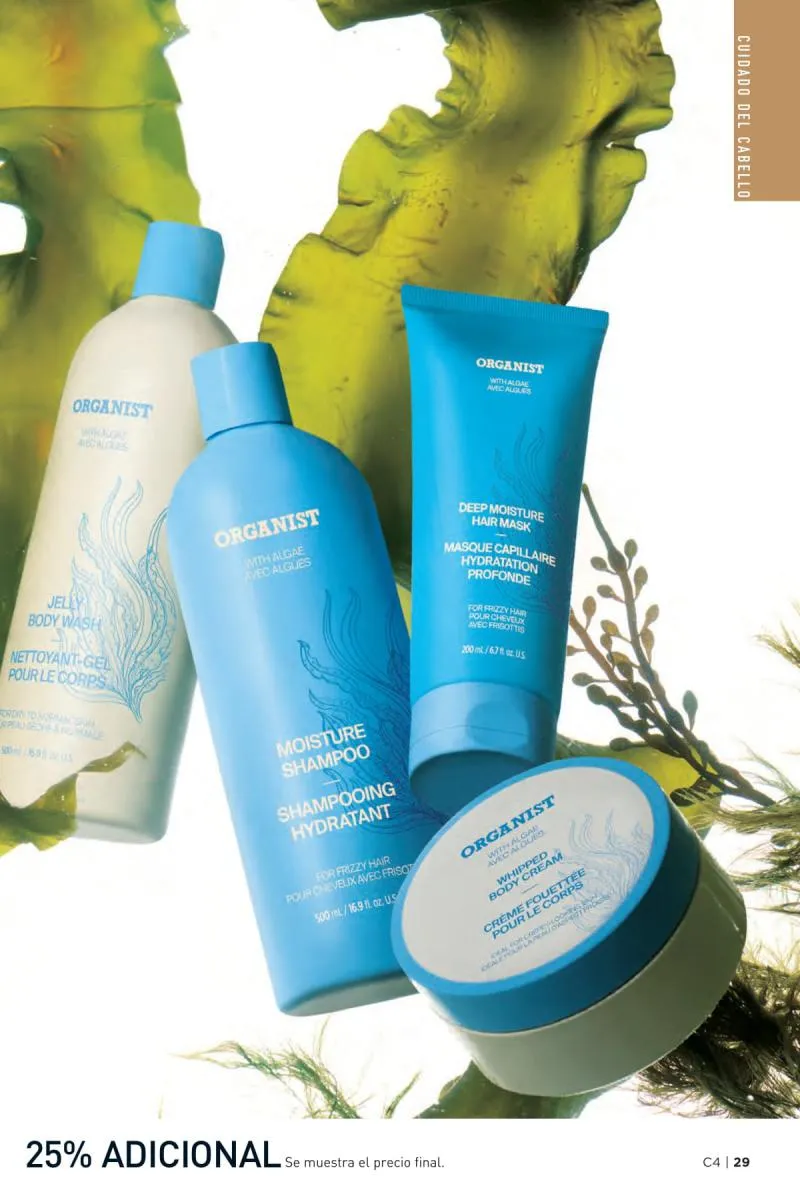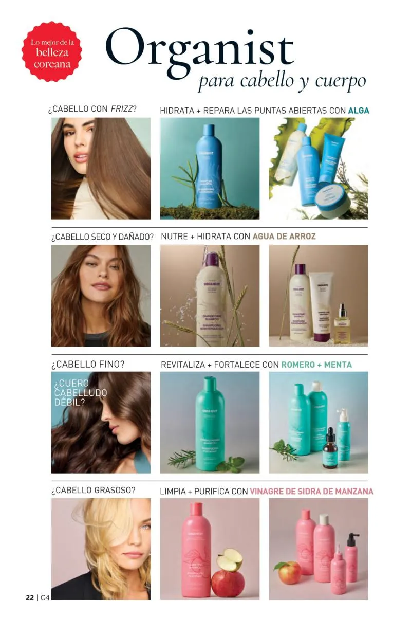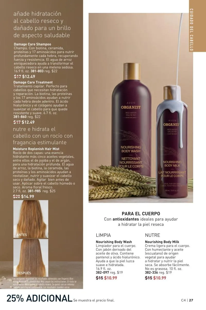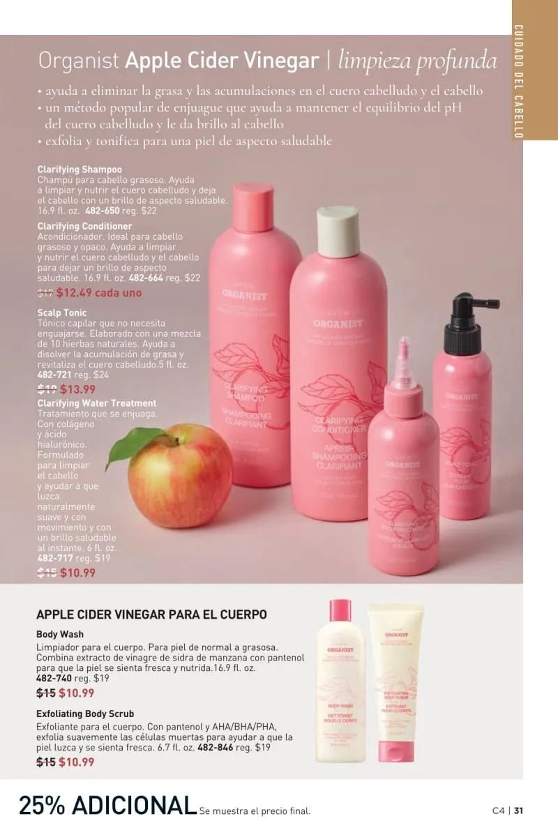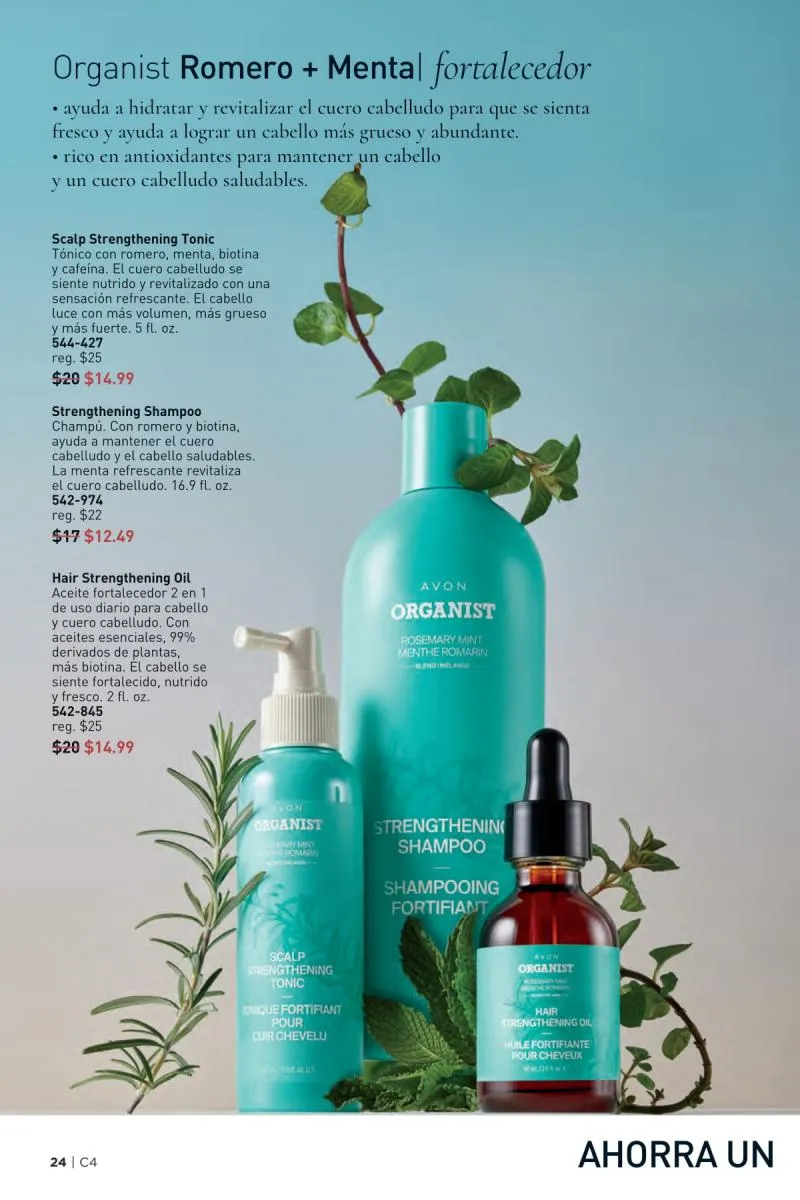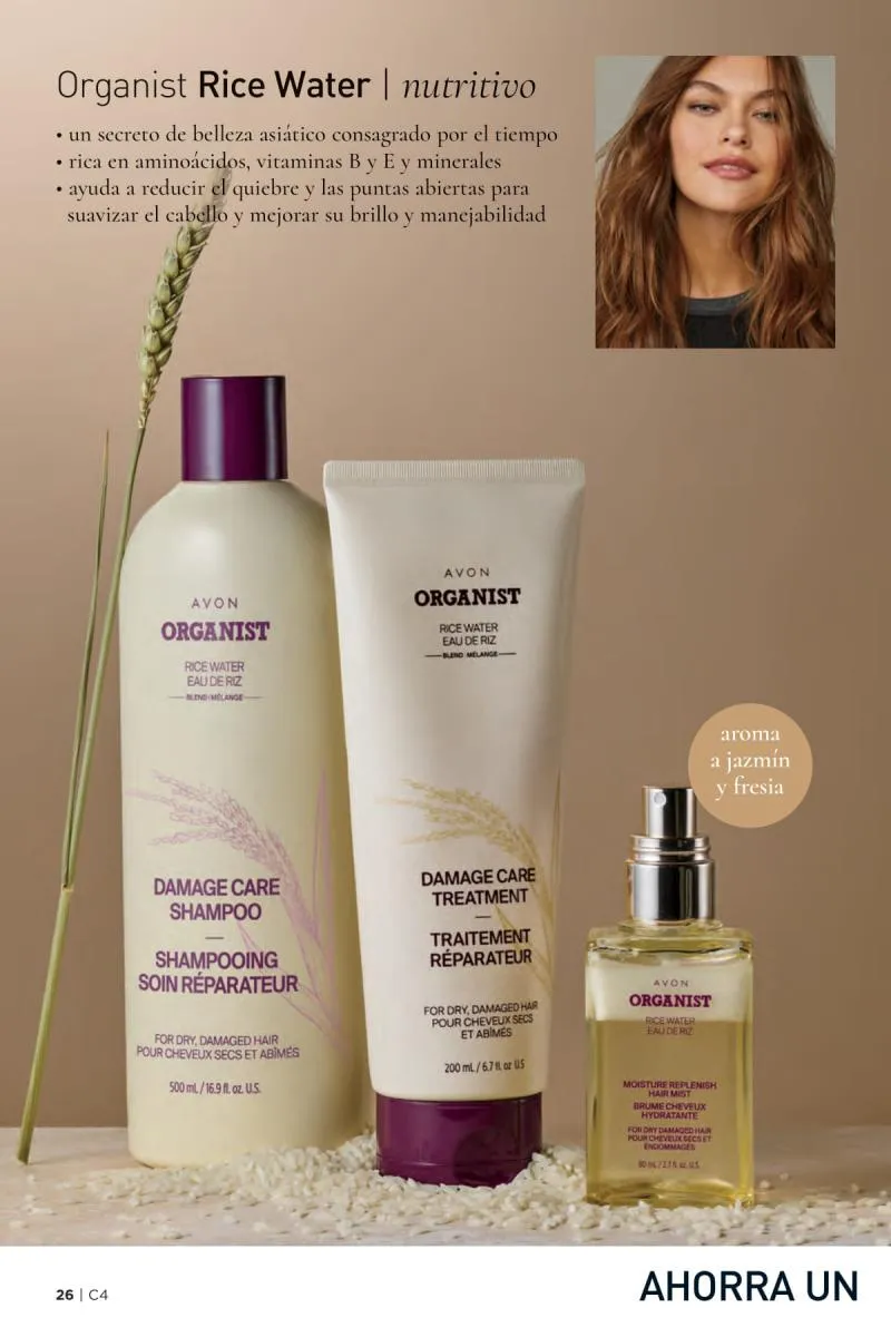 El catálogo Avon campaña 4 2026 Estados Unidos también presenta la línea capilar ORGANIST, una colección inspirada en ingredientes de origen natural como el agua de arroz, el romero, la menta y el vinagre de manzana. Esta propuesta se adapta a las distintas necesidades capilares, ya sea hidratación, fortalecimiento, o control del exceso de grasa.