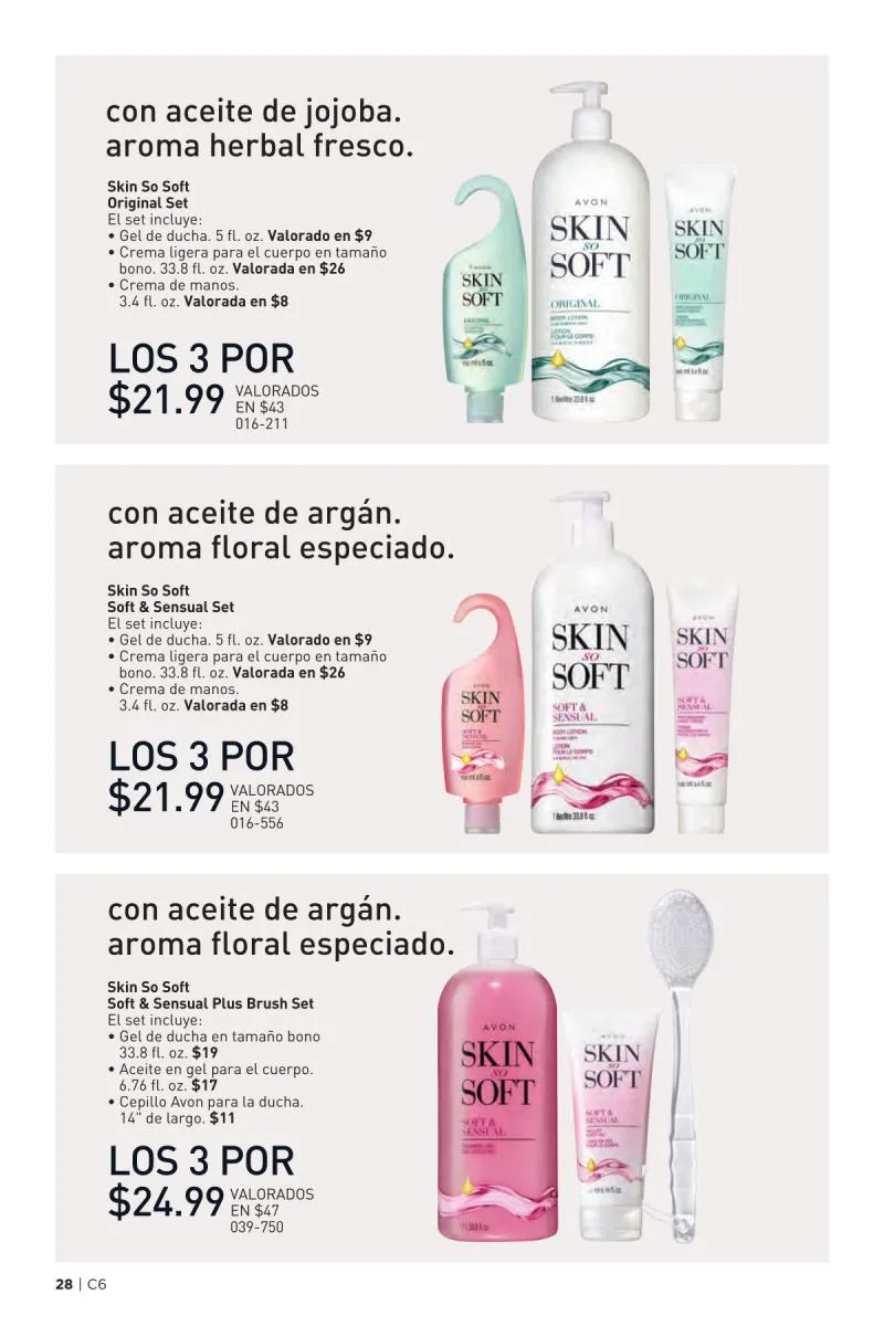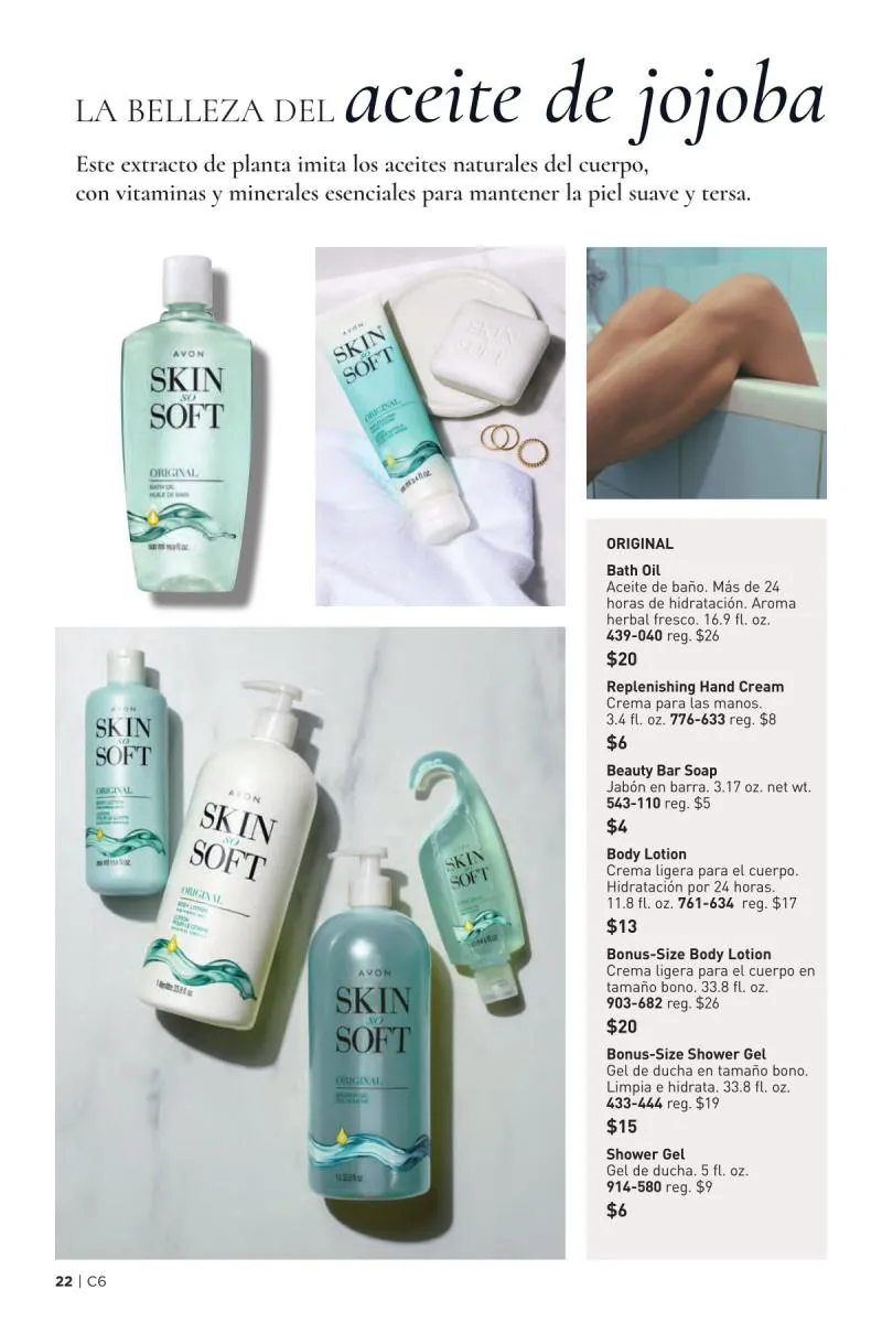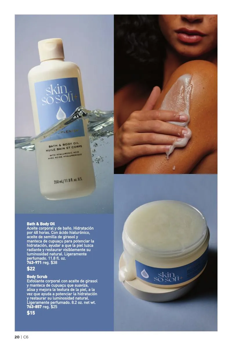 La sección final del catálogo está dedicada a los clásicos productos de la línea Skin So Soft Original, basada en el poder nutritivo del aceite de jojoba. Este extracto vegetal imita los aceites naturales del cuerpo, ayudando a restaurar la barrera cutánea, retener la humedad y dejar una sensación sedosa en la piel. Disponible en múltiples formatos aceite en gel, spray, crema corporal y jabón en barra esta colección ofrece opciones versátiles para todo tipo de necesidades.