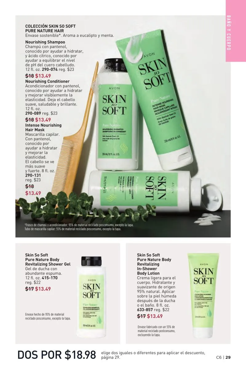 Dentro del catálogo Avon 6 2026 USA, la línea Skin So Soft Pure Nature se destaca por ofrecer una gama completa de productos para el cuidado de la piel y el cabello. Desde geles de ducha hasta lociones hidratantes, todos los productos están elaborados con ingredientes de origen vegetal, como eucalipto, menta, aceite de baobab y pantenol. Estas fórmulas están diseñadas para nutrir intensamente, sin comprometer la salud del cuerpo ni del planeta.
