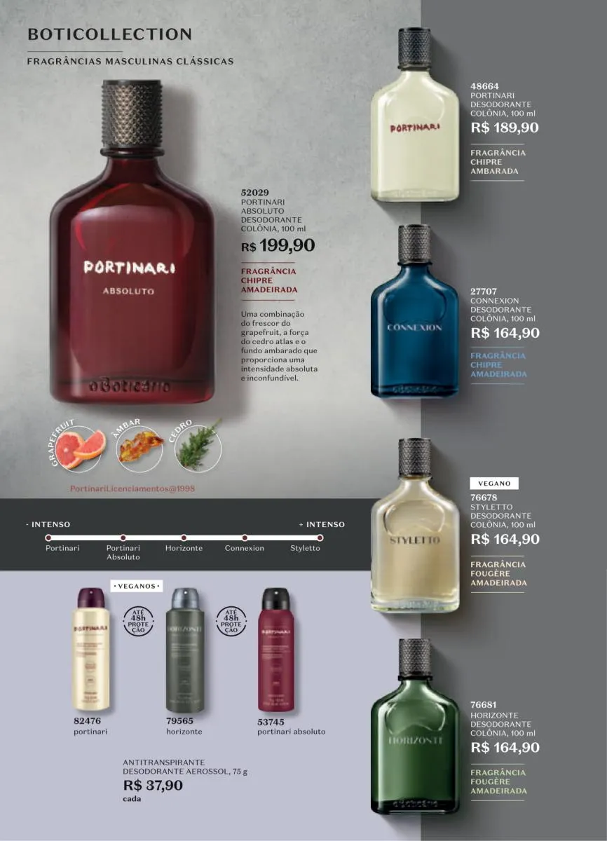 - Colônia Desodorante Portinari 100 ml fragrância cítrica amadeirada: notas cítricas de âmbar, musk e especiarias.
