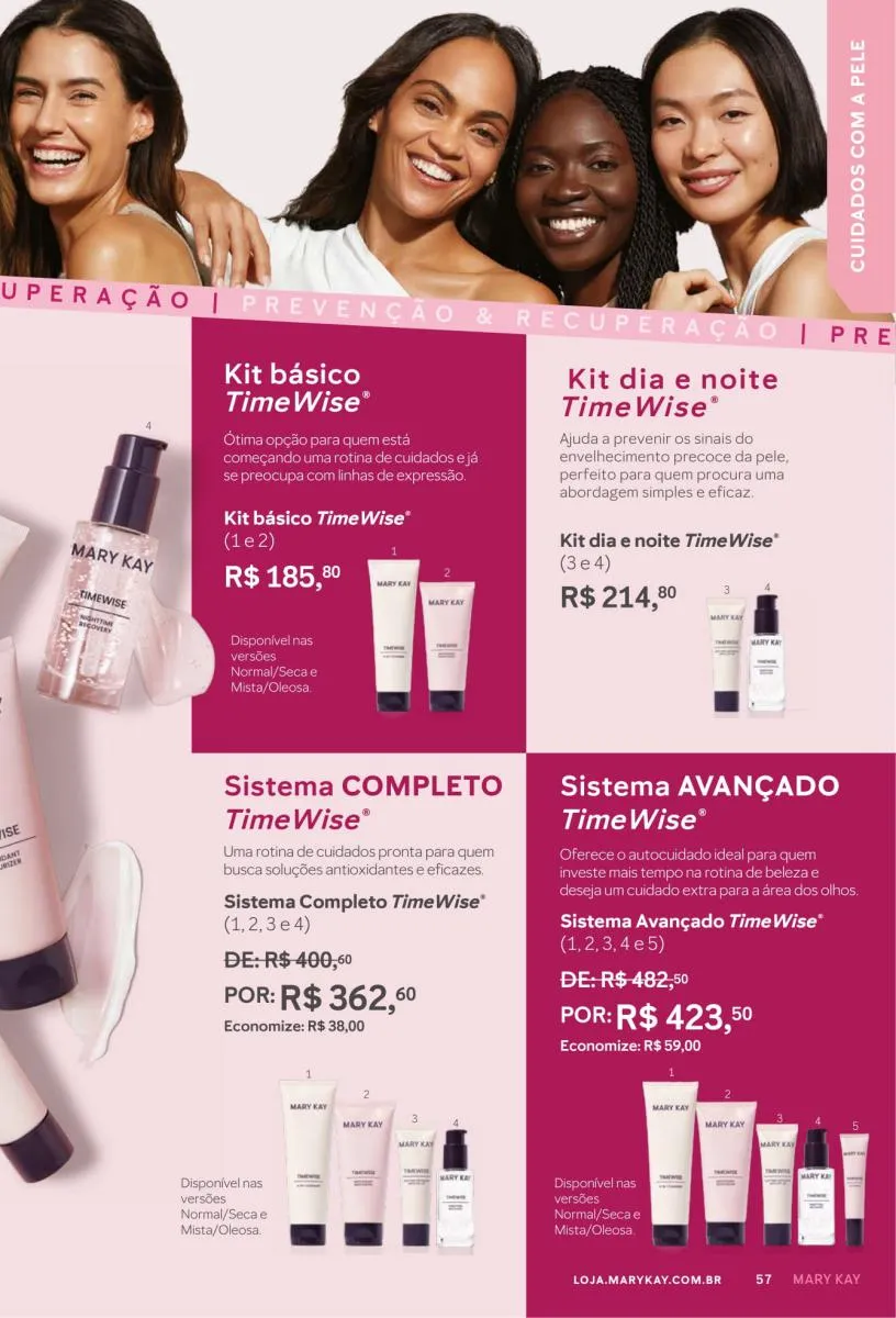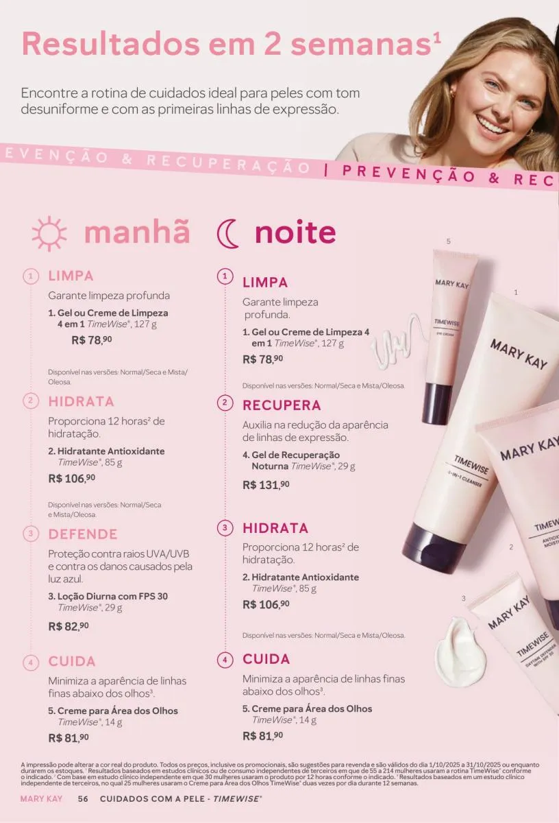 No catálogo Mary Kay Setembro 2025 Brasil você encontrará uma linha especializada no cuidado e restauração da pele, suaviza as linhas de expressão e restaura a elasticidade e firmeza de seu rosto após 4 semanas de uso, o Sistema TimeWise 3D defende seu rosto dos raios de luz, pois contém antioxidantes que lhe proporcionam múltiplos benefícios, para o envelhecimento e protege sua pele dos raios solares.