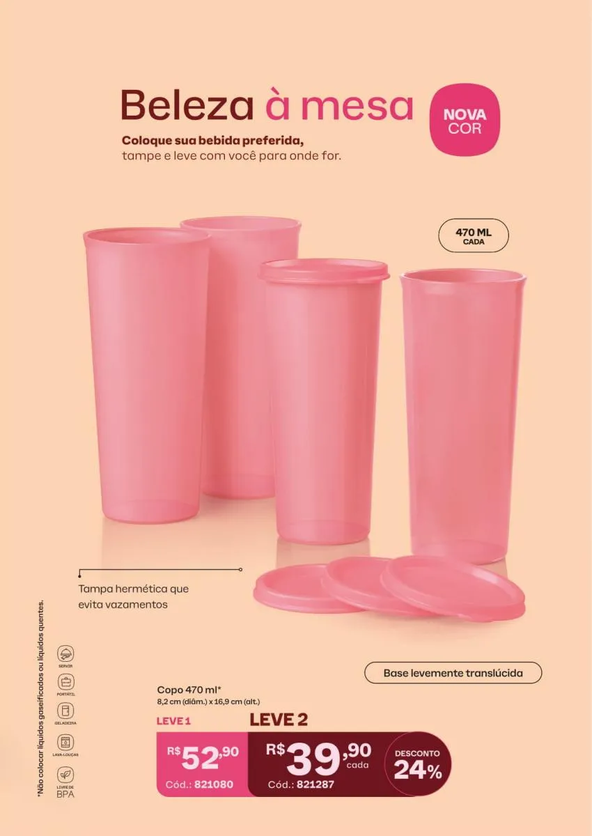 A proposta vai além da estética: todos os itens foram pensados para o uso diário. A tampa da jarra garante que a bebida permaneça fresca, e os copos são empilháveis, facilitando o armazenamento. Essa praticidade reflete o compromisso da Tupperware com soluções duradouras e sustentáveis.