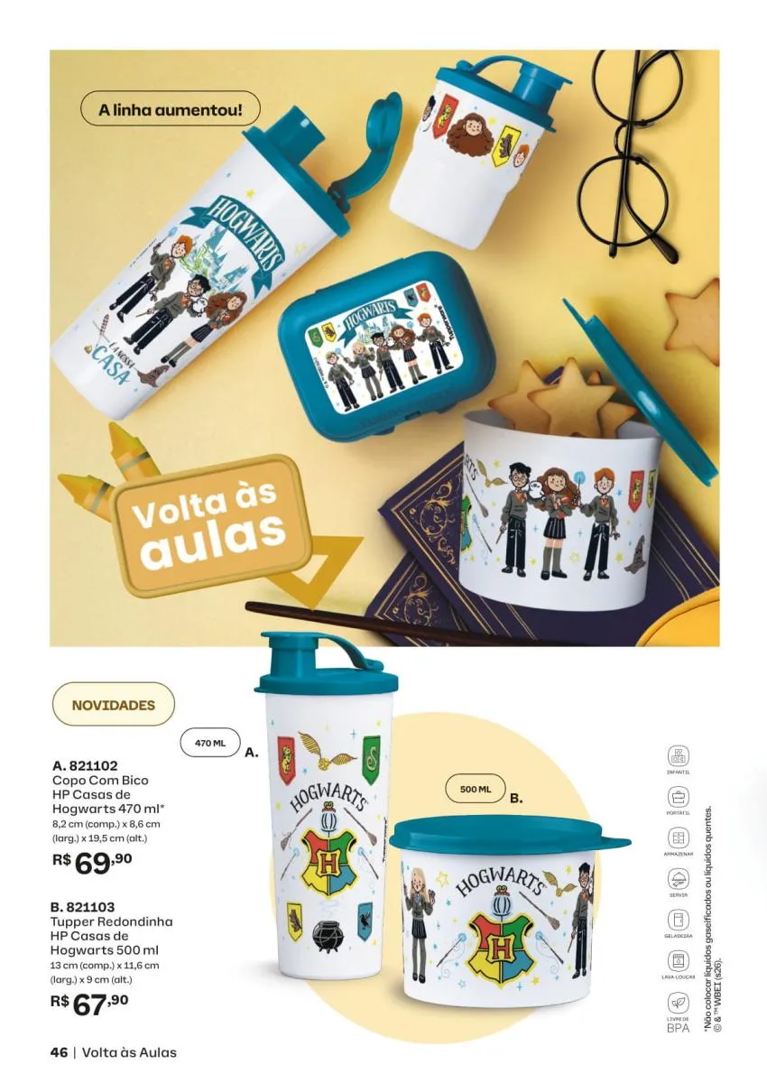 Além das tigelas, o vitrine 2 Tupperware 2026 traz itens complementares que harmonizam perfeitamente com a coleção floral. A jarra roxa translúcida é perfeita para sucos, águas aromatizadas ou chás gelados, combinando elegância com funcionalidade. Os copos na mesma paleta reforçam a unidade visual da coleção e são ideais para criar uma mesa posta harmoniosa.