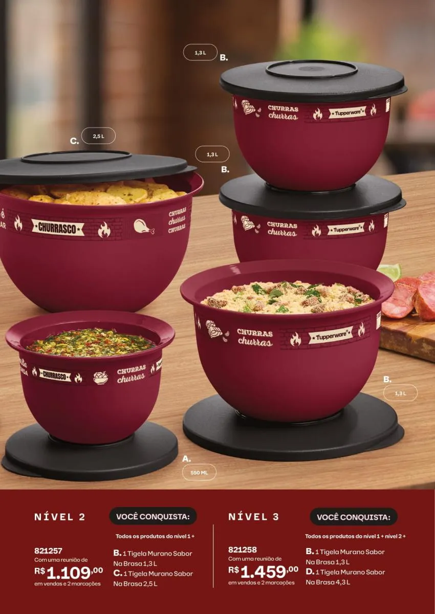 Um dos destaques desta edição do vitrine 2 Tupperware 2026 pdf são as tigelas Murano Flores ao Vento. Disponíveis em diferentes tamanhos (200 ml, 1,3 L, 2,5 L e 4,3 L), elas atendem desde porções individuais até grandes preparações para toda a família. Todas vêm com tampa prática, ideal para conservar alimentos frescos, proteger durante o transporte e manter a apresentação impecável.