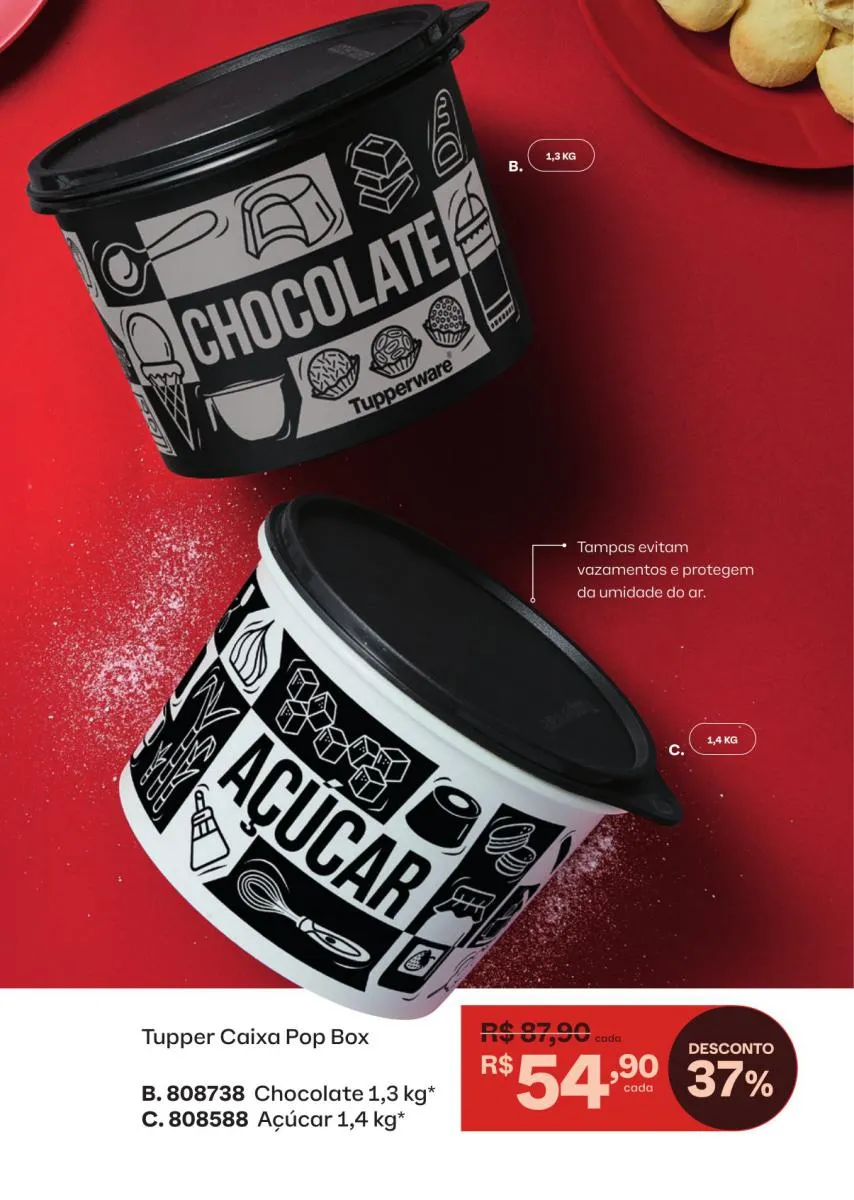 Complementando essa linha de armazenamento com identidade visual marcante, o catálogo traz a Caixa Açúcar Tupperware com tampa hermética e estampa floral delicada. Ideal para manter o açúcar soltinho e protegido da umidade, essa caixa é um verdadeiro clássico repaginado — com design funcional e estético. A versão ilustrada com elementos botânicos e cores suaves torna o momento de adoçar ainda mais prazeroso.