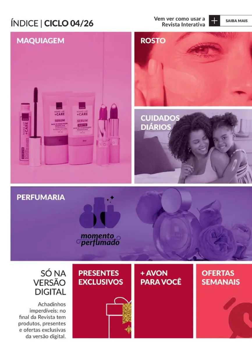 Sinta a maravilhosa essência do amor em todo o seu esplendor com o revista Avon ciclo 4 2026 PDF Brasil. Aproveite as novas ofertas de lançamento, descontos extraordinários em conjuntos de oferta e mega ofertas em produtos e fragrâncias para toda a família com a excelência da qualidade Avon.