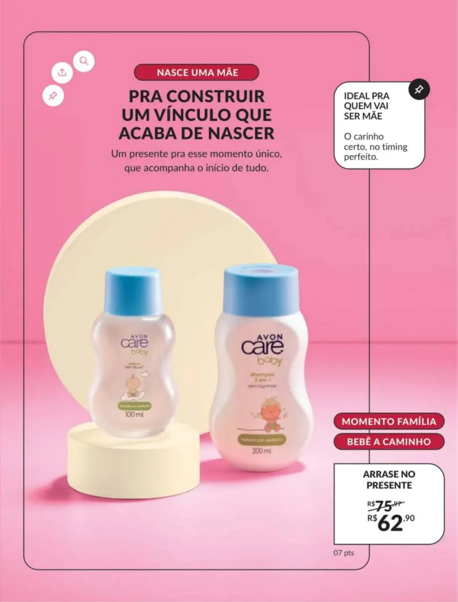 Mime a pele de seu bebê para mantê-lo sempre macio e hidratado com produtos Care Baby Care da Avon; disponível no revista Avon 5 2026 pdf Brasil, projetado para sua pele delicada.