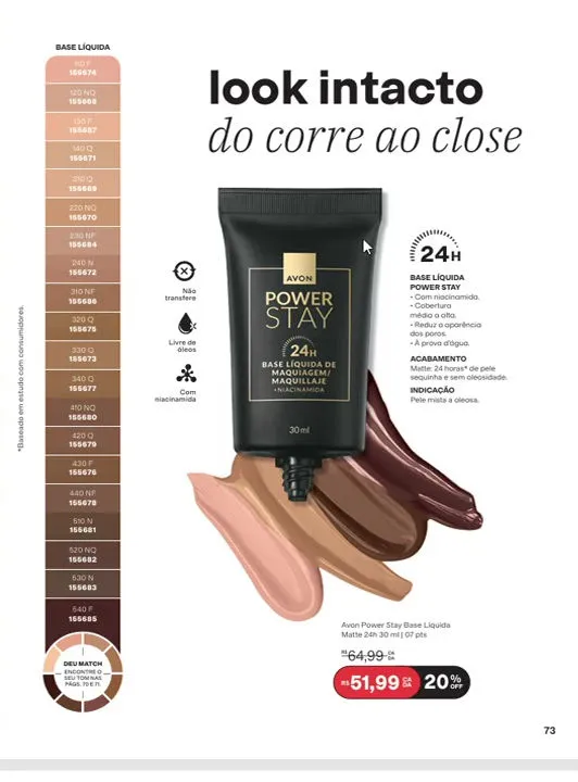 - O novo Avon Power Stay Base Compacta Refil; adapta-se à superfície de sua pele deixando uma camada lisa com um efeito natural por até 18 horas, ideal para peles mista, secas ou madura 9 g.