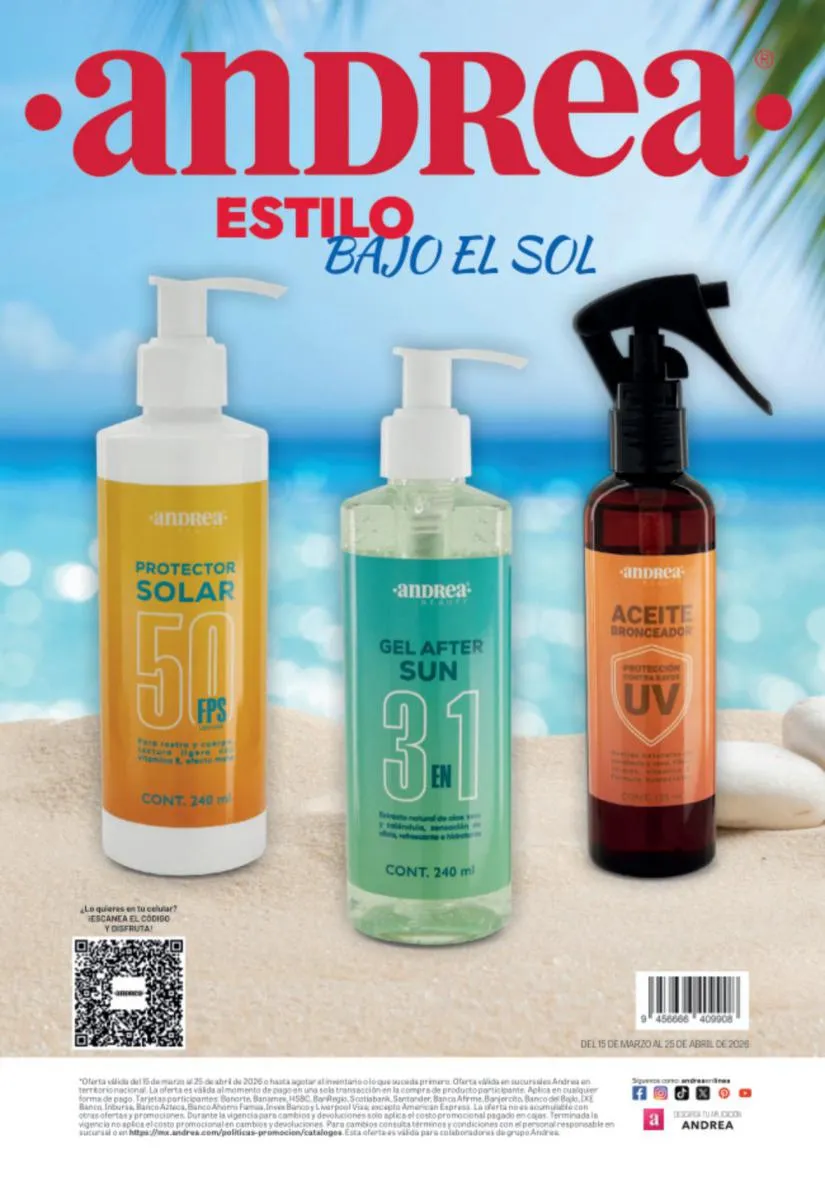 No te olvides de defender tu piel en los momentos de sol extremo y utiliza los productos con vitamina C que Andrea Summer Time tiene para ti. Consigue hidratación, firmeza, protege tu piel con prebióticos, y desvanece líneas de expresión con las cremas de cuidado facial que este catálogo Andrea Imperdibles de Vacaciones 2026 te ofrece.