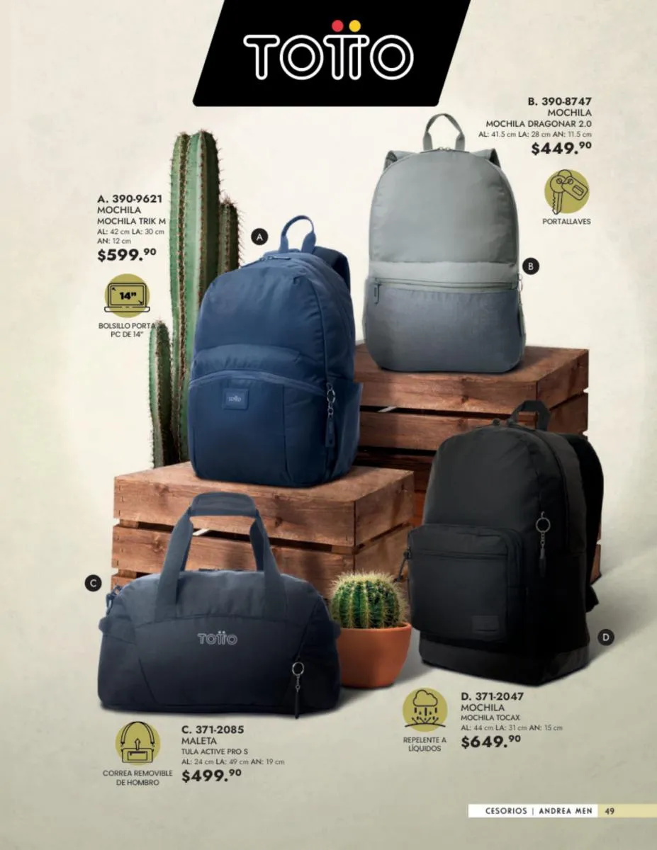 Los bolsos de Andrea te brindan una calidad superior porque están hechos de pieles y pensados para obtener un estilo espectacular. Las últimas tendencias en moda están en estos bolsos que te permitirán llevar todo lo que necesitas este catálogo Andrea Bolsos Accesorios Primavera 2026 y estar preparada para todo. Además, los colores más trendy, como el verde o el azul, están aquí. Tampoco puedes dejar de lado las cangureras y bandoleras para looks más específicos. Y las mochilas son un must del que no puedes quedar afuera, todos los colores y texturas que desees lo consigues en este actálogo. Crea los mejores moods veraniegos que más te representen y sentite cómodo a toda hora.