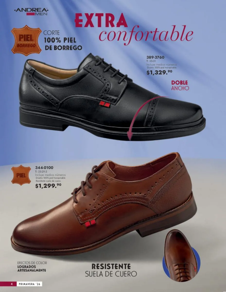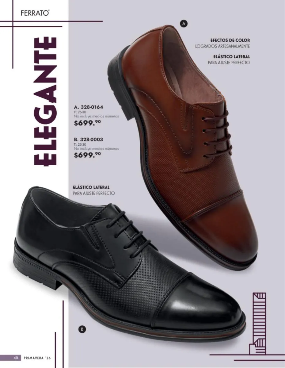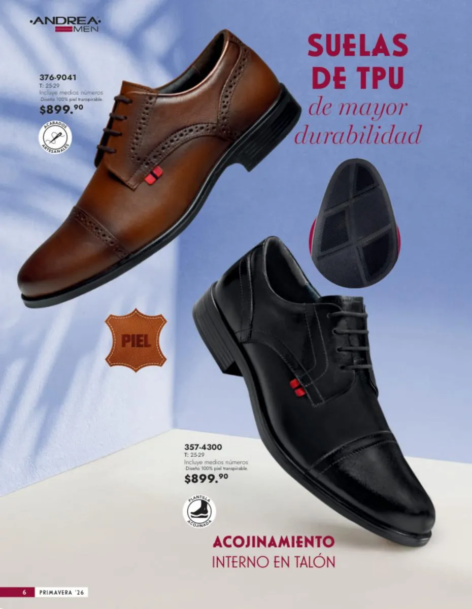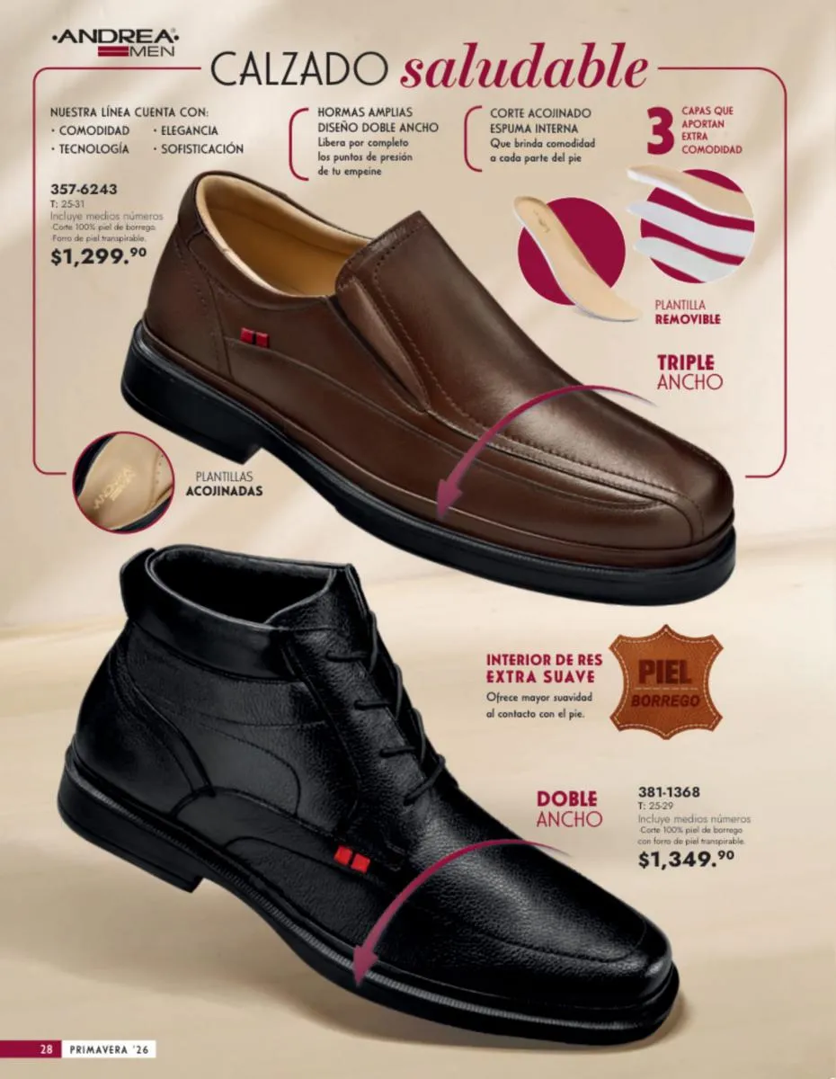 El calzado de vestir en catálogo Andrea Calzado Caballero Primavera 2026 México es primordial y no escatima en ningún elemento que mejore tu postura y tus caminatas. Además, ofrece texturas y colores únicos ya que son logrados artesanalmente para tener los modelos más destacados en este Primavera. Si deseas lucirte al máximo, utiliza la línea Ferrato High Level para alcanzar los mejores looks en todo momento.