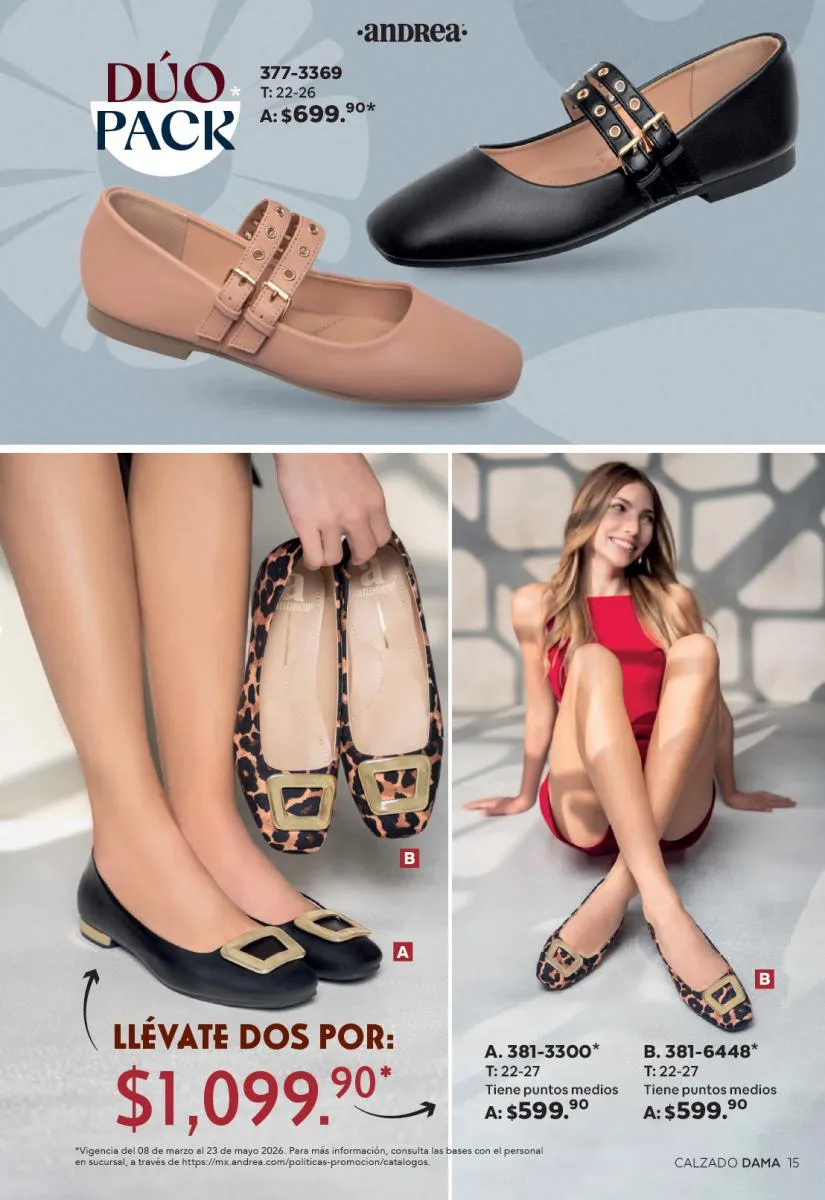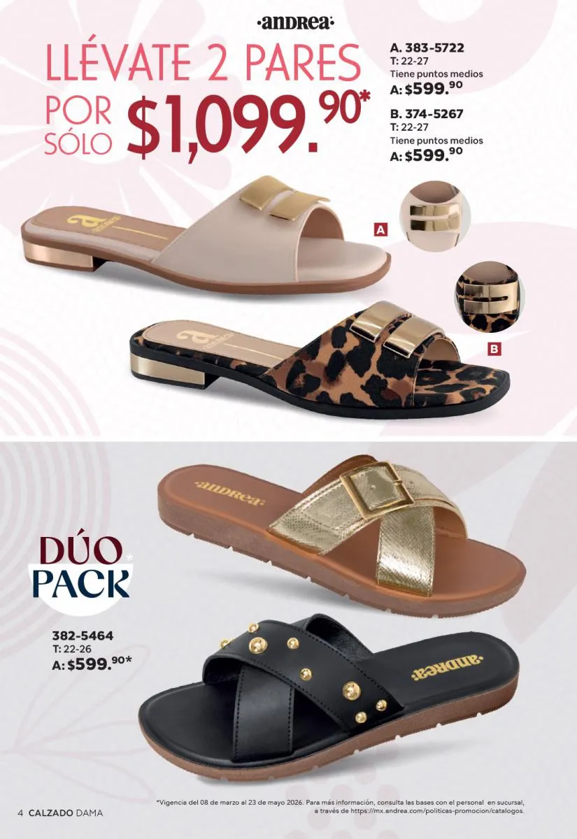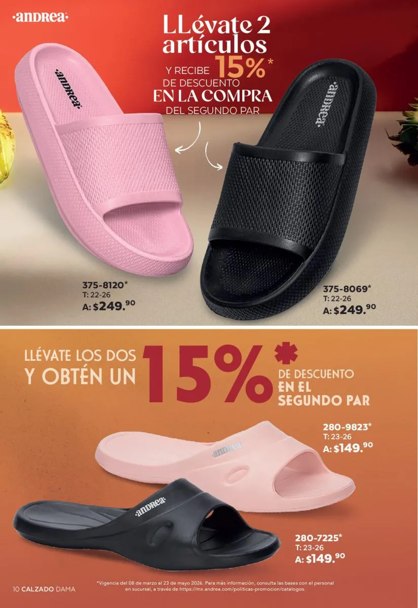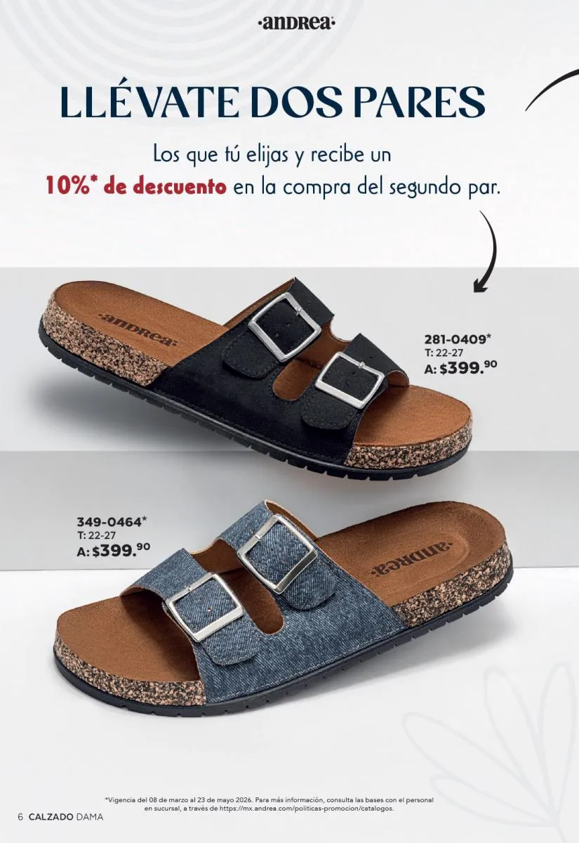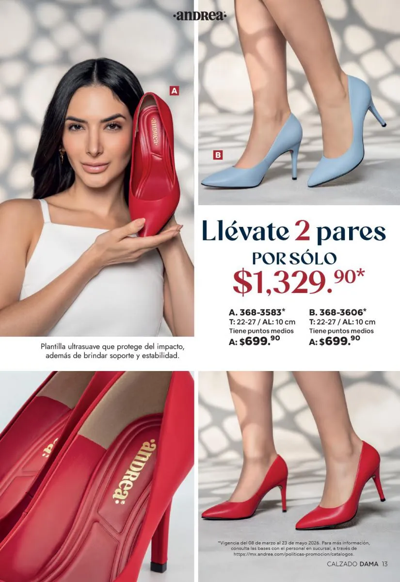 Una de las secciones más atractivas del Catálogo Andrea Combos de Primavera 2026 es, sin duda, la de calzado para dama. Aquí destacan sandalias, botines, zapatos de tacón y flats diseñados para brindar comodidad sin sacrificar el estilo.