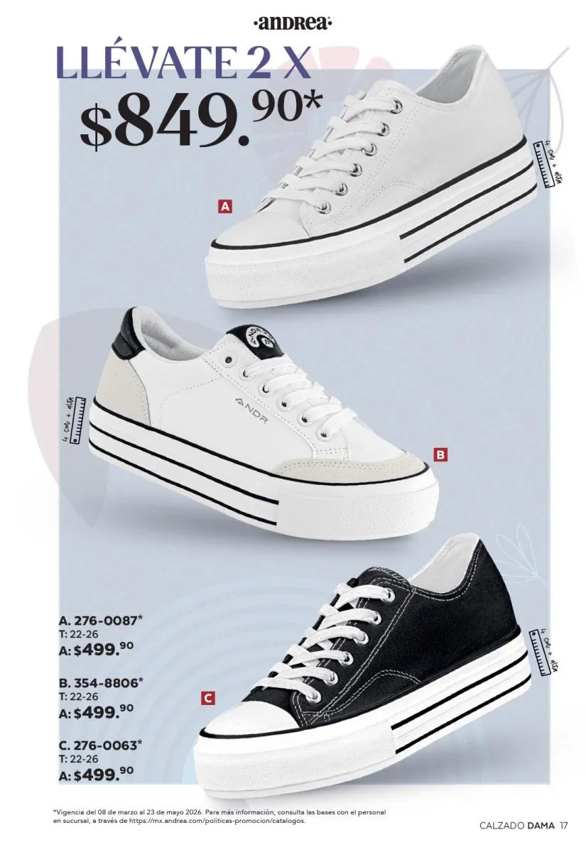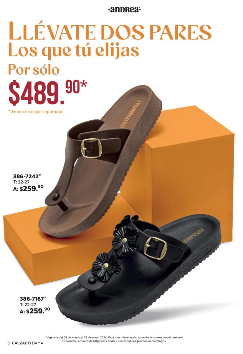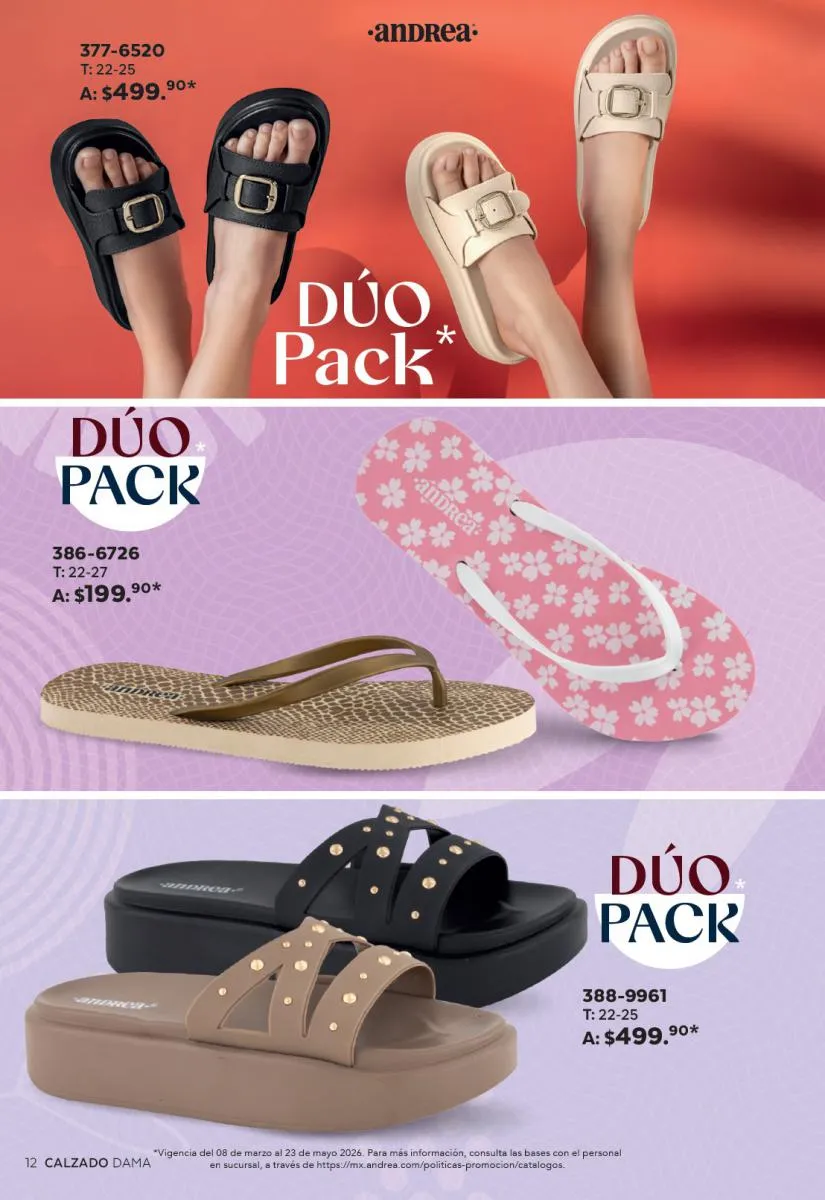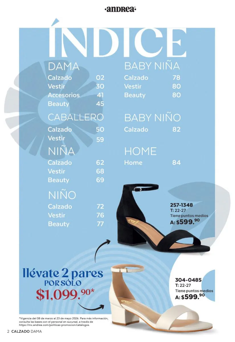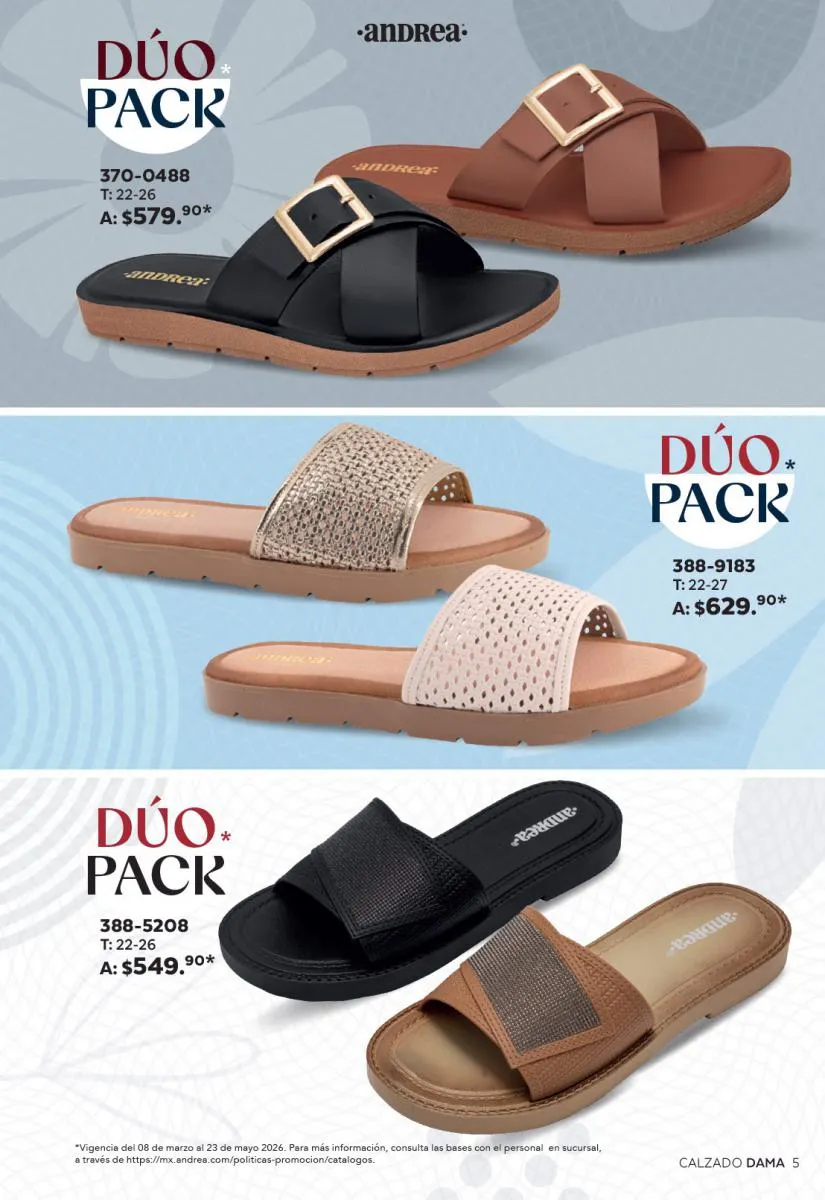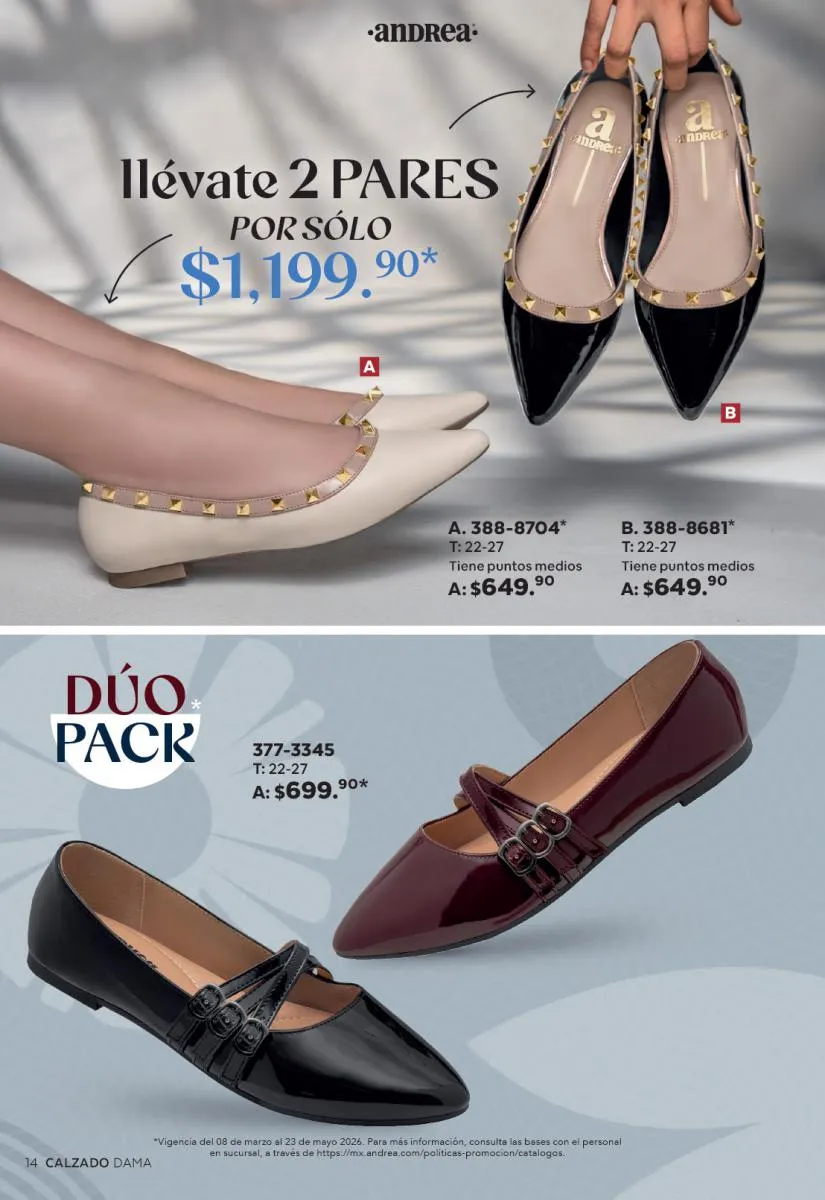 Una de las secciones más atractivas del Catálogo Andrea Combos de Primavera 2026 es, sin duda, la de calzado para dama. Aquí destacan sandalias, botines, zapatos de tacón y flats diseñados para brindar comodidad sin sacrificar el estilo.
