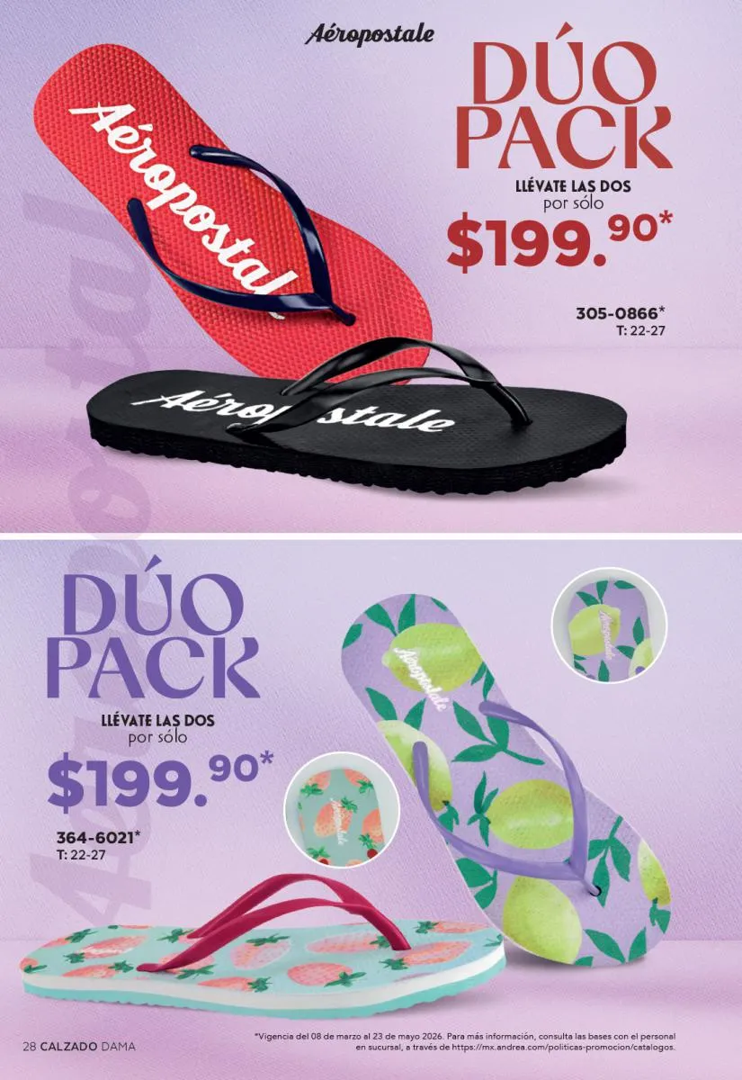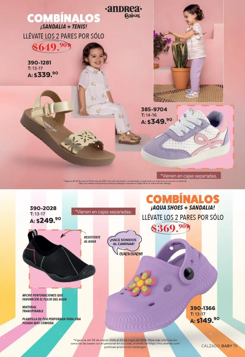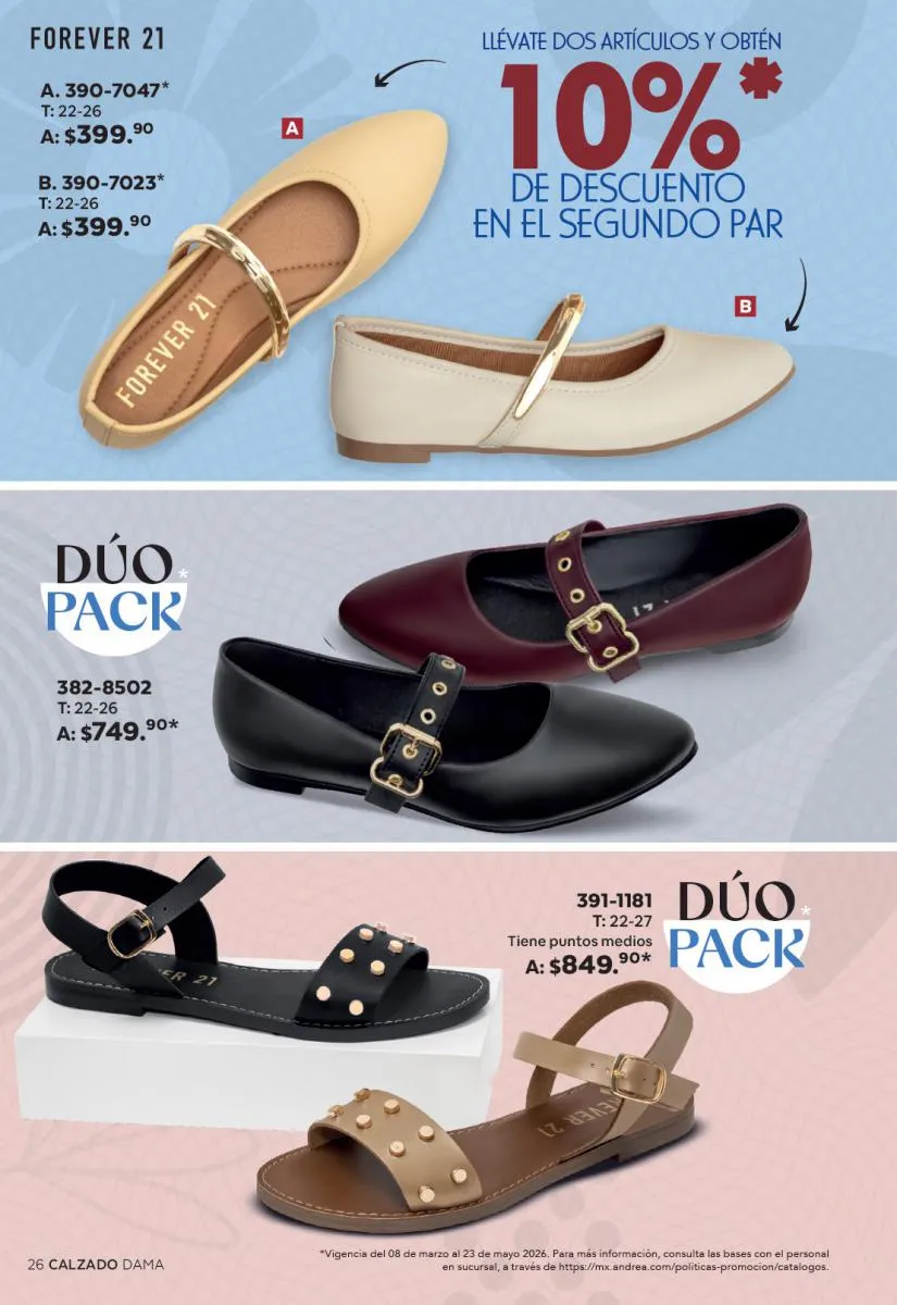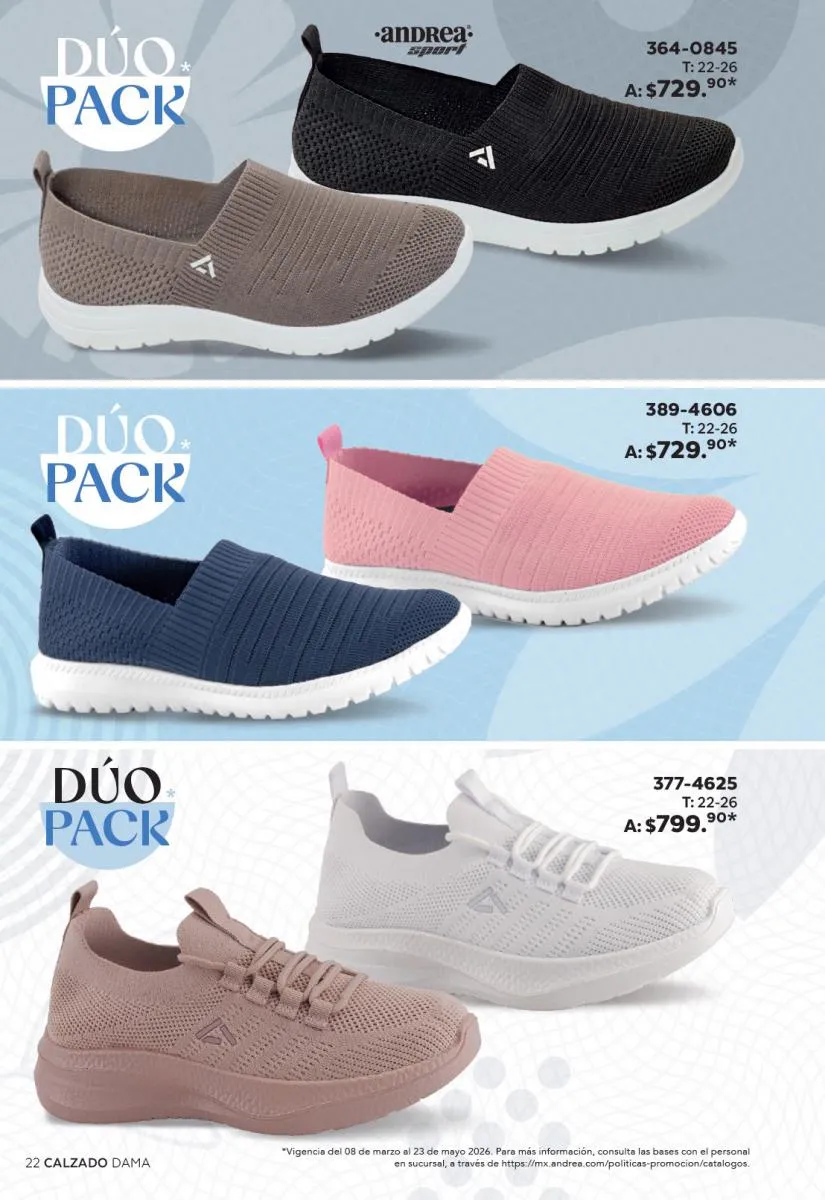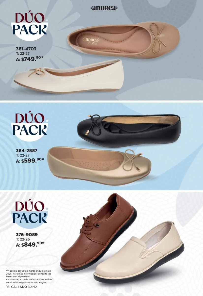 Una de las secciones más atractivas del Catálogo Andrea Combos de Primavera 2026 es, sin duda, la de calzado para dama. Aquí destacan sandalias, botines, zapatos de tacón y flats diseñados para brindar comodidad sin sacrificar el estilo.