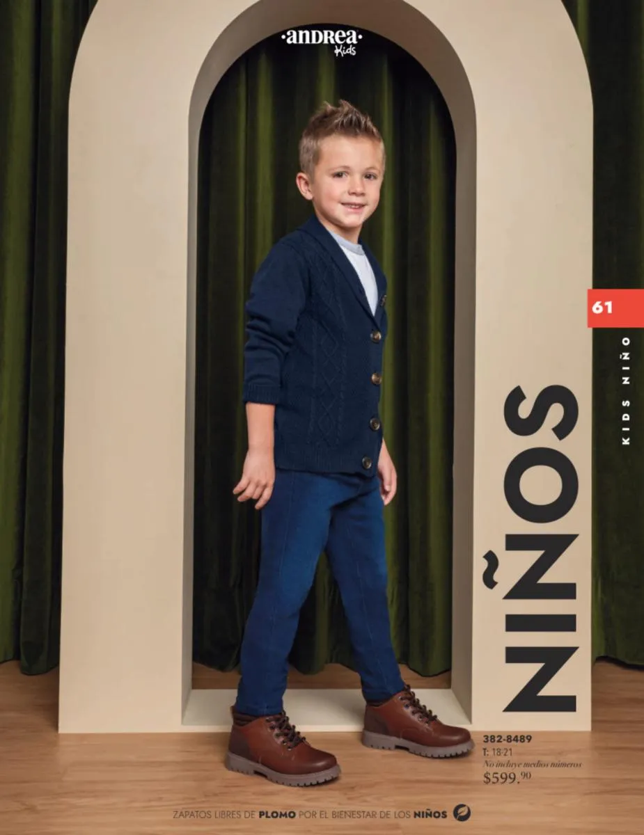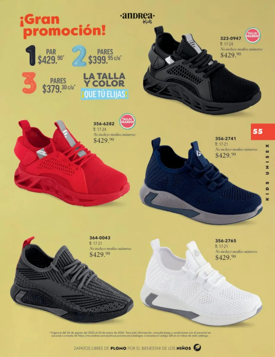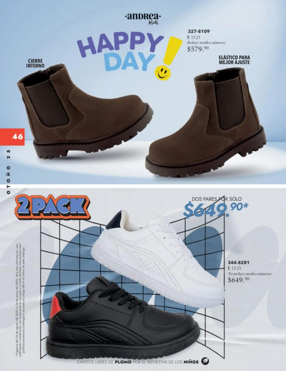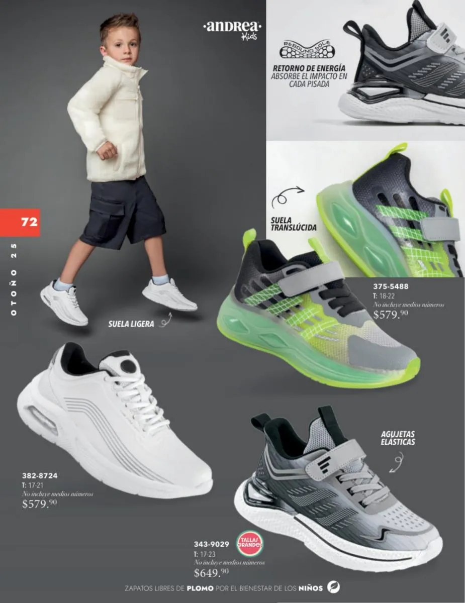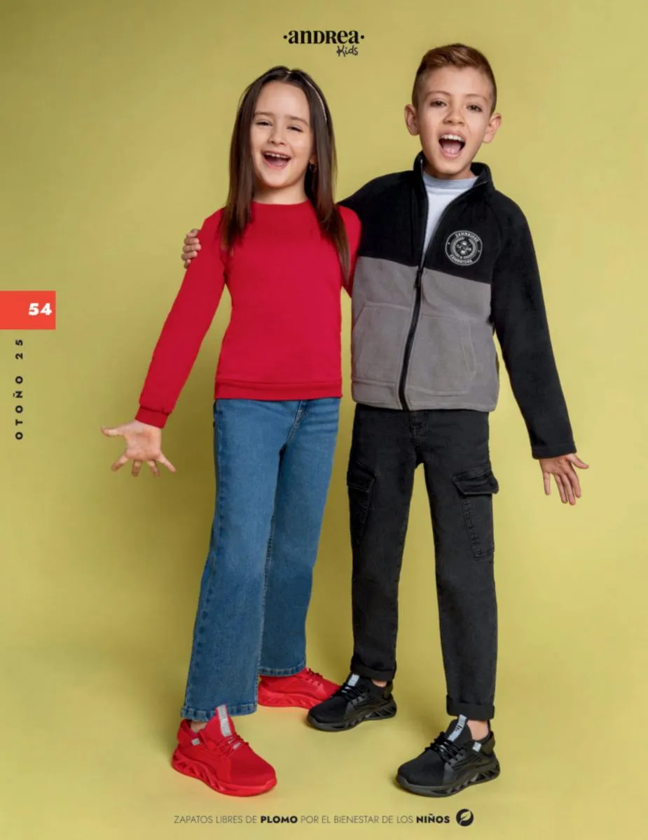 El calzado deportivo para los niños no podía dejar de tener su excelente presencia en esta catálogo Andrea Infantil otoño 2025 México. Modelos muy trendy, resistentes y con diseños –y hasta luces- que van con todo tipo de atuendos.
