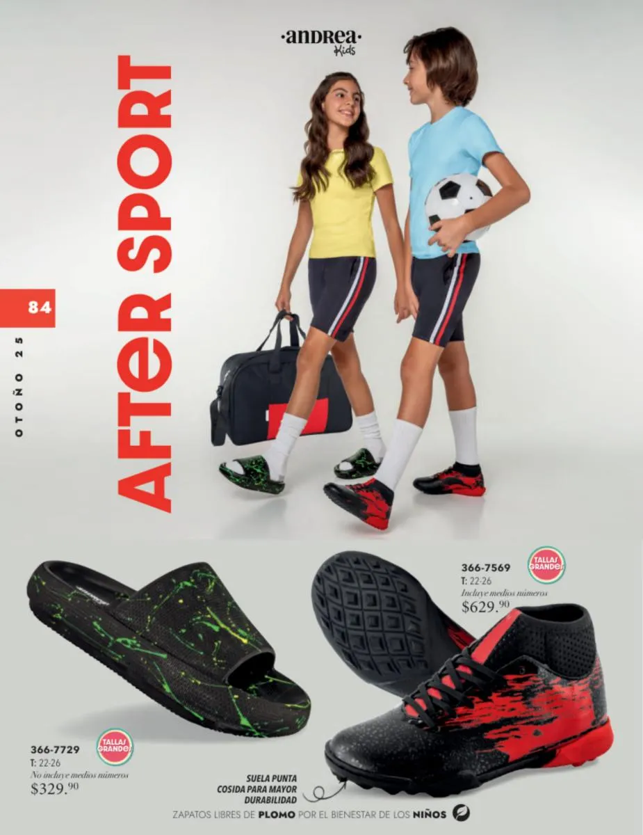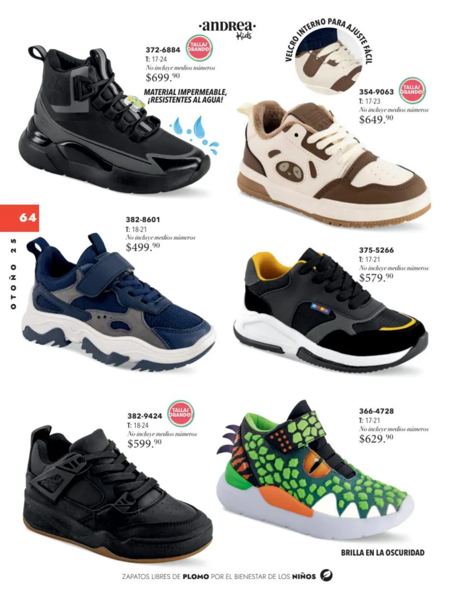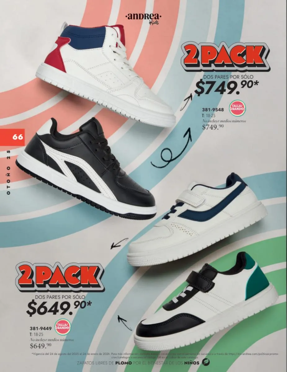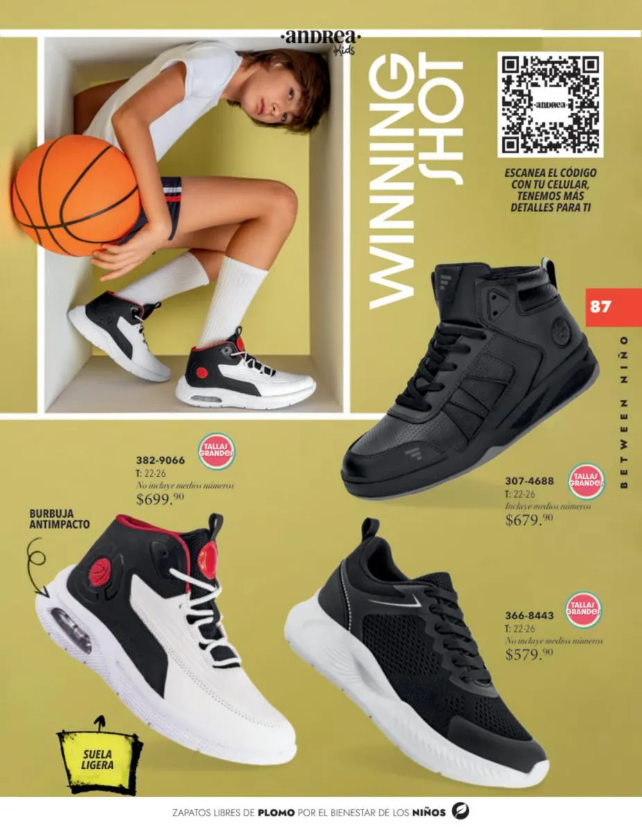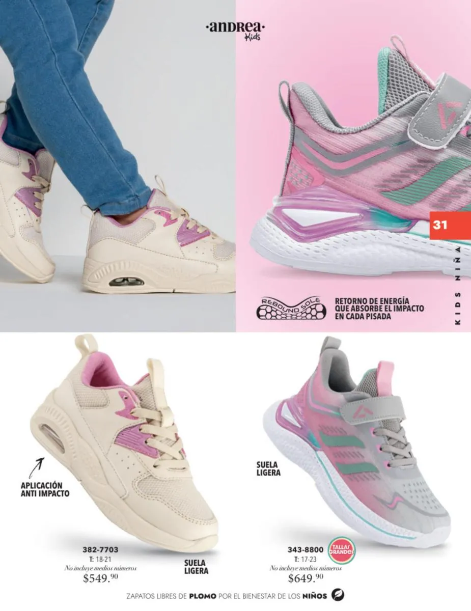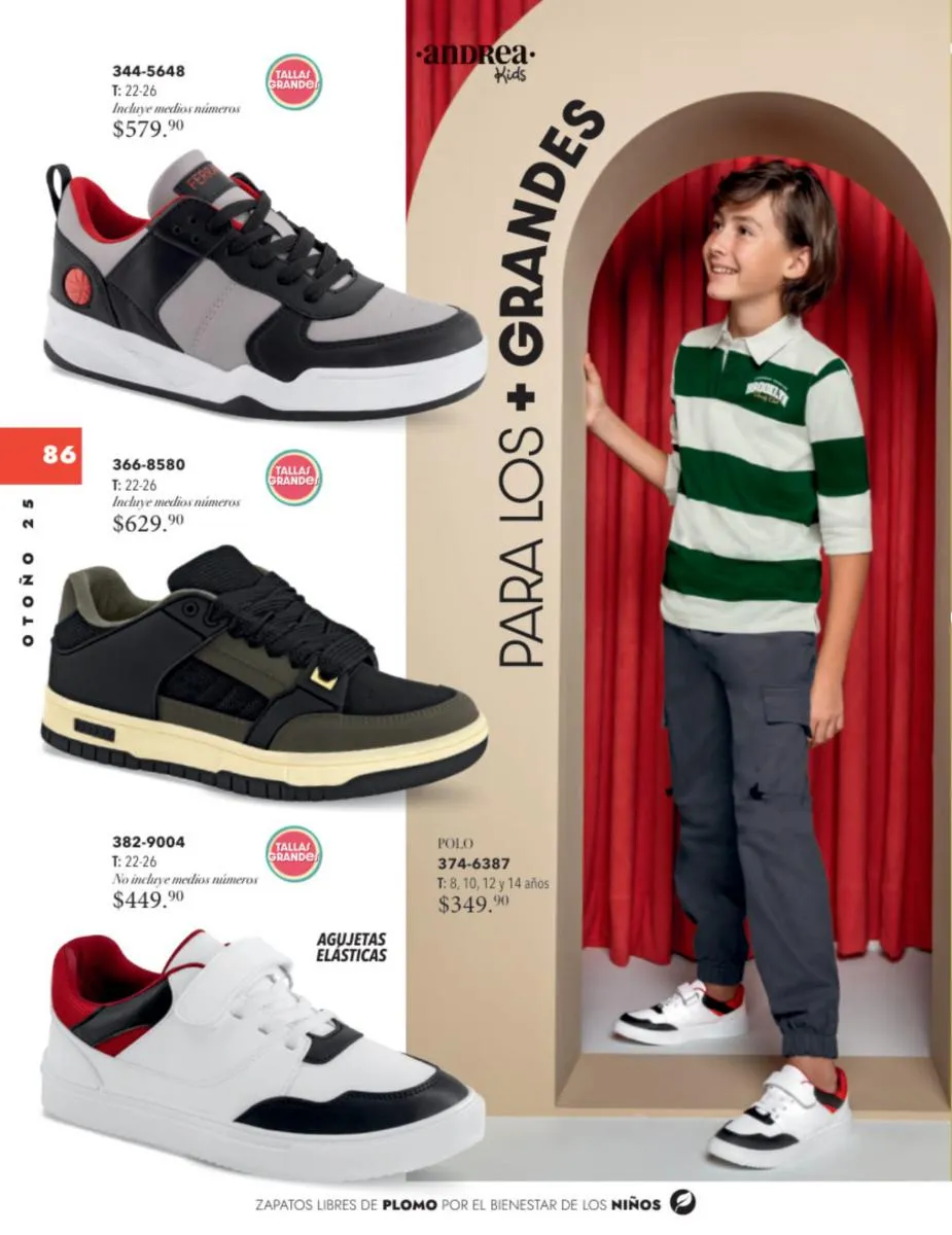 El calzado deportivo para los niños no podía dejar de tener su excelente presencia en esta catálogo Andrea Infantil otoño 2025 México. Modelos muy trendy, resistentes y con diseños –y hasta luces- que van con todo tipo de atuendos.