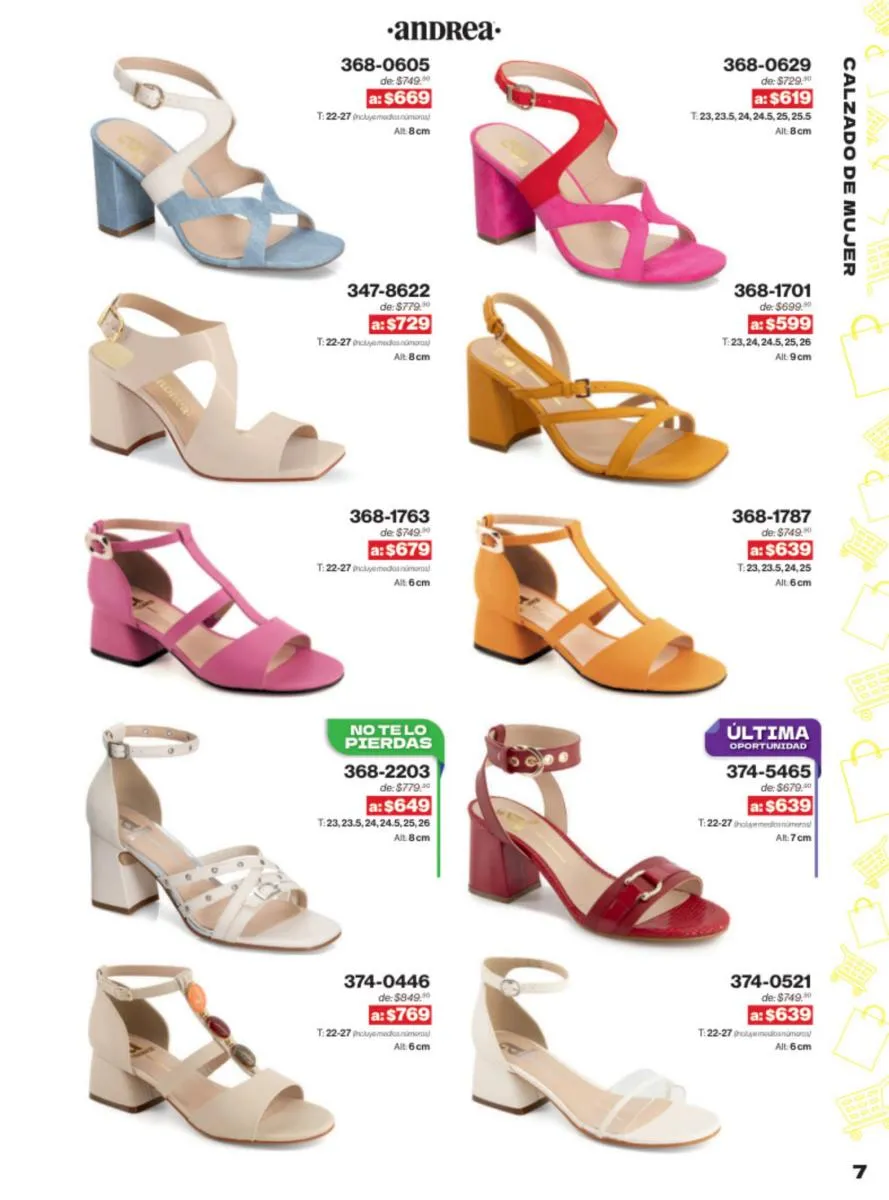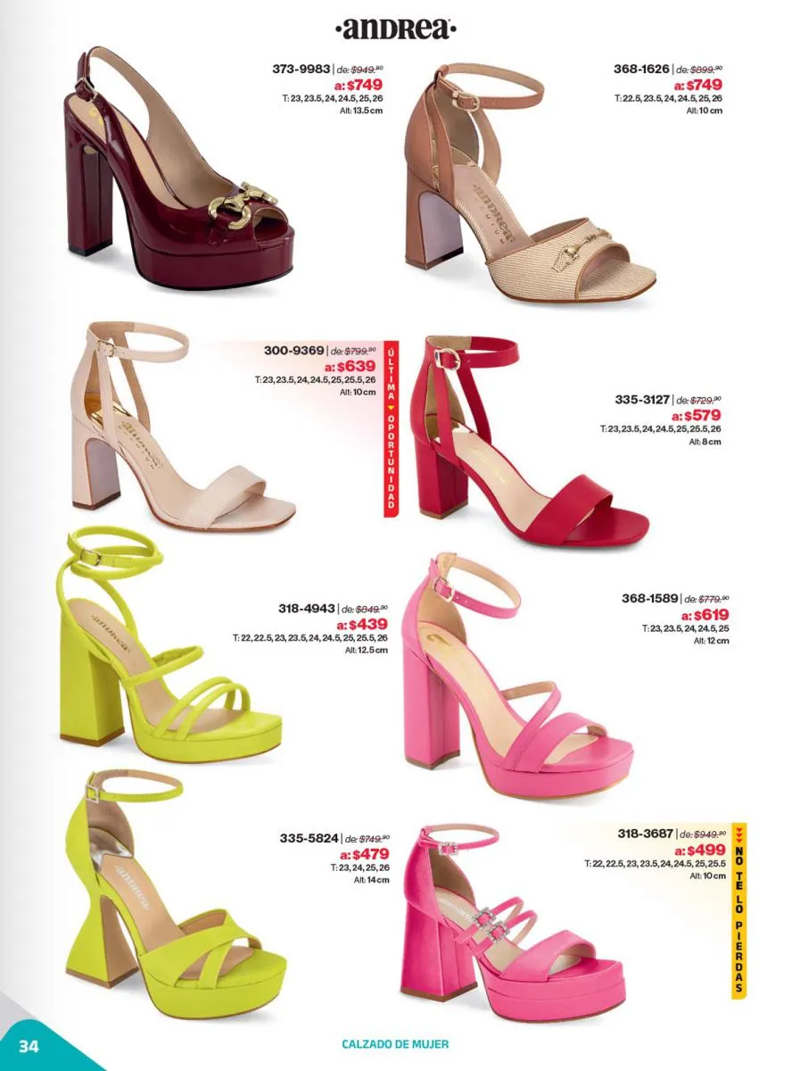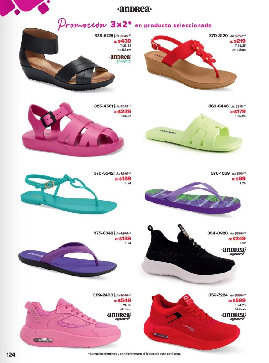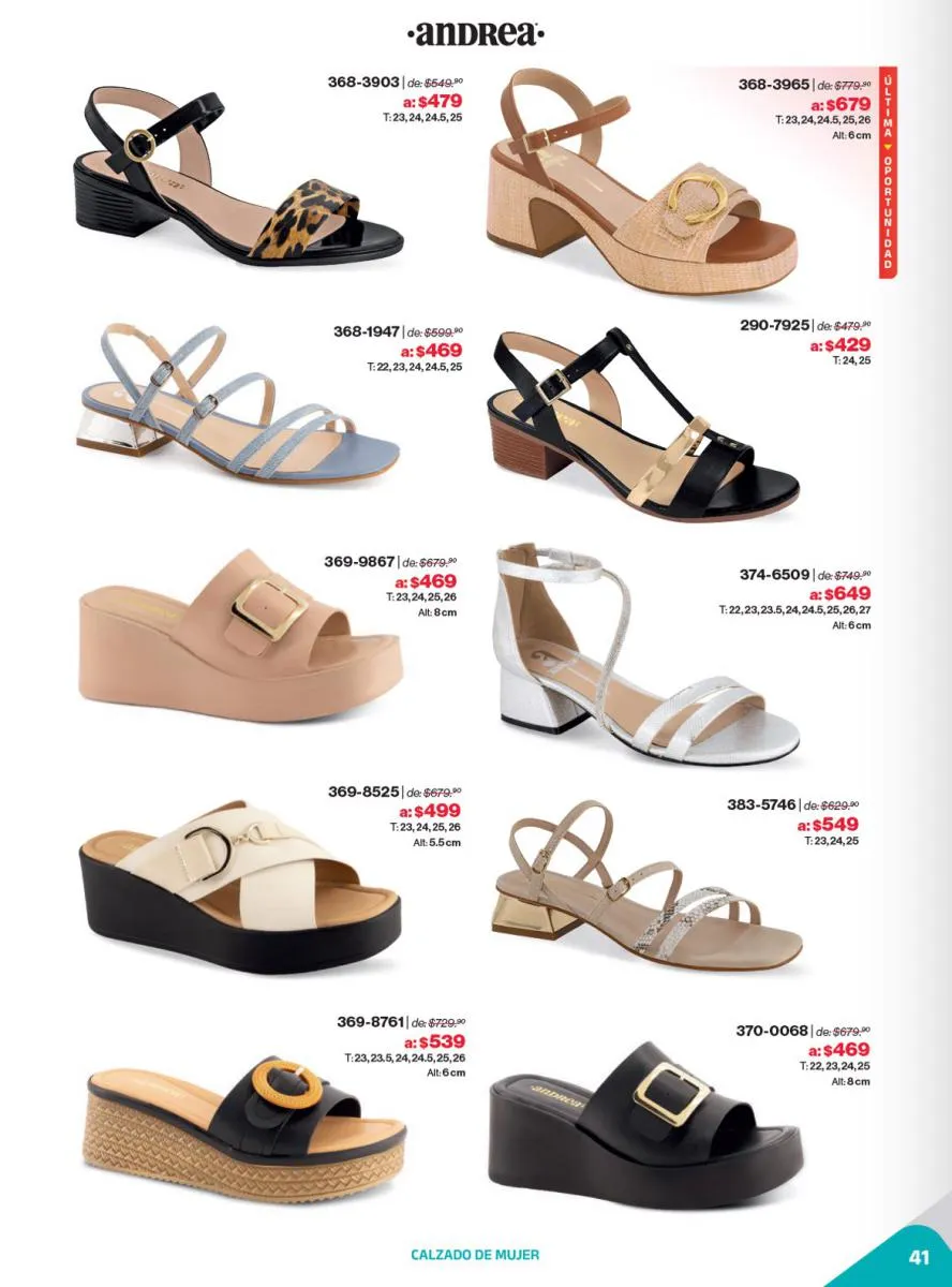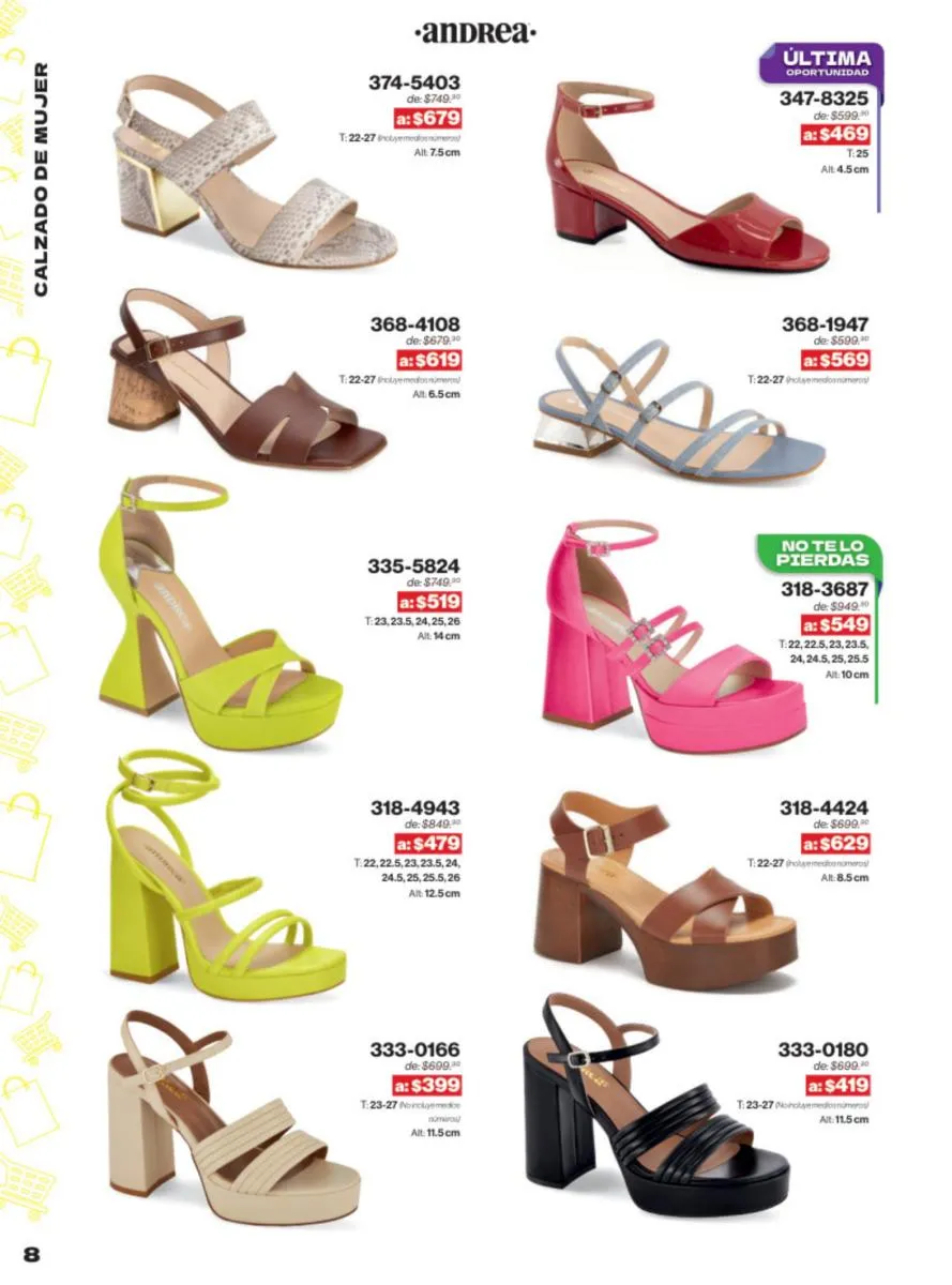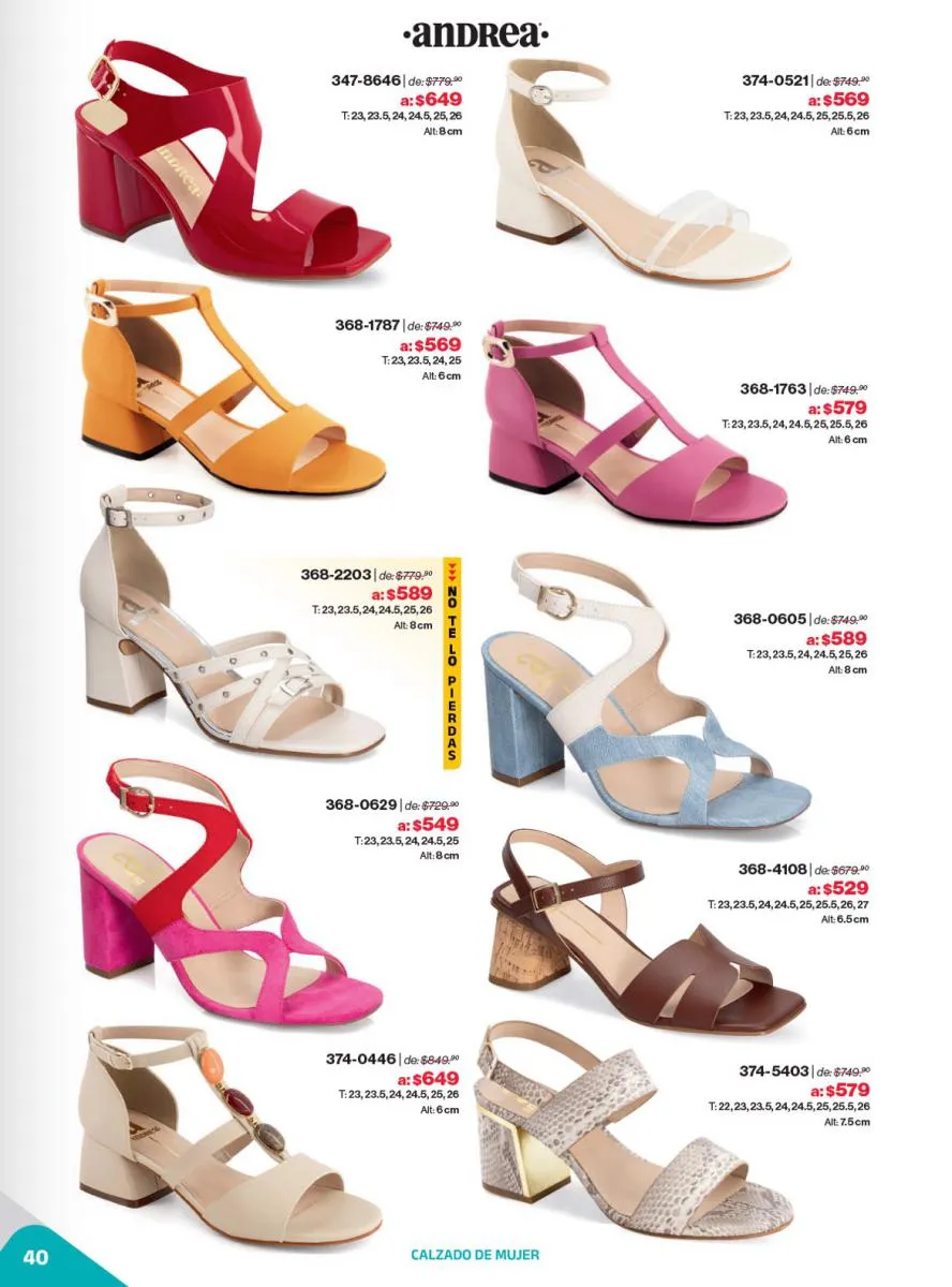 Las sandalias son un elemento esencial en cualquier guardarropa, y Andrea lo sabe muy bien. Este catálogo presenta una selección de sandalias con tacón que combinan comodidad y estilo. Destacan las sandalias en tonos vibrantes como el fucsia y el verde limón, perfectas para darle un toque de color a tus outfits veraniegos. Con detalles de correas ajustables y tacones de diferentes alturas, estas sandalias aseguran un ajuste perfecto y un look sofisticado.