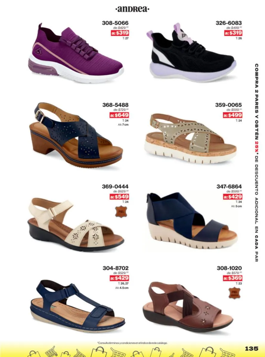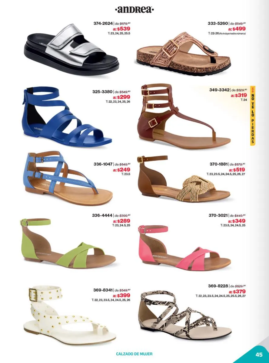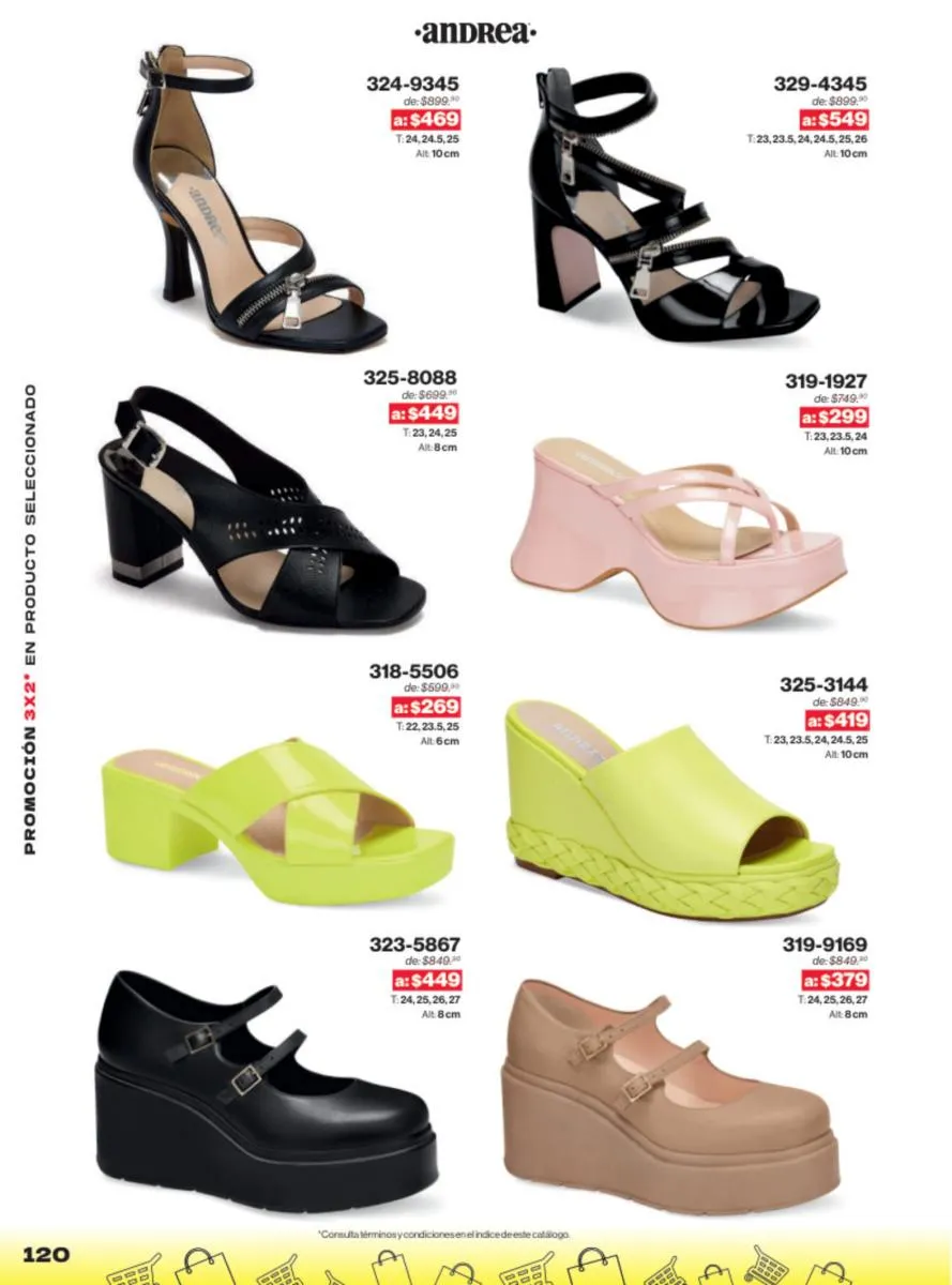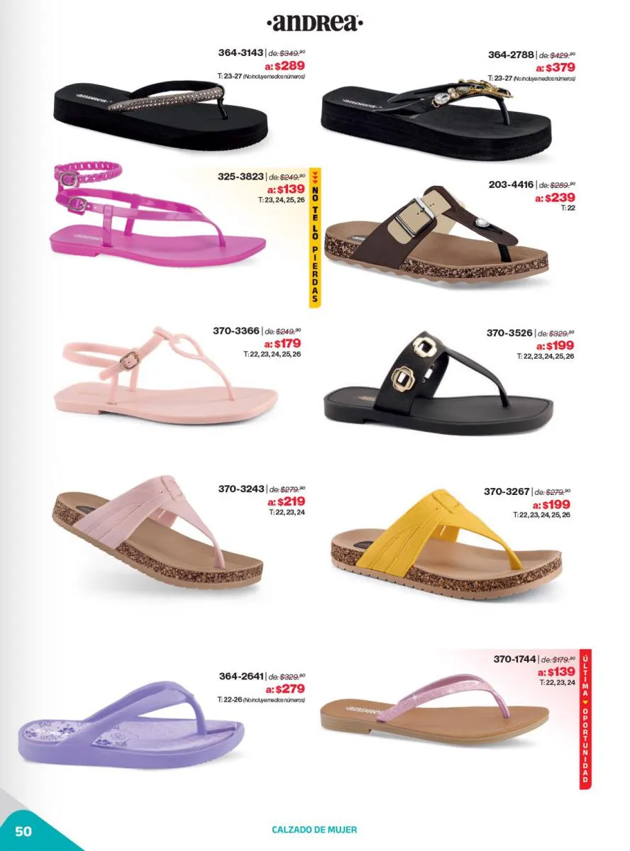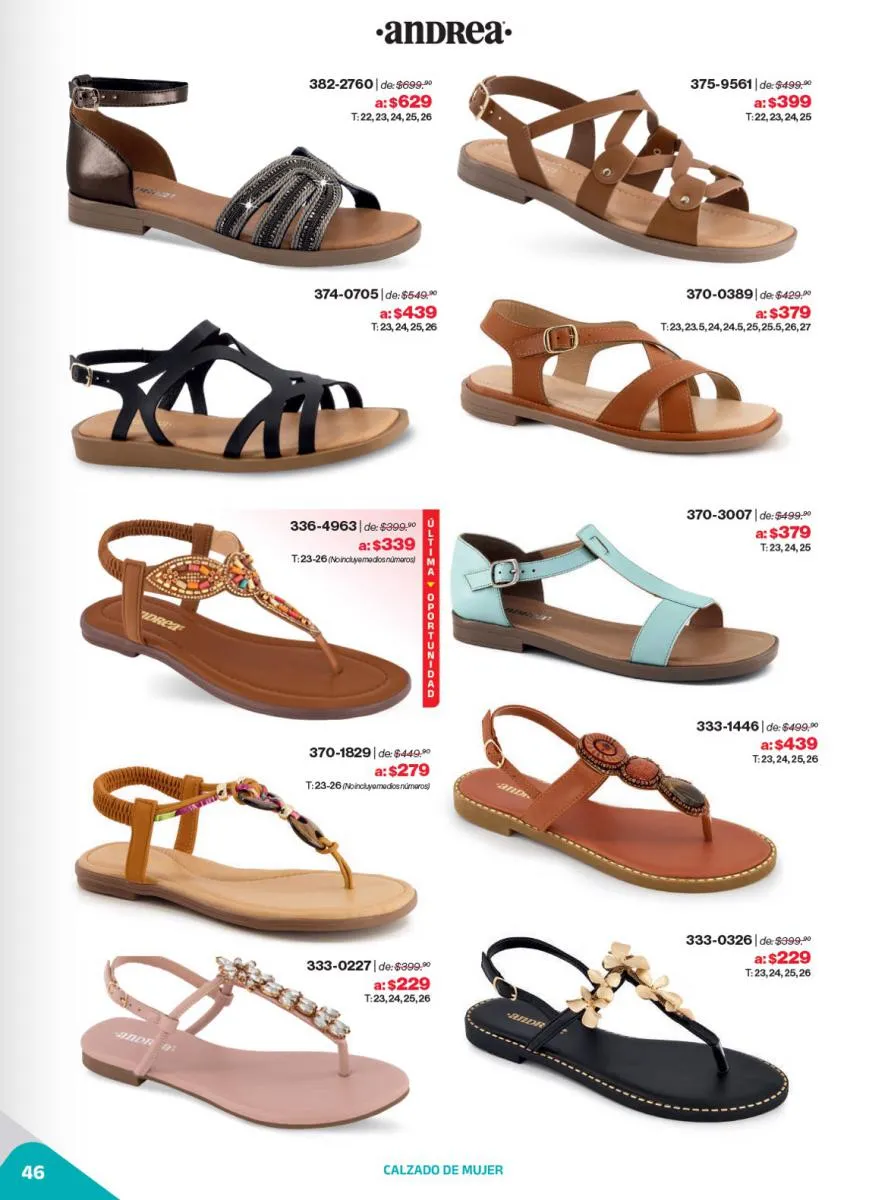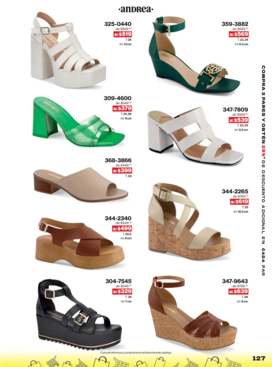 Las sandalias son un elemento esencial en cualquier guardarropa, y Andrea lo sabe muy bien. Este catálogo presenta una selección de sandalias con tacón que combinan comodidad y estilo. Destacan las sandalias en tonos vibrantes como el fucsia y el verde limón, perfectas para darle un toque de color a tus outfits veraniegos. Con detalles de correas ajustables y tacones de diferentes alturas, estas sandalias aseguran un ajuste perfecto y un look sofisticado.