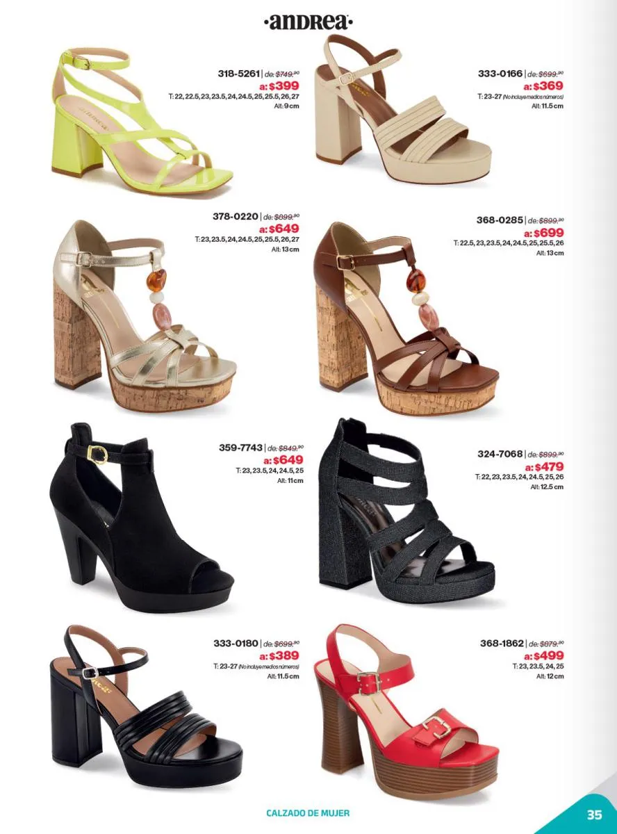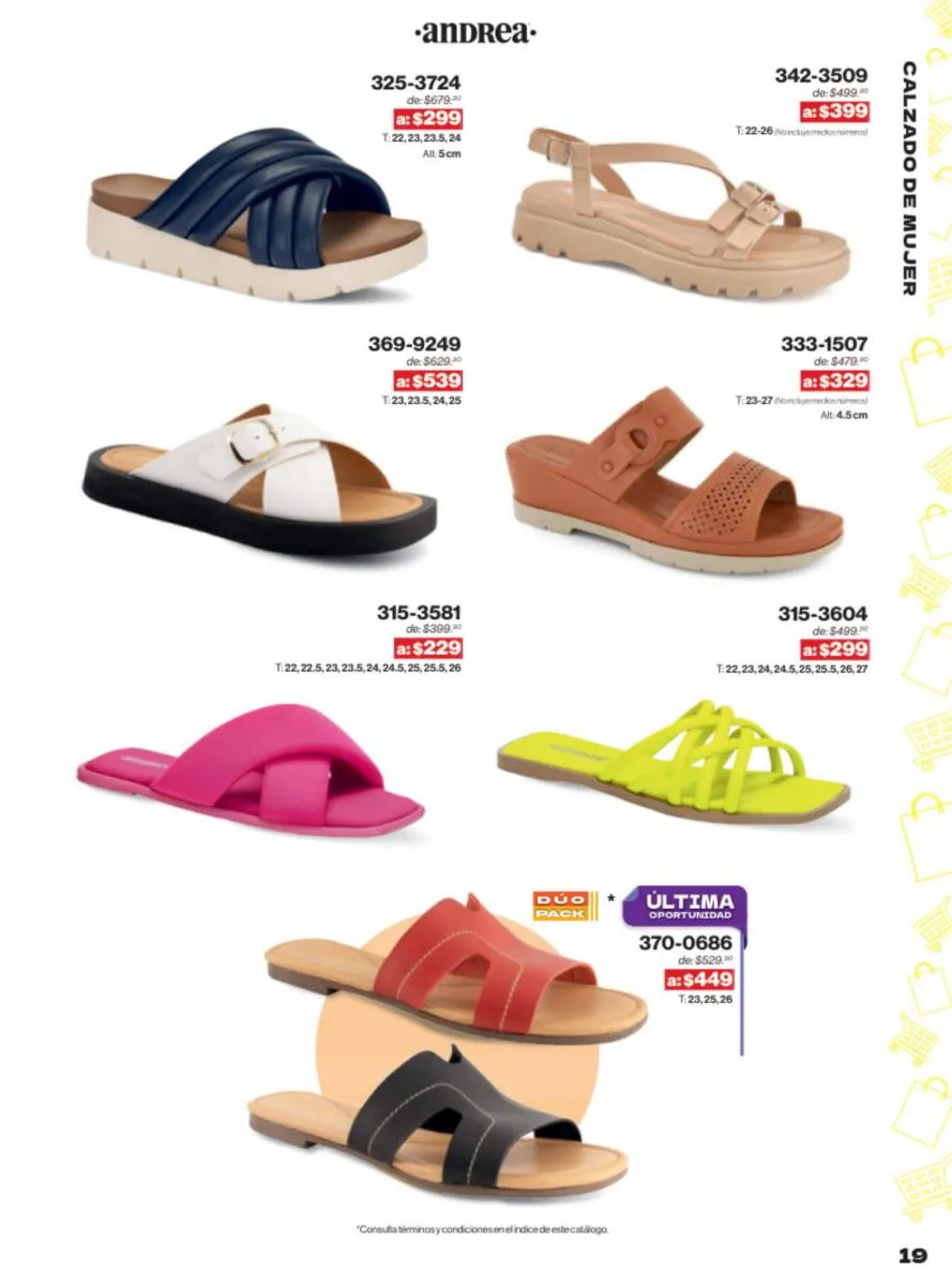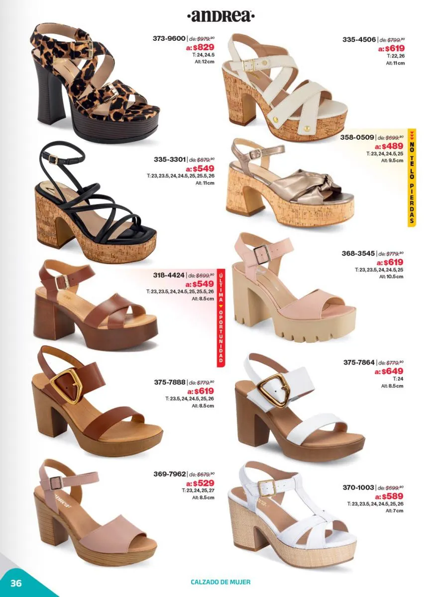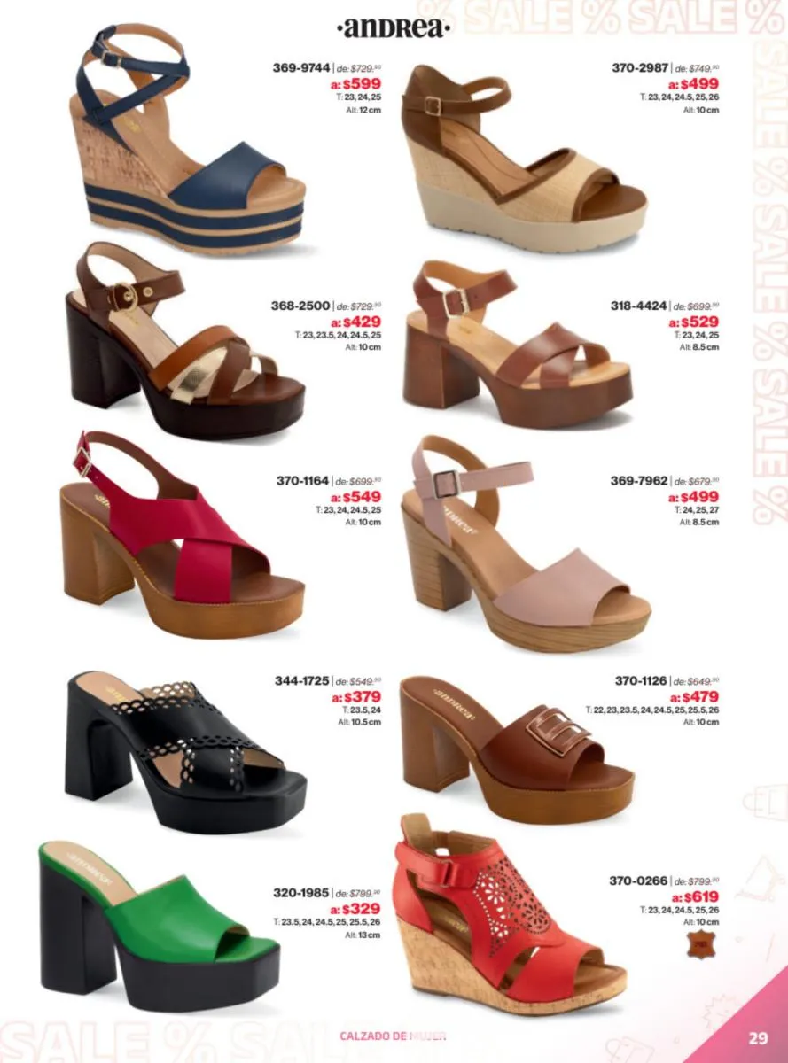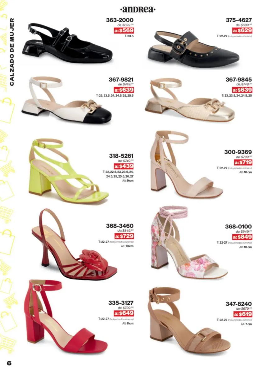 Las sandalias son un elemento esencial en cualquier guardarropa, y Andrea lo sabe muy bien. Este catálogo presenta una selección de sandalias con tacón que combinan comodidad y estilo. Destacan las sandalias en tonos vibrantes como el fucsia y el verde limón, perfectas para darle un toque de color a tus outfits veraniegos. Con detalles de correas ajustables y tacones de diferentes alturas, estas sandalias aseguran un ajuste perfecto y un look sofisticado.