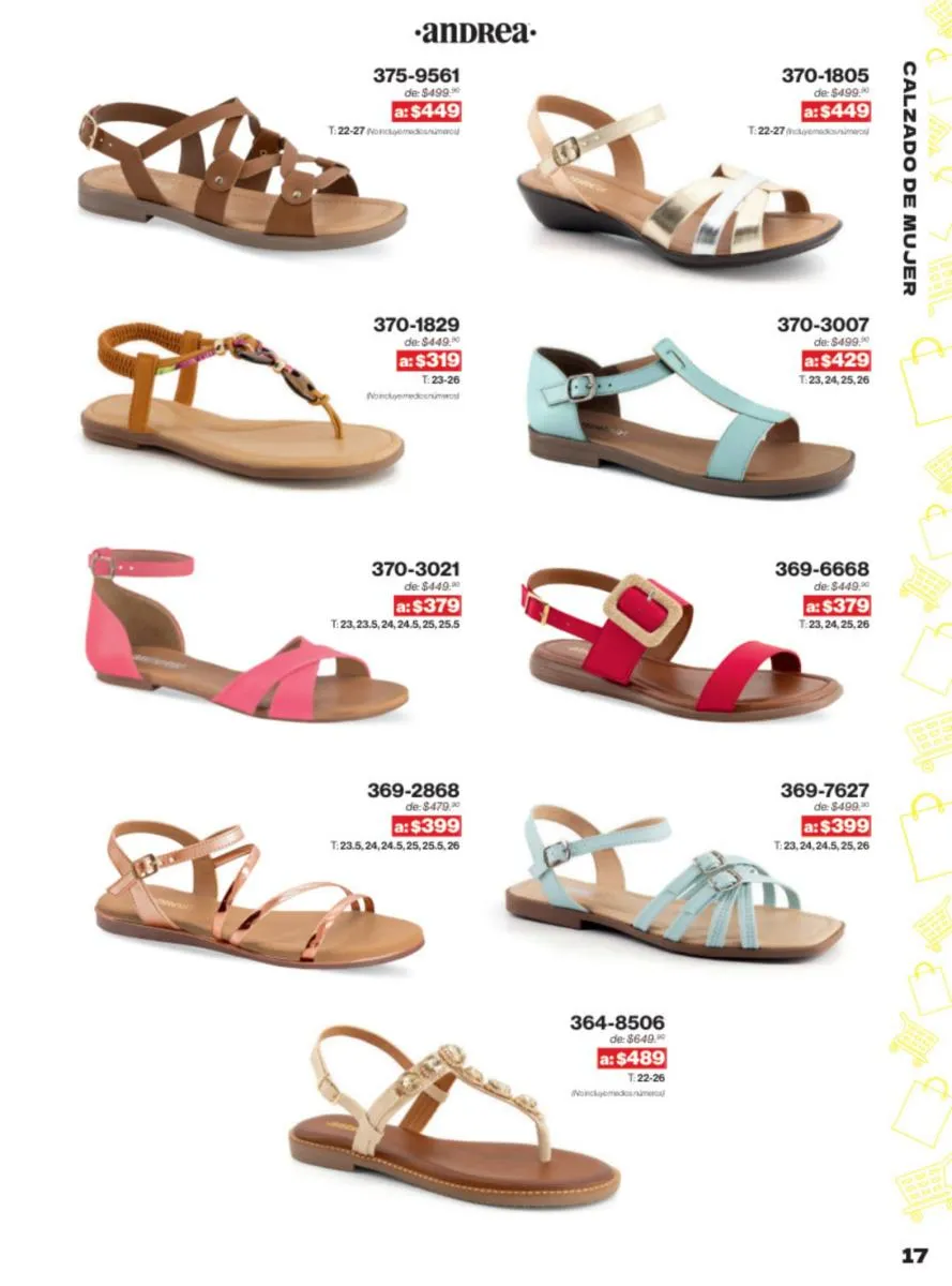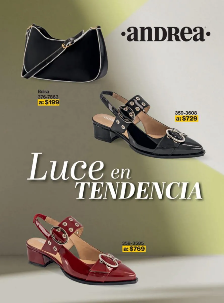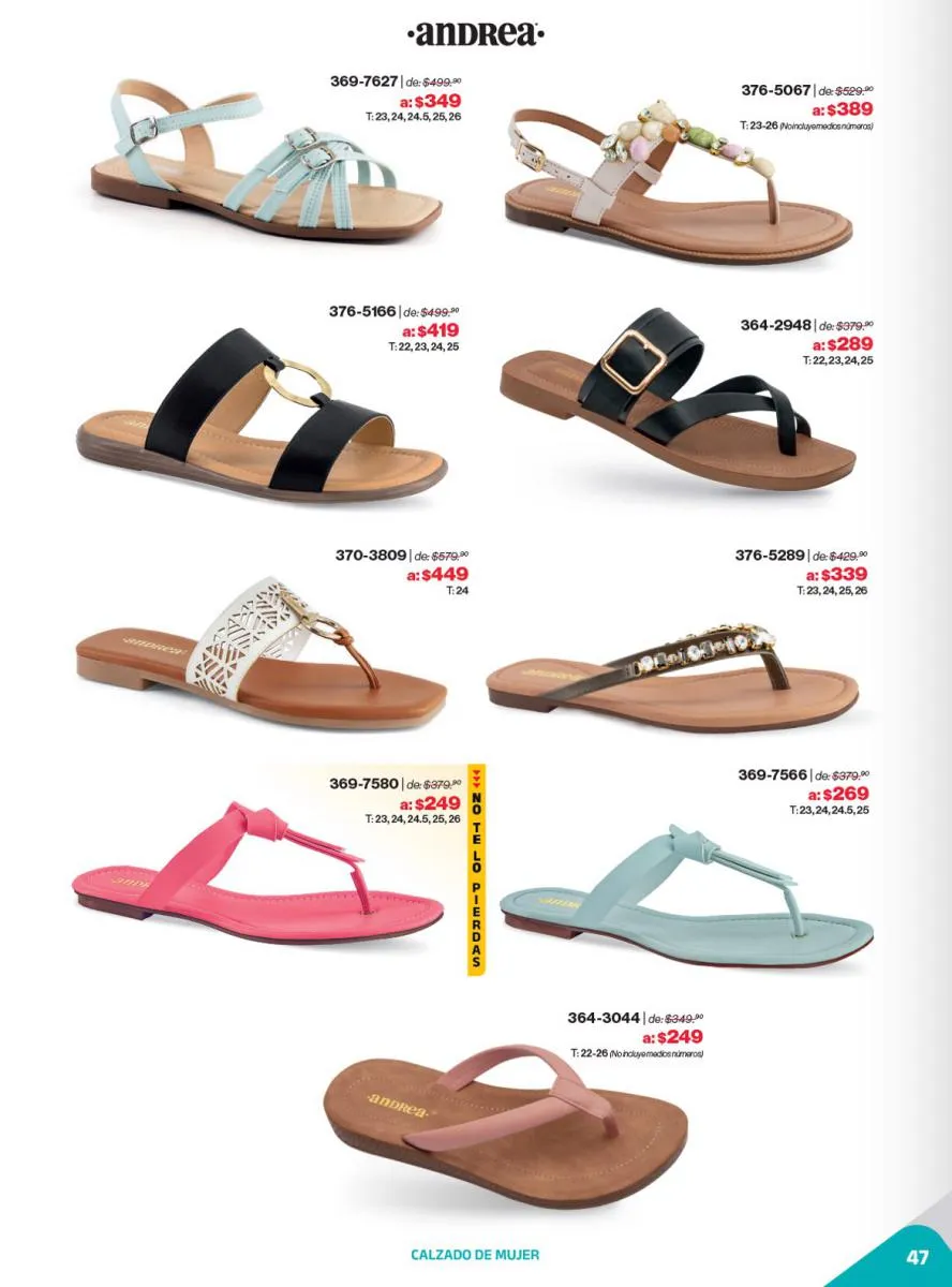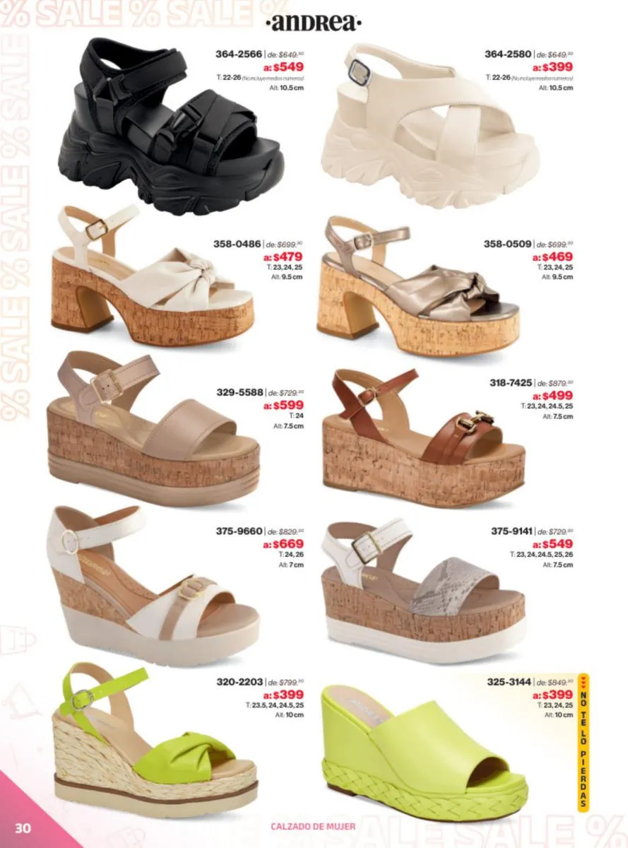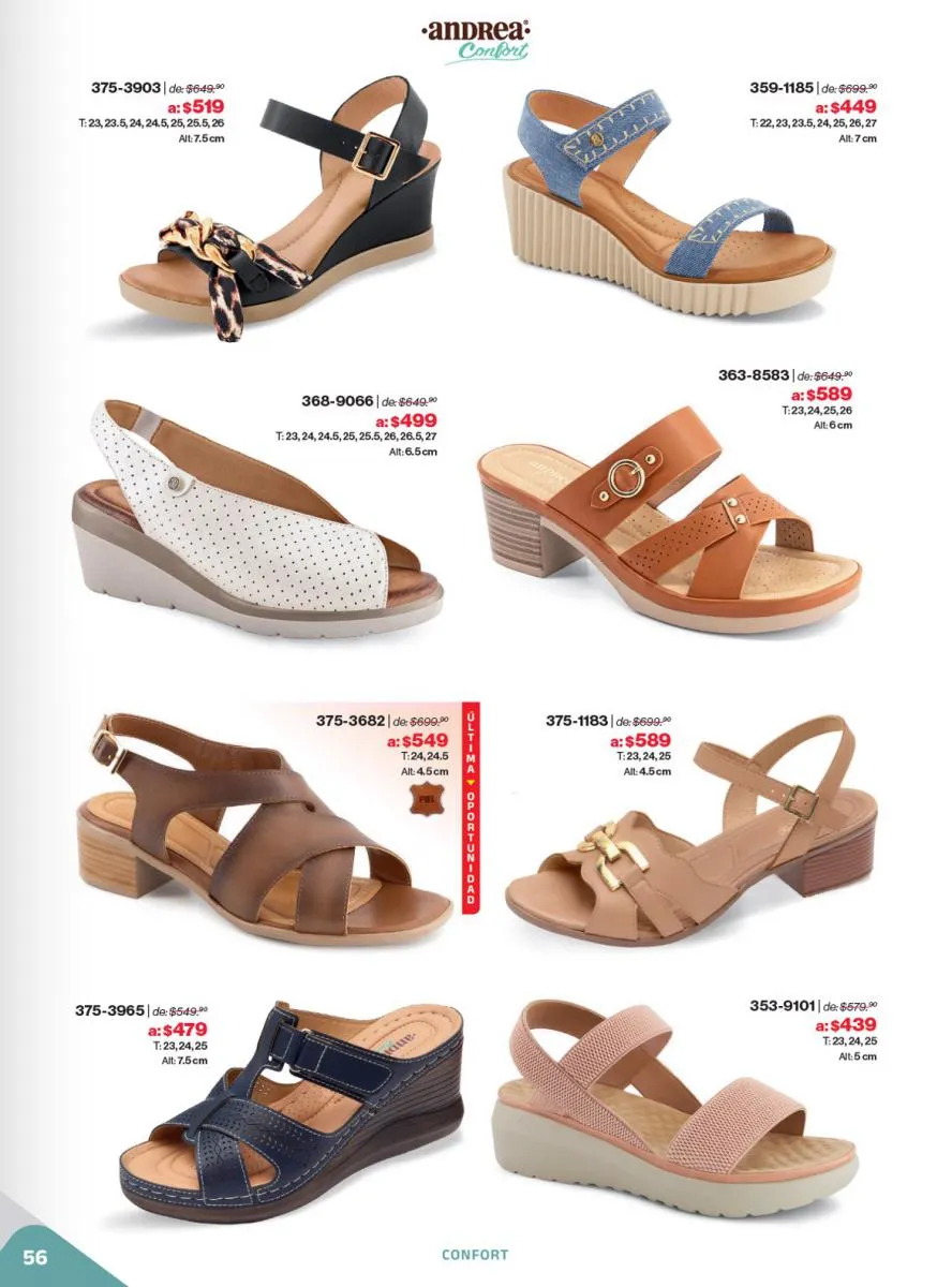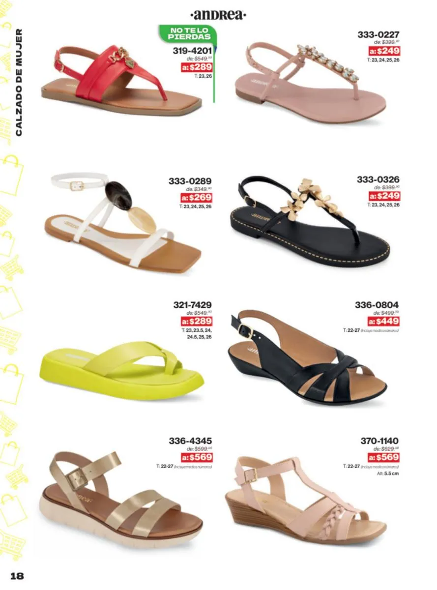 Las sandalias son un elemento esencial en cualquier guardarropa, y Andrea lo sabe muy bien. Este catálogo presenta una selección de sandalias con tacón que combinan comodidad y estilo. Destacan las sandalias en tonos vibrantes como el fucsia y el verde limón, perfectas para darle un toque de color a tus outfits veraniegos. Con detalles de correas ajustables y tacones de diferentes alturas, estas sandalias aseguran un ajuste perfecto y un look sofisticado.
