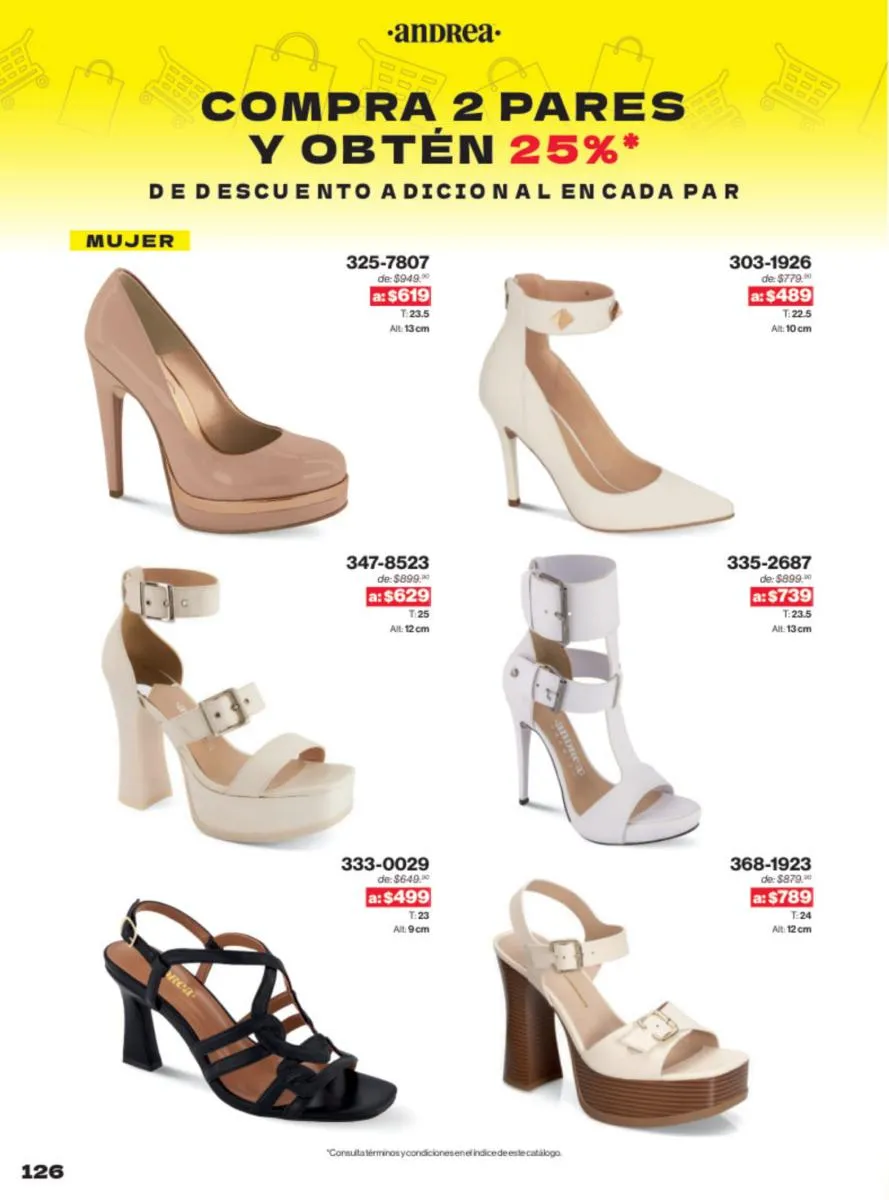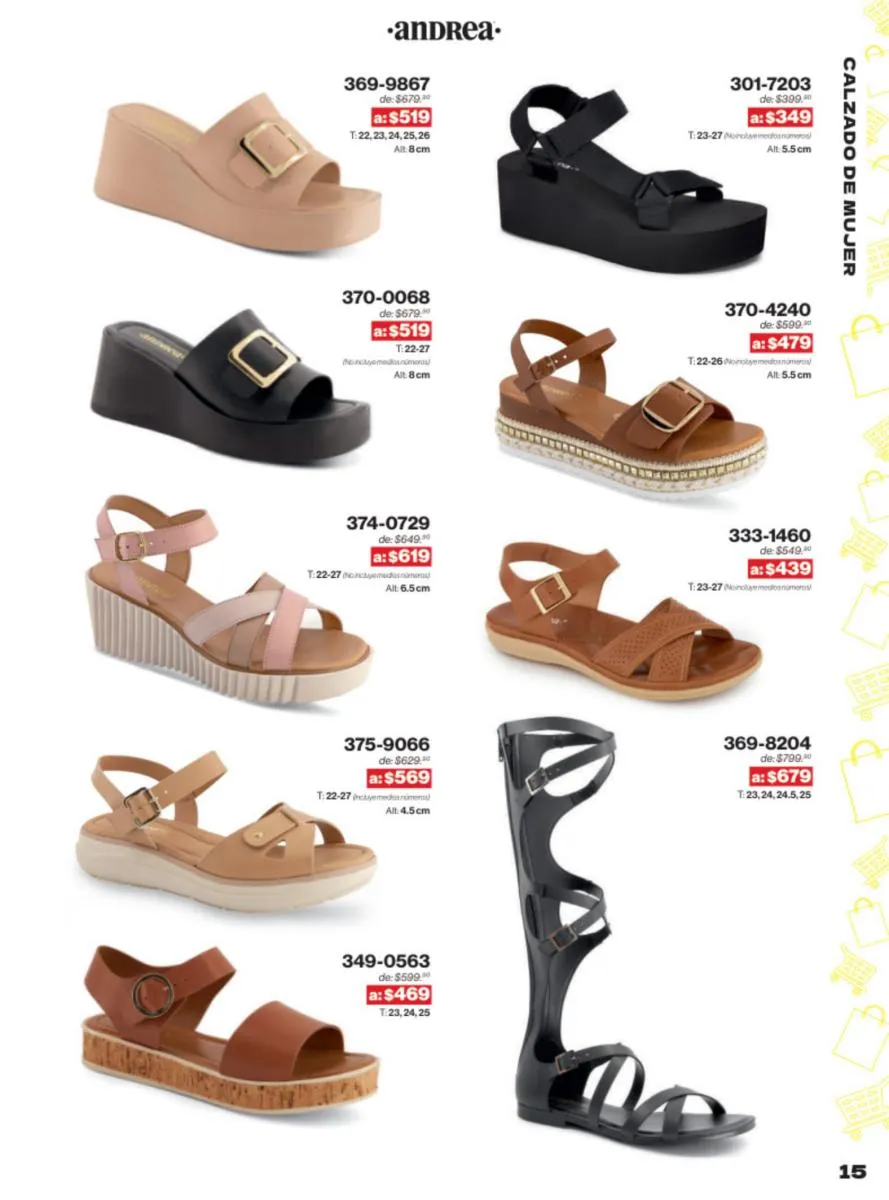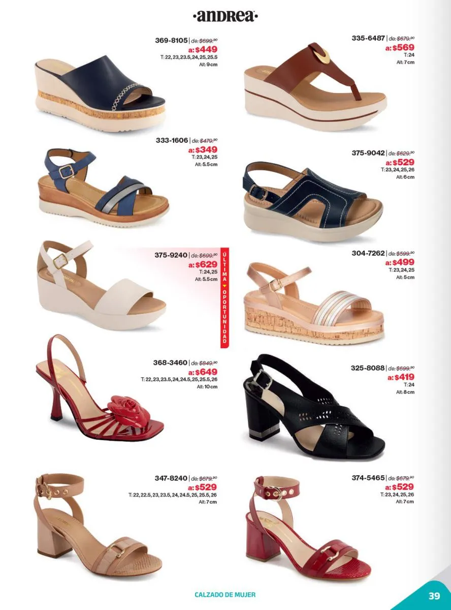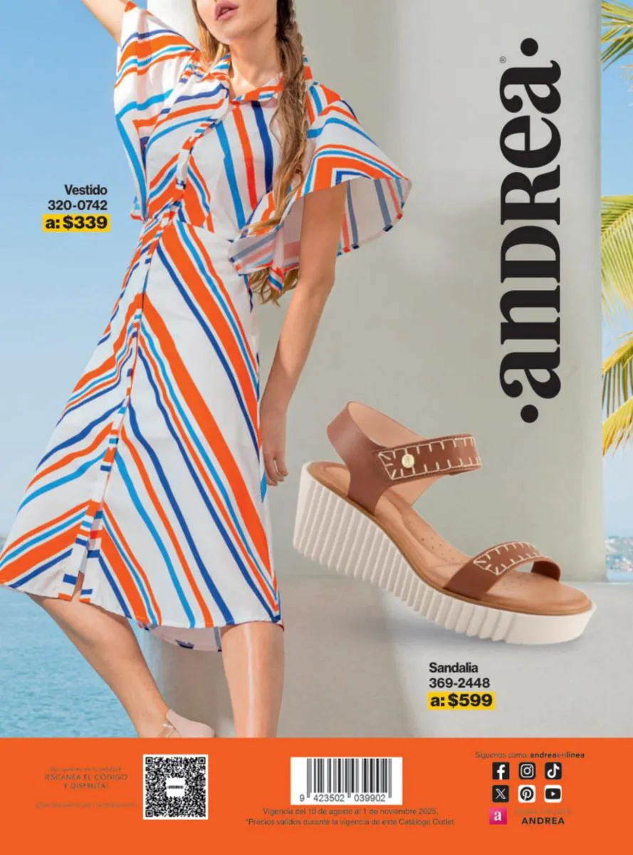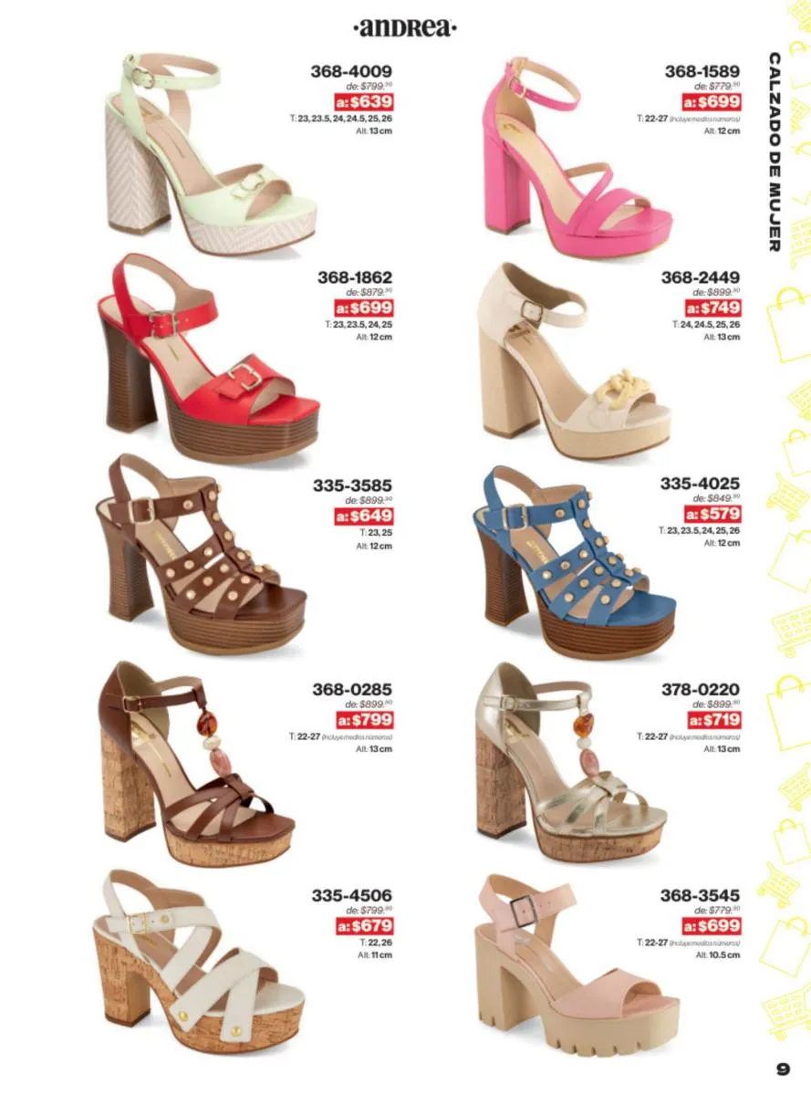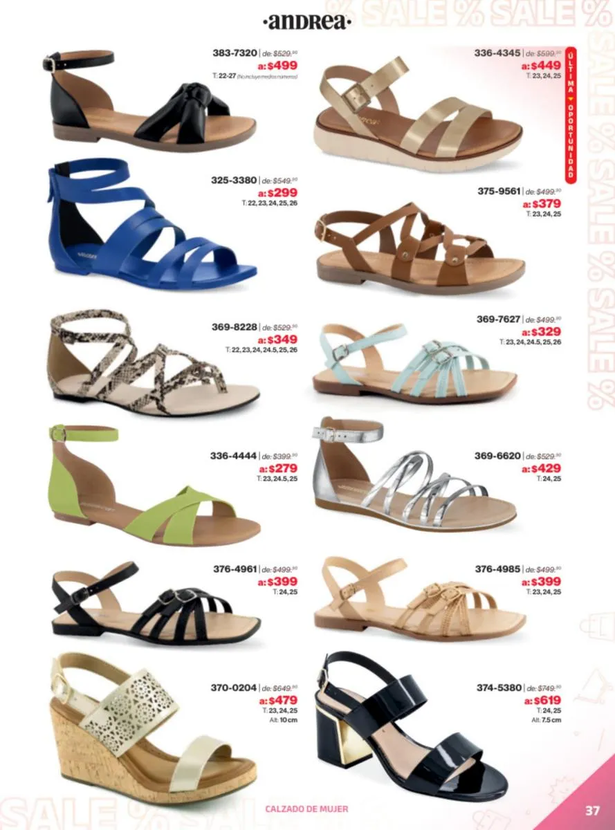 Las sandalias son un elemento esencial en cualquier guardarropa, y Andrea lo sabe muy bien. Este catálogo presenta una selección de sandalias con tacón que combinan comodidad y estilo. Destacan las sandalias en tonos vibrantes como el fucsia y el verde limón, perfectas para darle un toque de color a tus outfits veraniegos. Con detalles de correas ajustables y tacones de diferentes alturas, estas sandalias aseguran un ajuste perfecto y un look sofisticado.