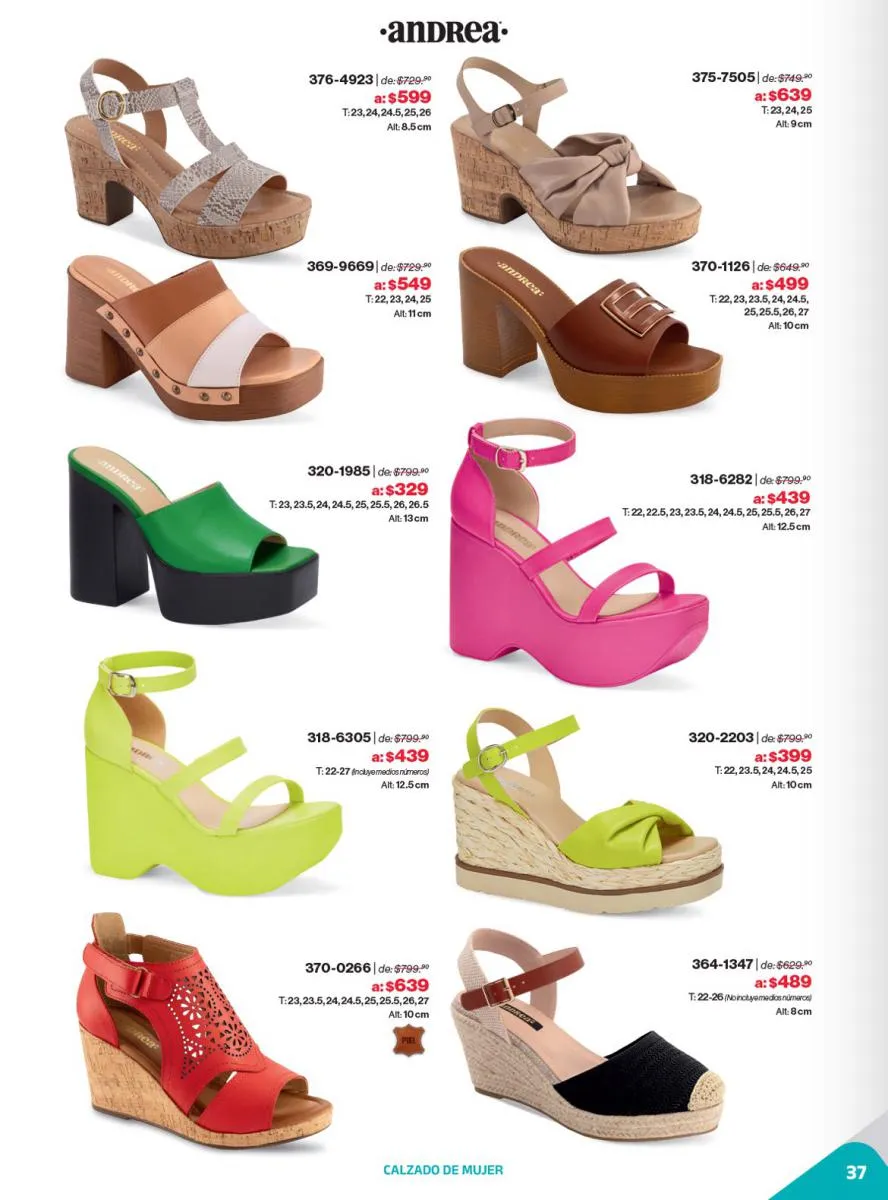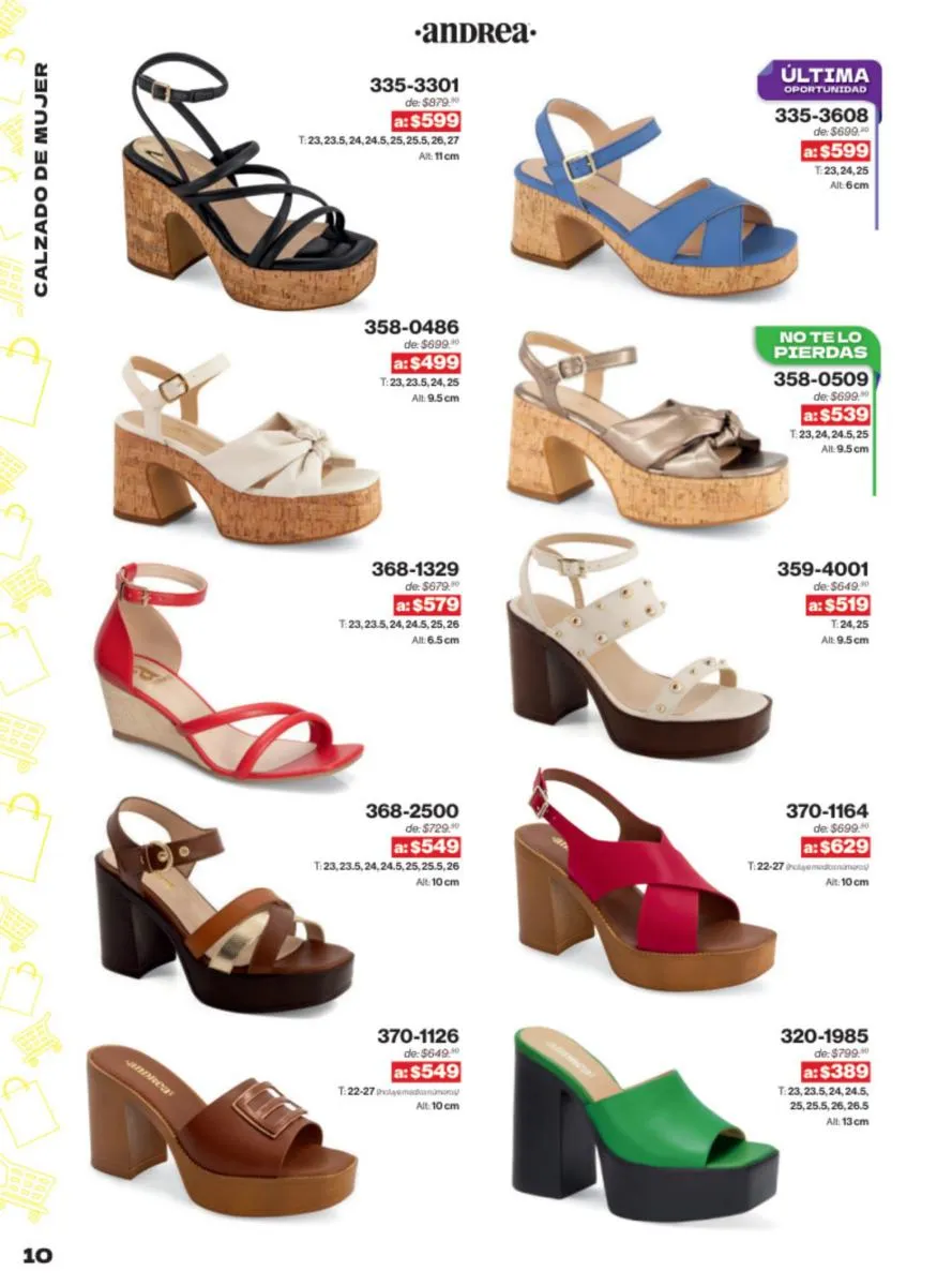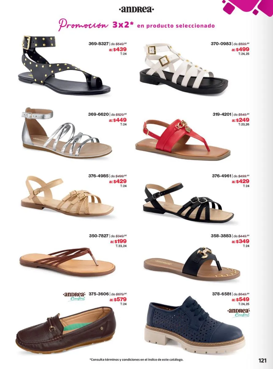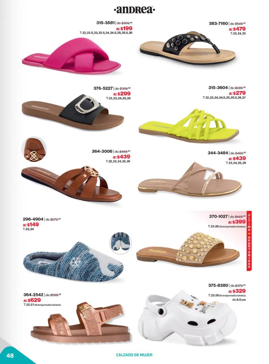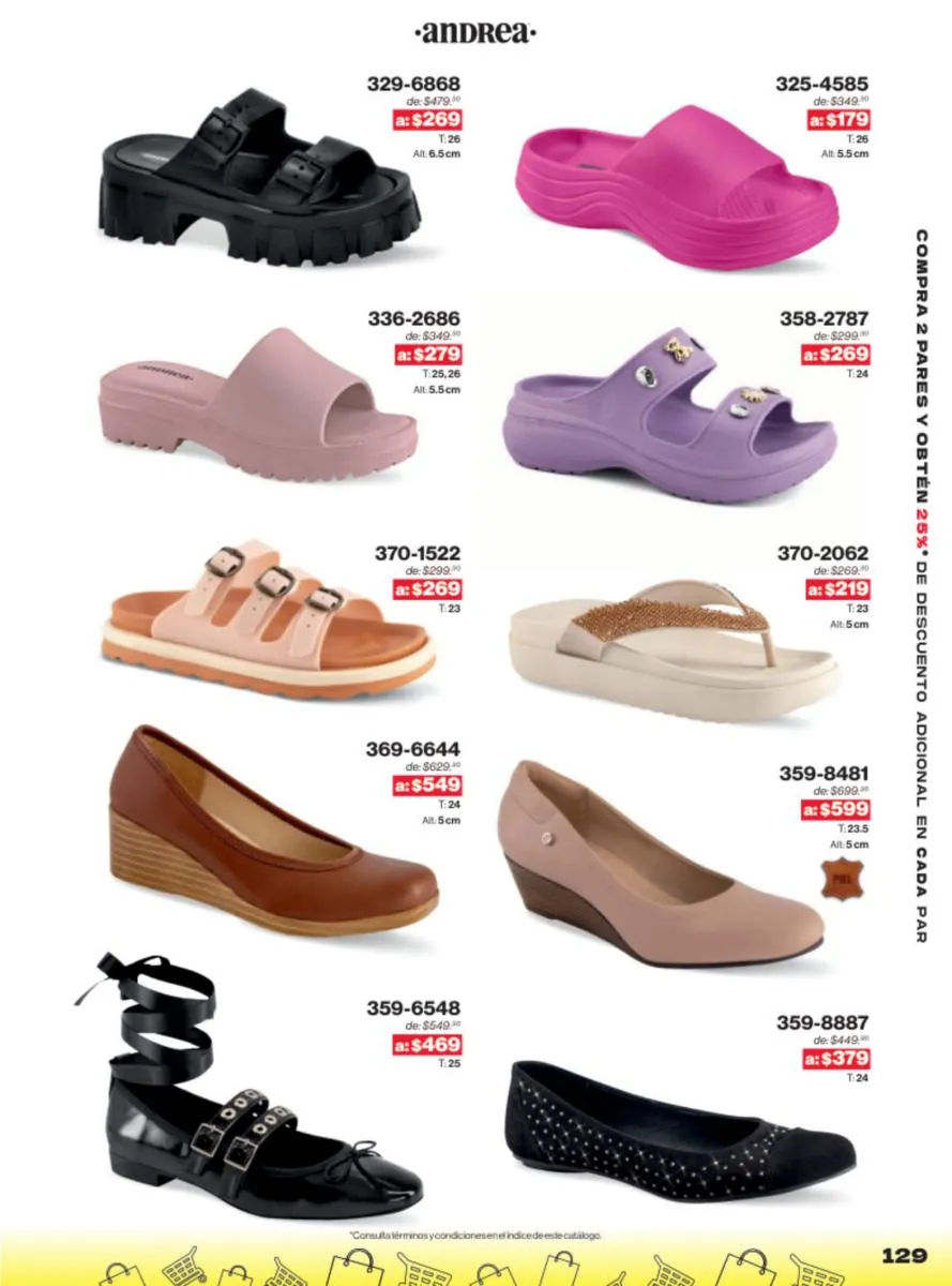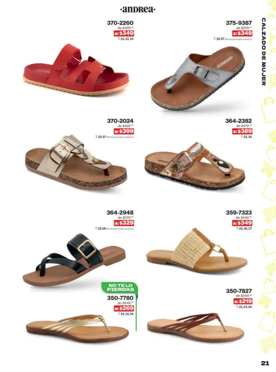 Las sandalias son un elemento esencial en cualquier guardarropa, y Andrea lo sabe muy bien. Este catálogo presenta una selección de sandalias con tacón que combinan comodidad y estilo. Destacan las sandalias en tonos vibrantes como el fucsia y el verde limón, perfectas para darle un toque de color a tus outfits veraniegos. Con detalles de correas ajustables y tacones de diferentes alturas, estas sandalias aseguran un ajuste perfecto y un look sofisticado.