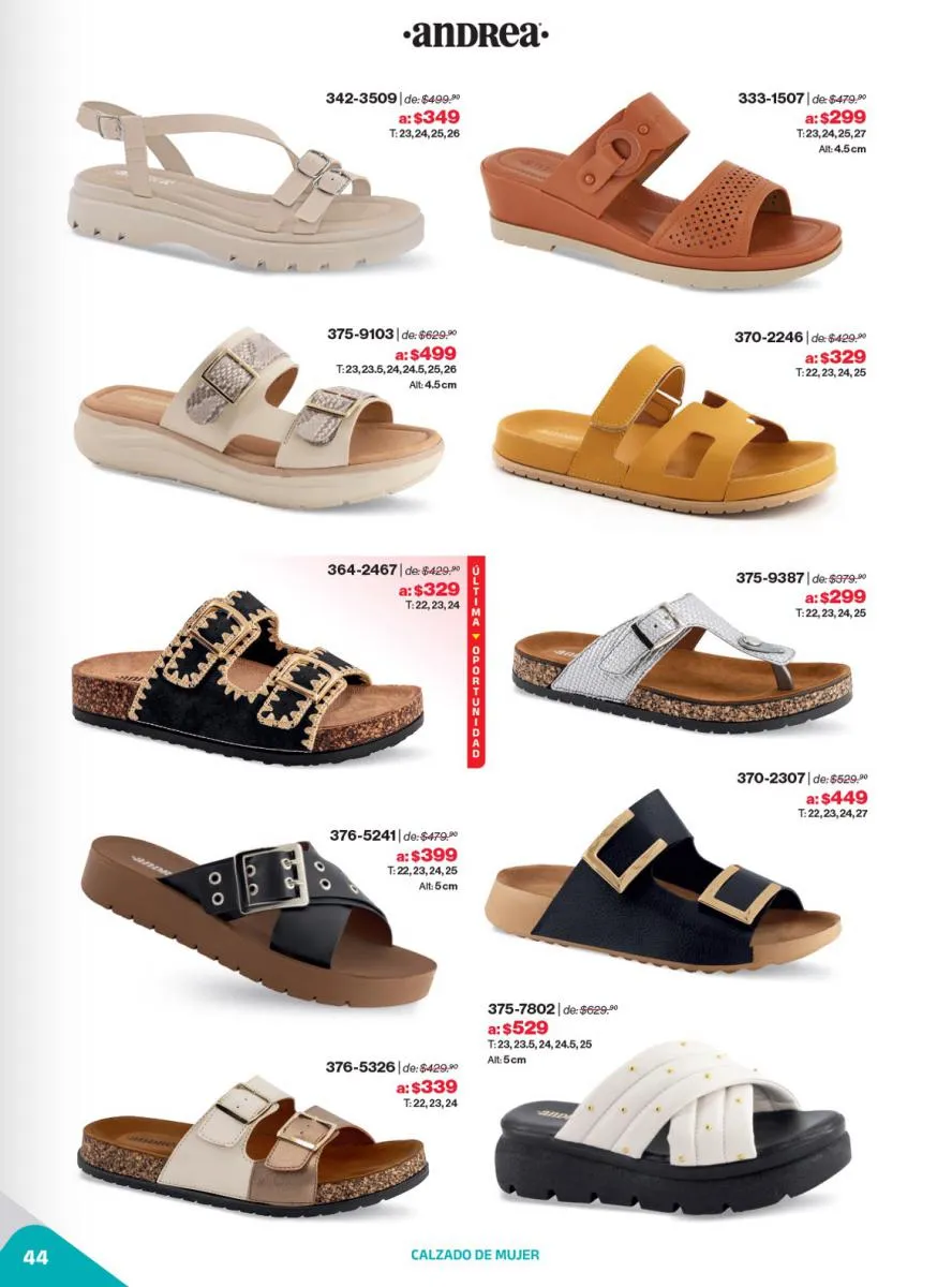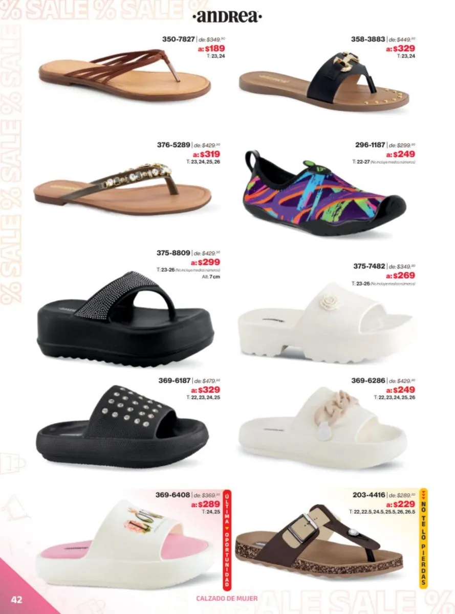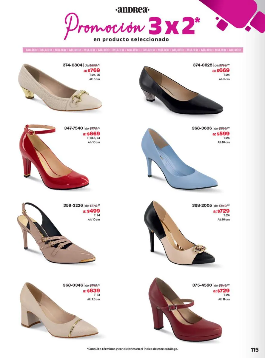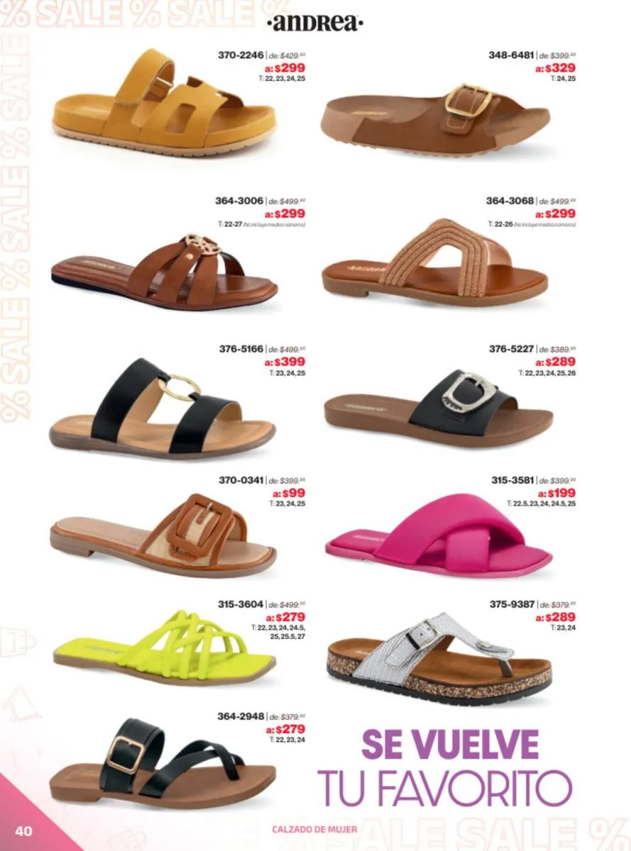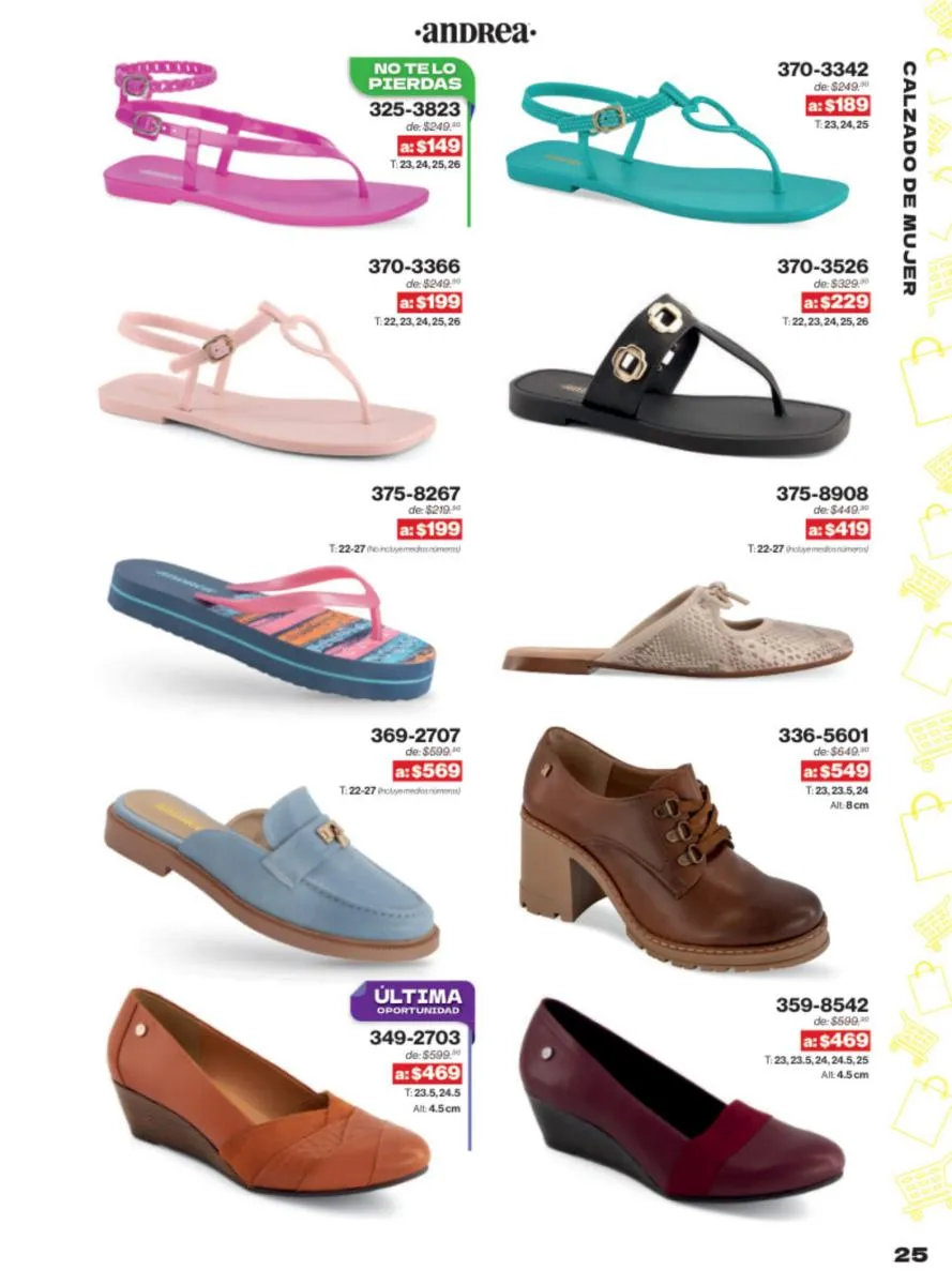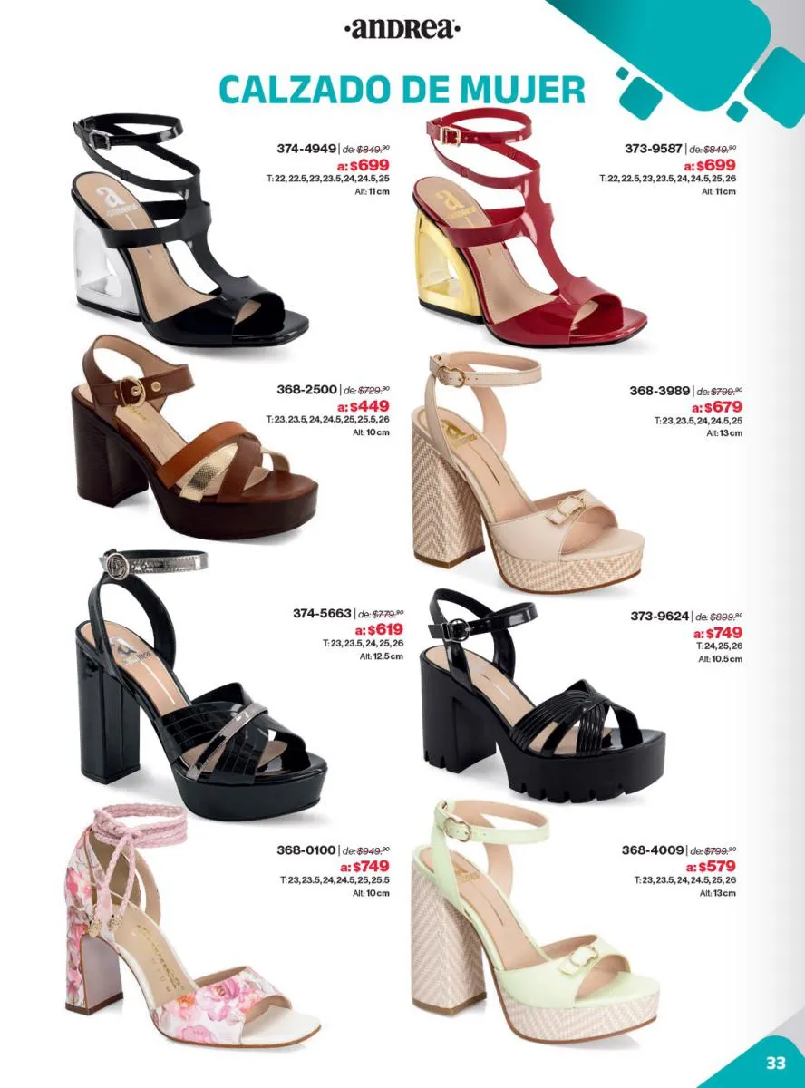 Las sandalias son un elemento esencial en cualquier guardarropa, y Andrea lo sabe muy bien. Este catálogo presenta una selección de sandalias con tacón que combinan comodidad y estilo. Destacan las sandalias en tonos vibrantes como el fucsia y el verde limón, perfectas para darle un toque de color a tus outfits veraniegos. Con detalles de correas ajustables y tacones de diferentes alturas, estas sandalias aseguran un ajuste perfecto y un look sofisticado.