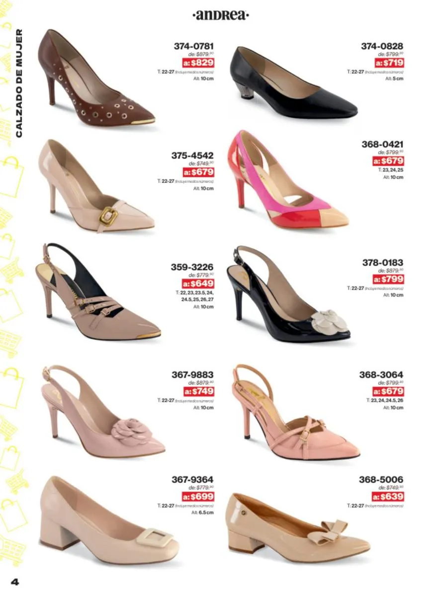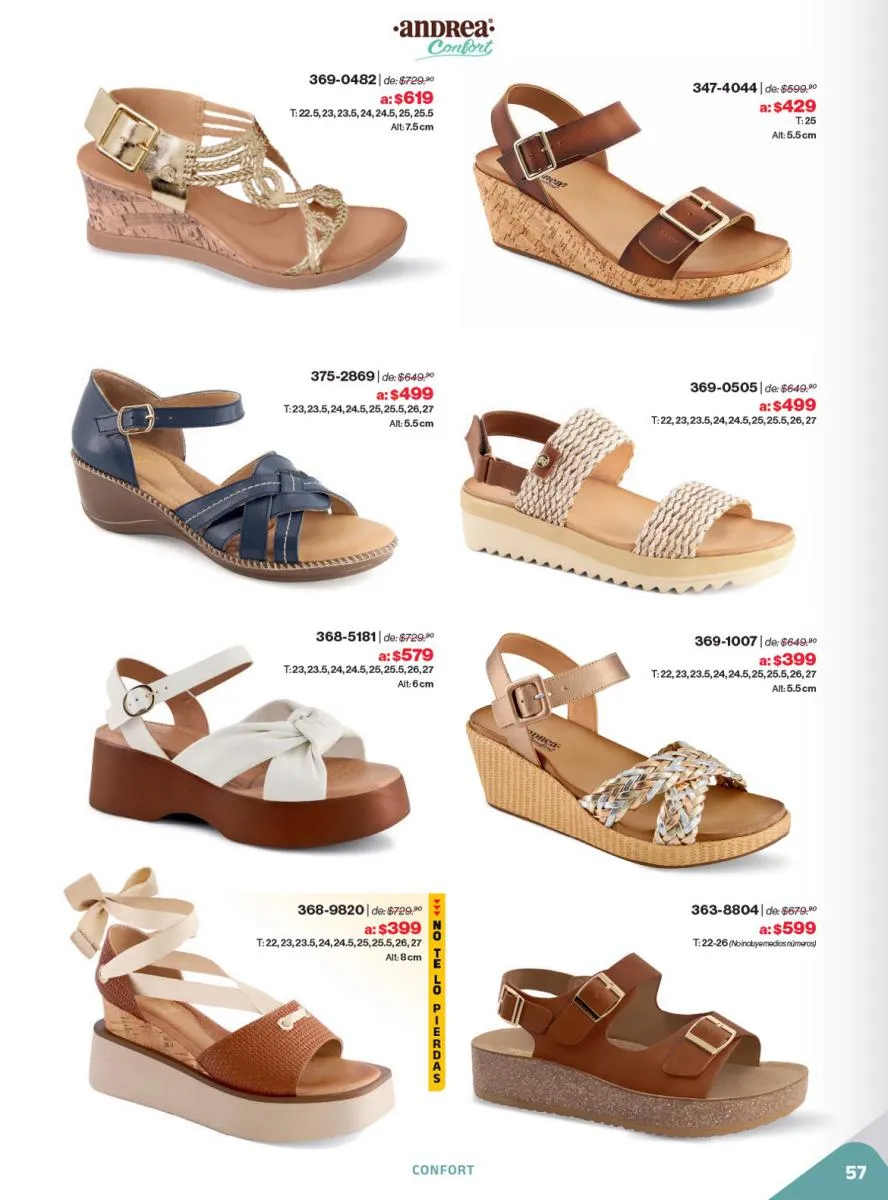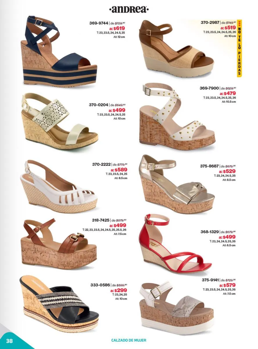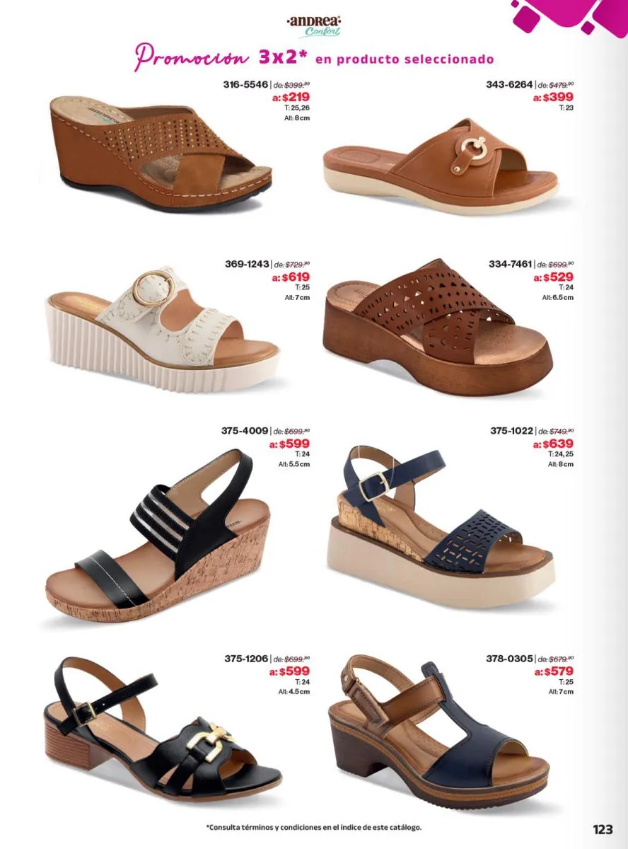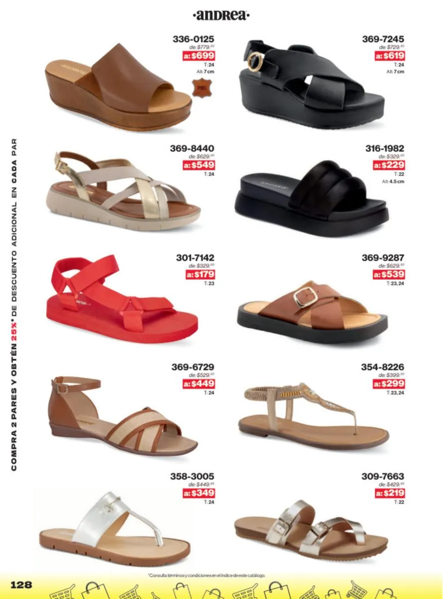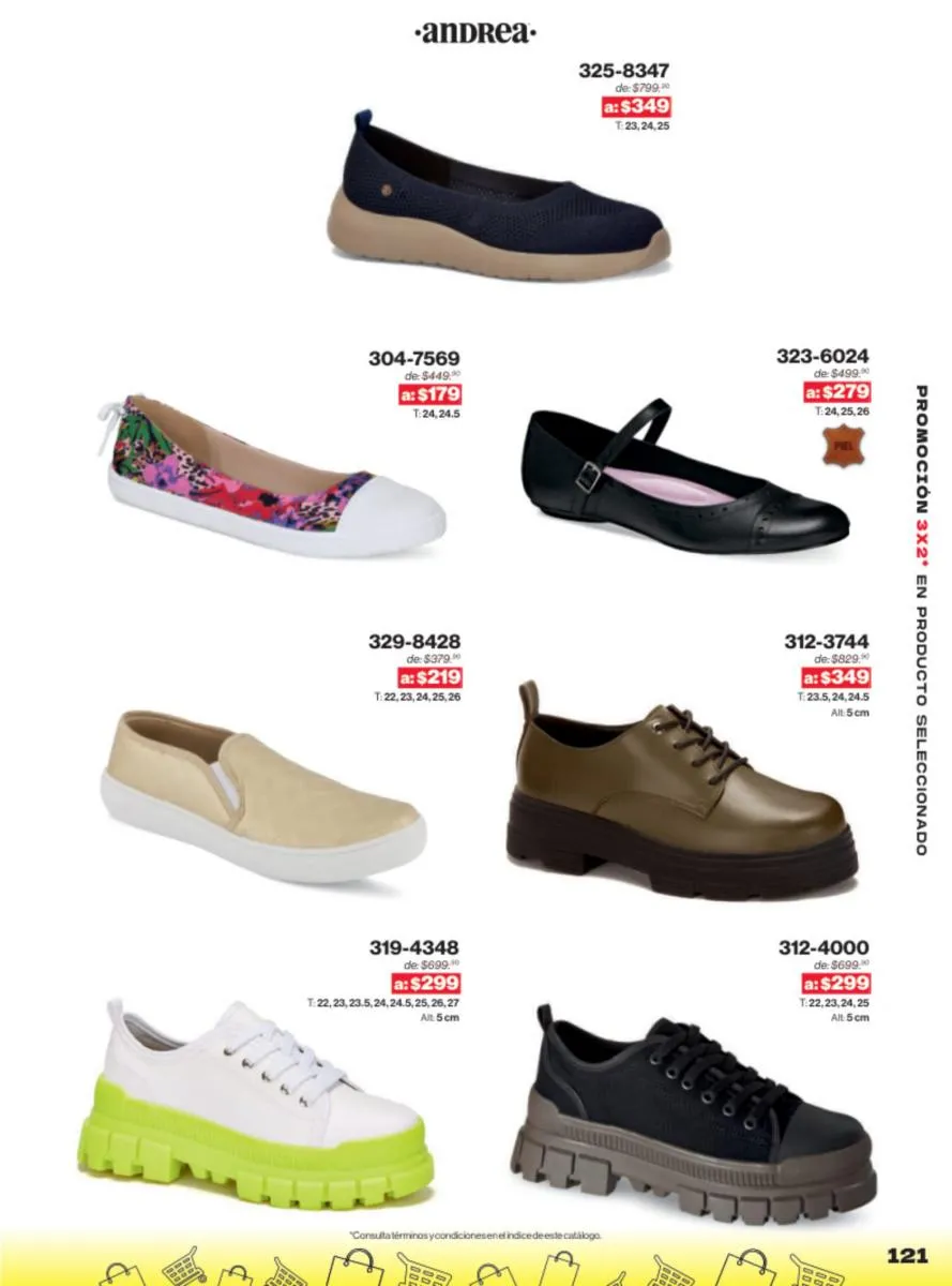Las sandalias son un elemento esencial en cualquier guardarropa, y Andrea lo sabe muy bien. Este catálogo presenta una selección de sandalias con tacón que combinan comodidad y estilo. Destacan las sandalias en tonos vibrantes como el fucsia y el verde limón, perfectas para darle un toque de color a tus outfits veraniegos. Con detalles de correas ajustables y tacones de diferentes alturas, estas sandalias aseguran un ajuste perfecto y un look sofisticado.