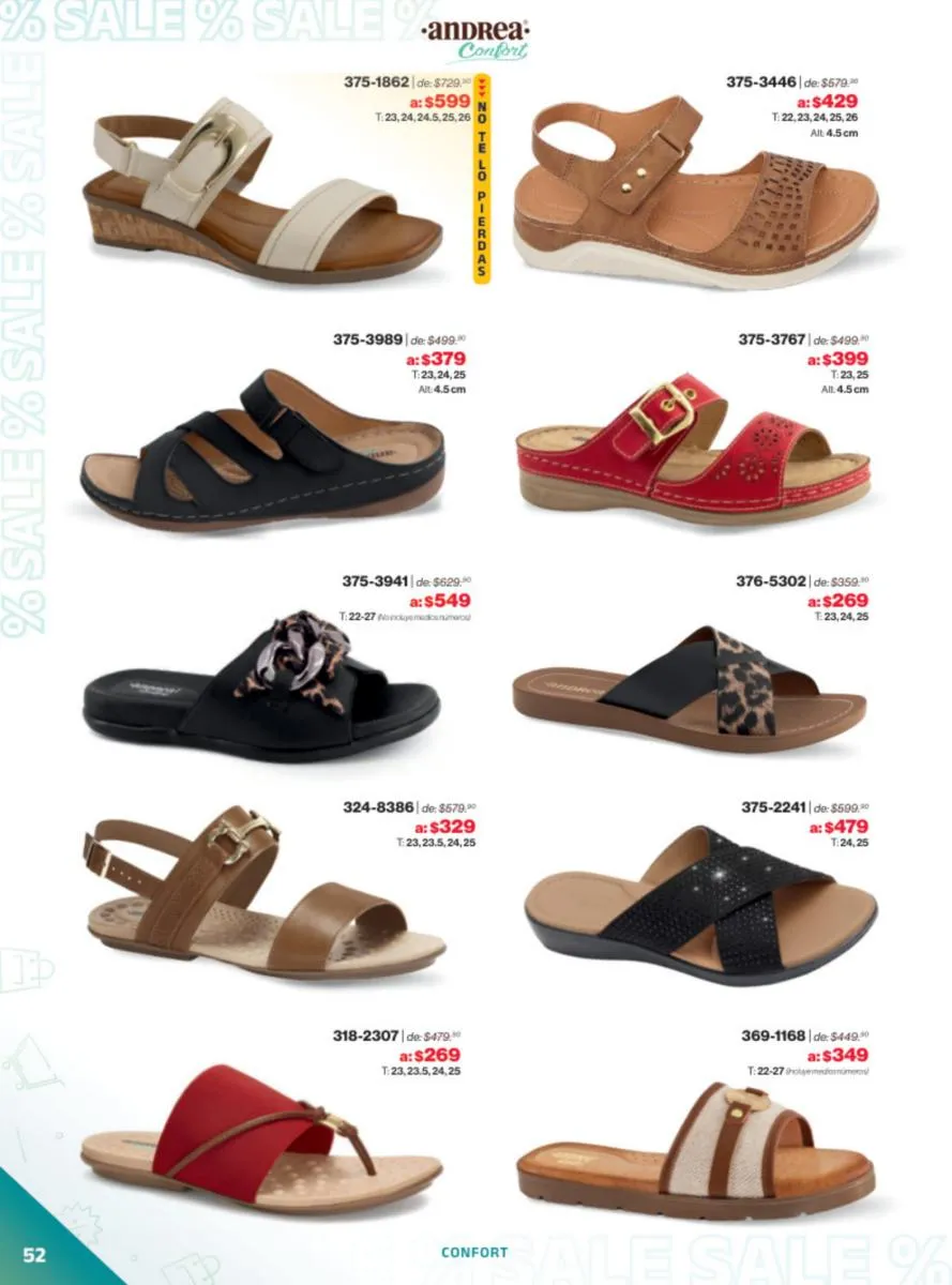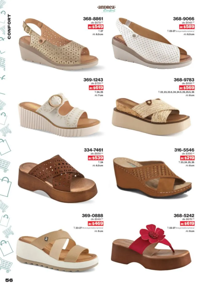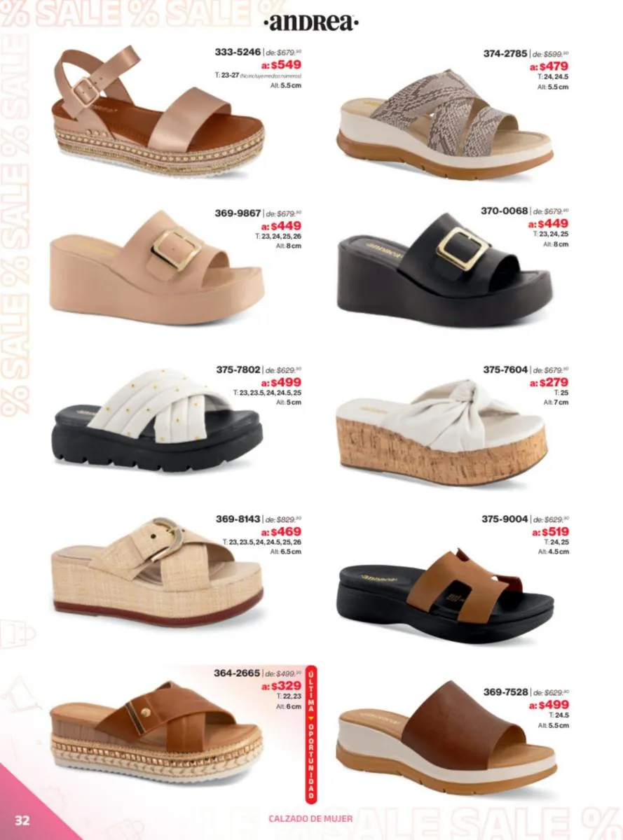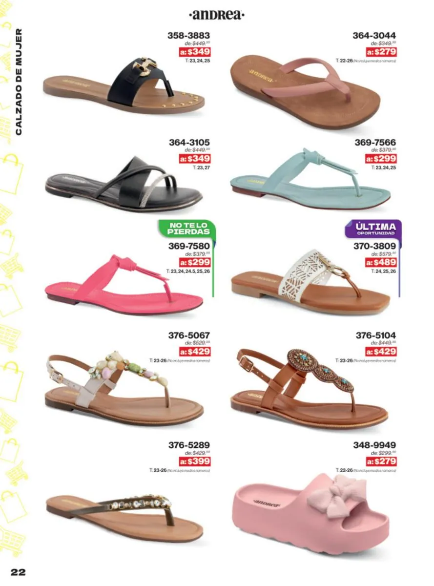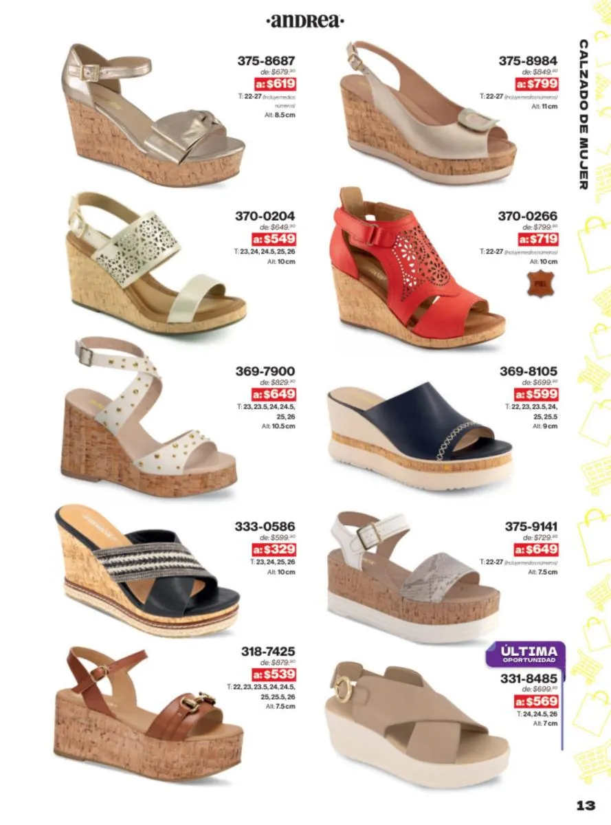 Las sandalias son un elemento esencial en cualquier guardarropa, y Andrea lo sabe muy bien. Este catálogo presenta una selección de sandalias con tacón que combinan comodidad y estilo. Destacan las sandalias en tonos vibrantes como el fucsia y el verde limón, perfectas para darle un toque de color a tus outfits veraniegos. Con detalles de correas ajustables y tacones de diferentes alturas, estas sandalias aseguran un ajuste perfecto y un look sofisticado.
