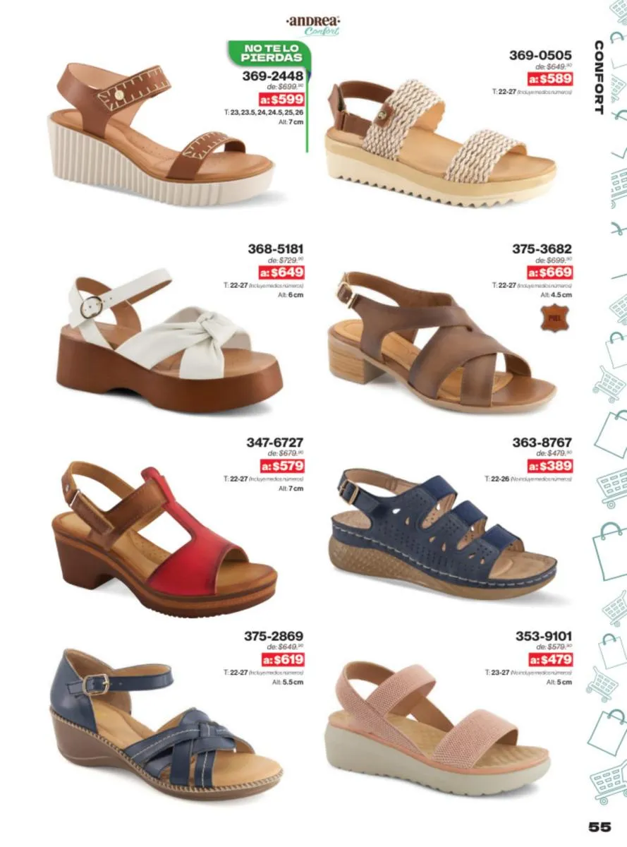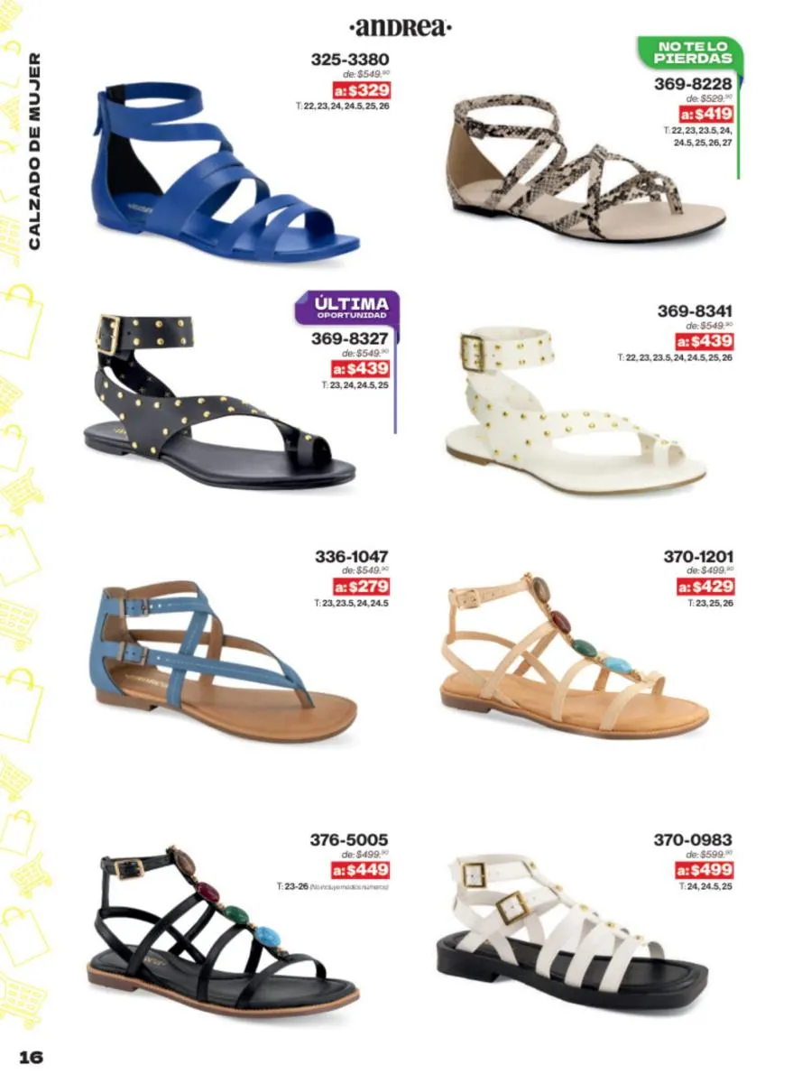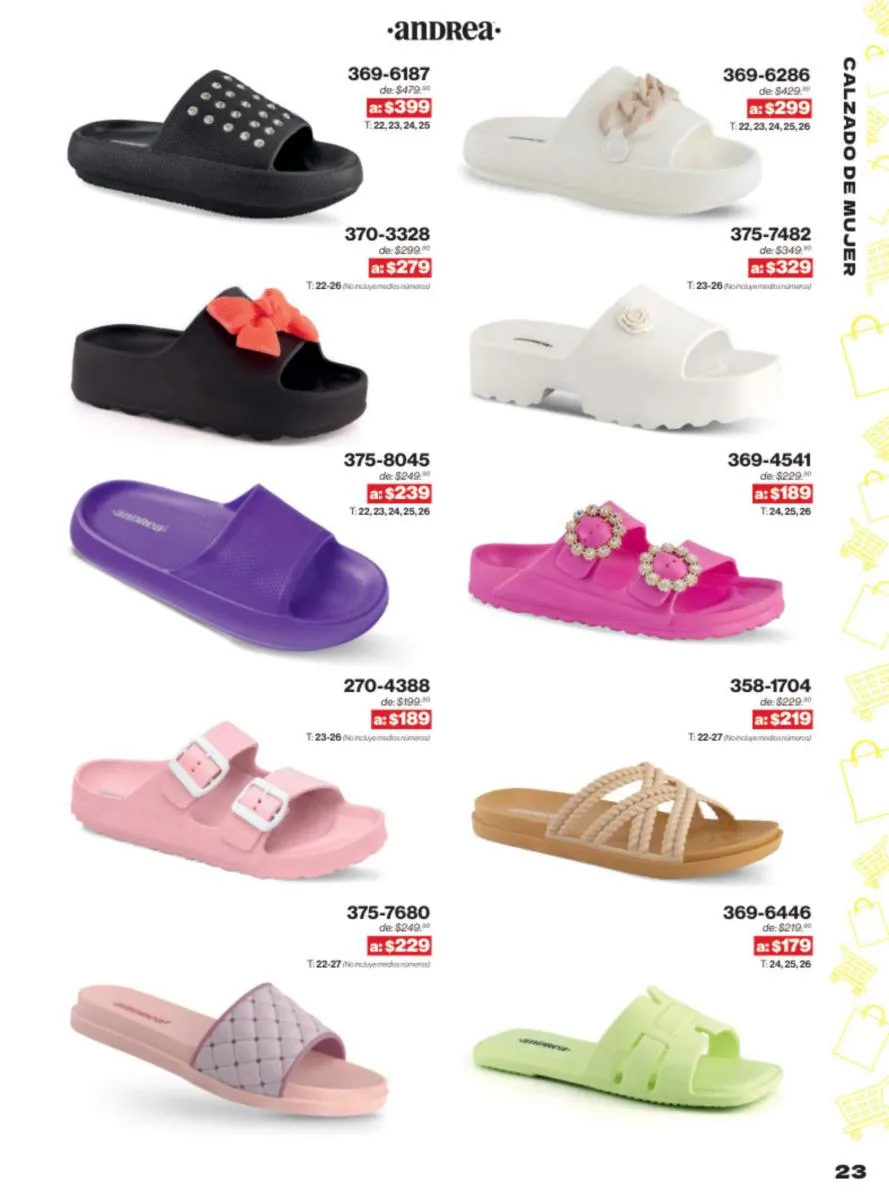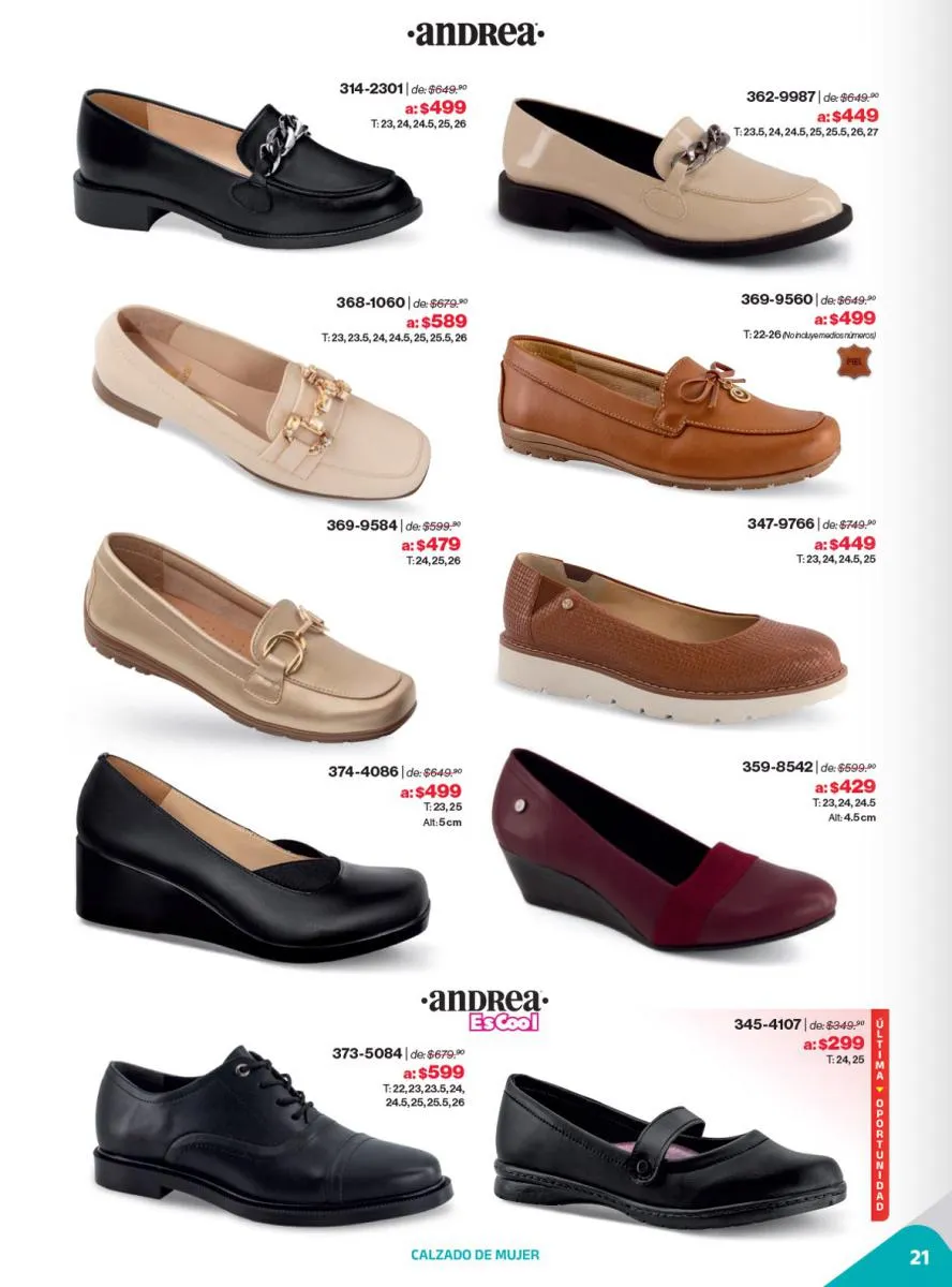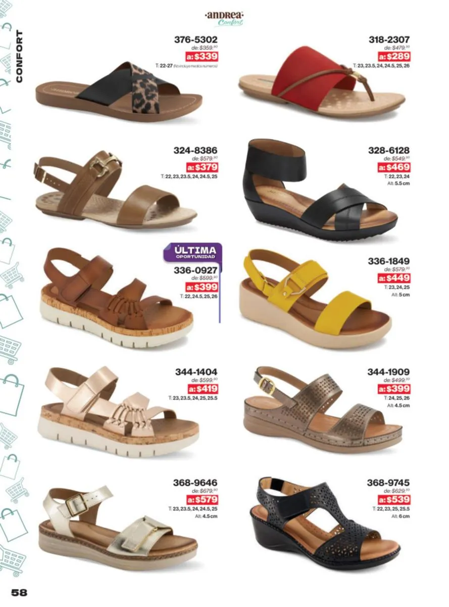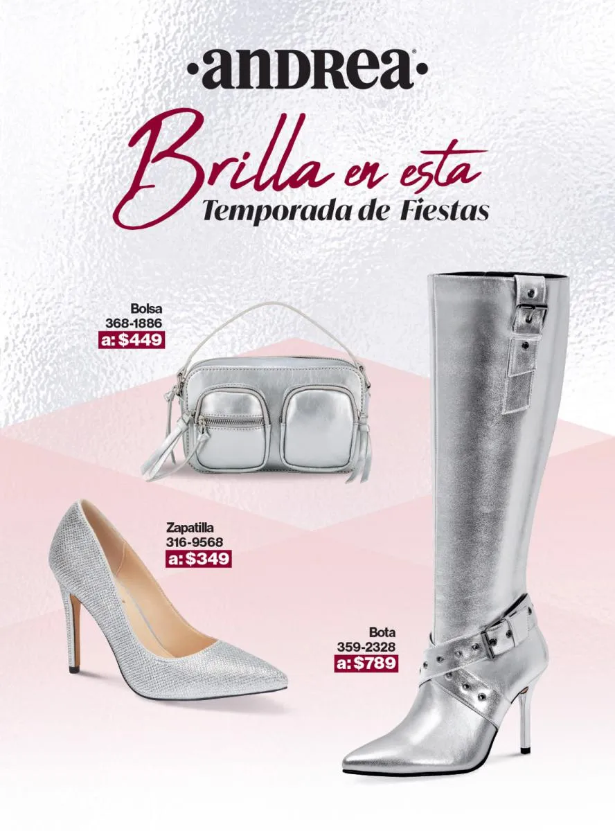 Las sandalias son un elemento esencial en cualquier guardarropa, y Andrea lo sabe muy bien. Este catálogo presenta una selección de sandalias con tacón que combinan comodidad y estilo. Destacan las sandalias en tonos vibrantes como el fucsia y el verde limón, perfectas para darle un toque de color a tus outfits veraniegos. Con detalles de correas ajustables y tacones de diferentes alturas, estas sandalias aseguran un ajuste perfecto y un look sofisticado.