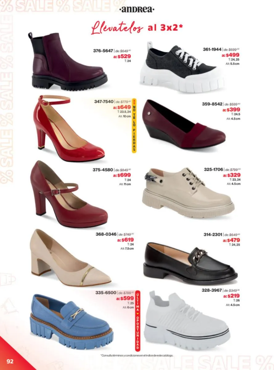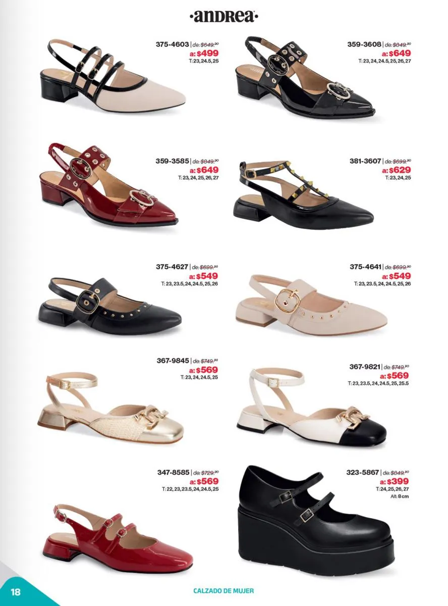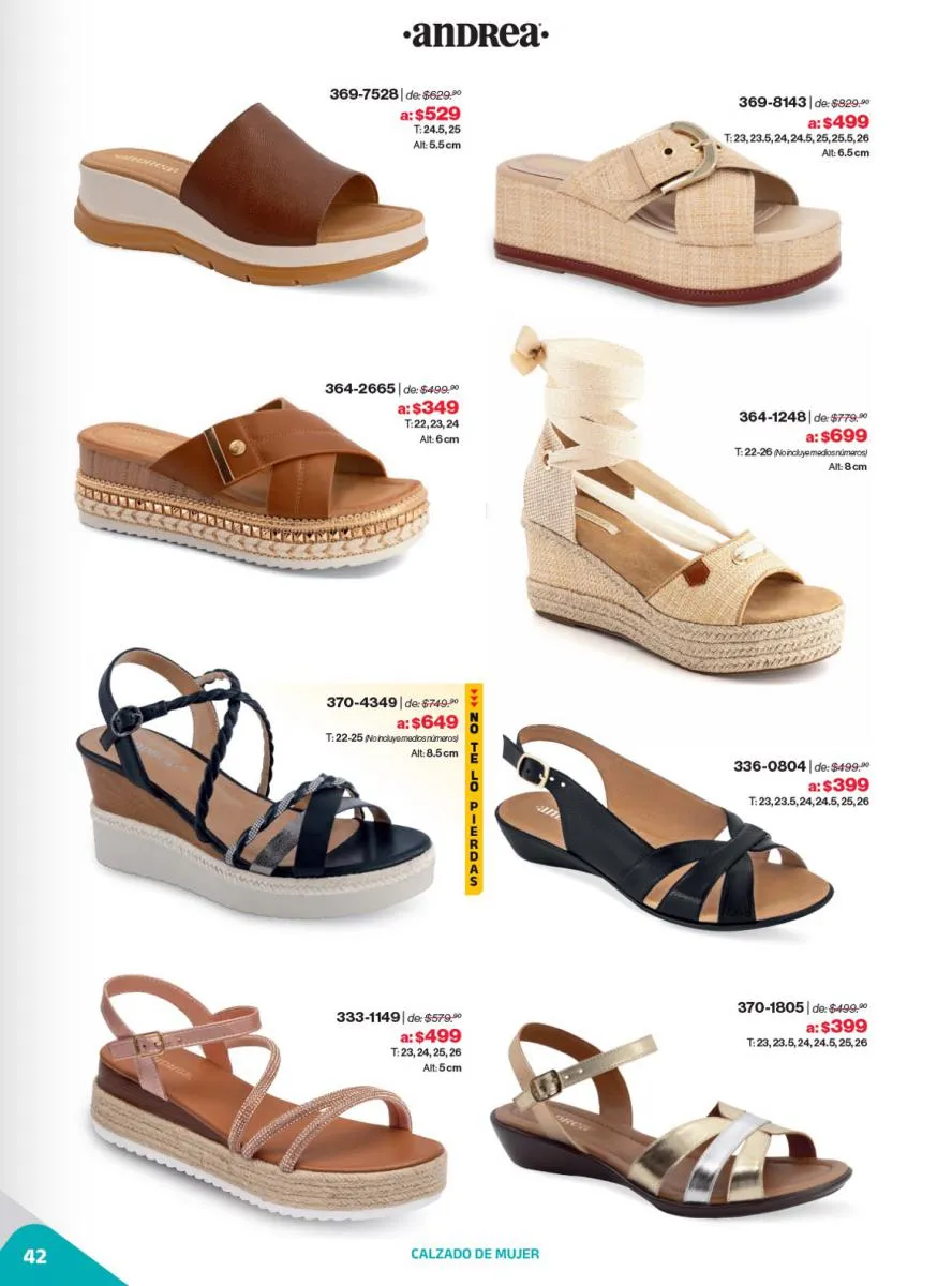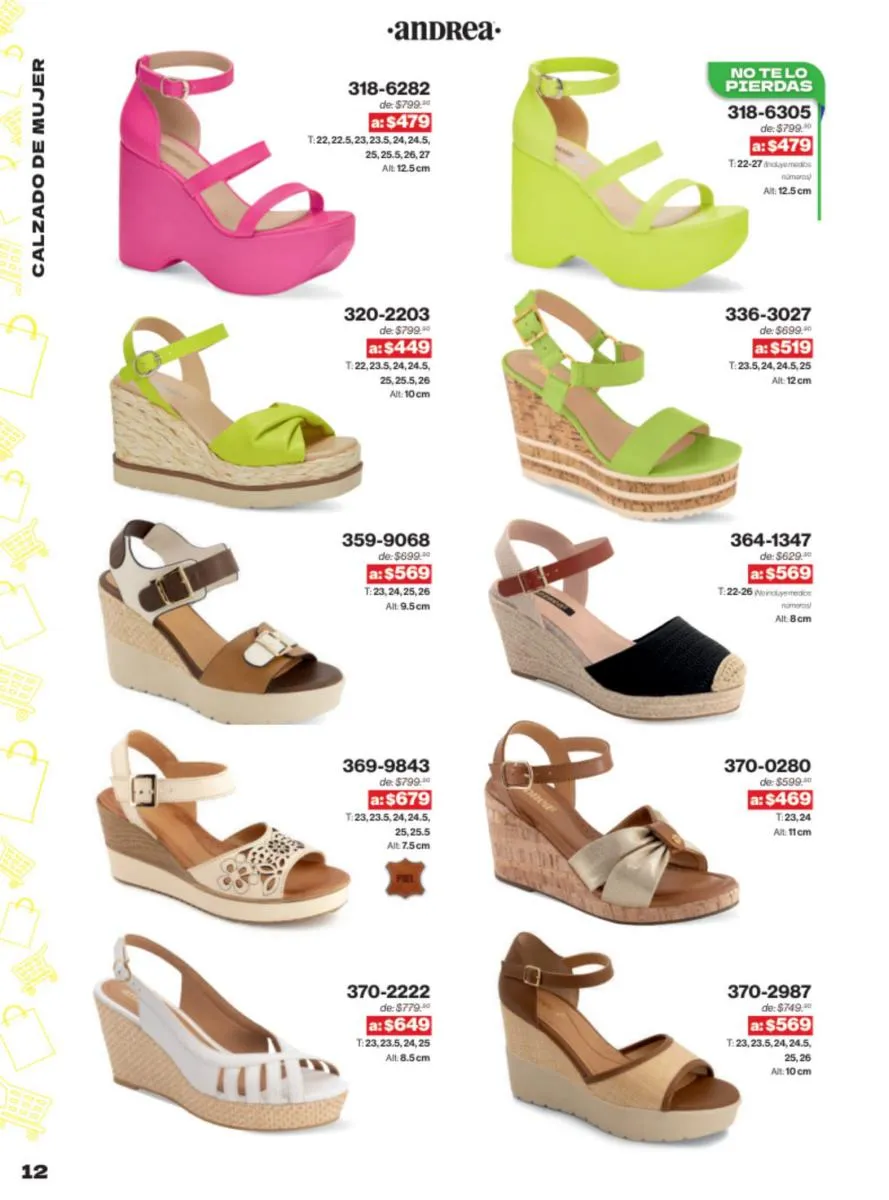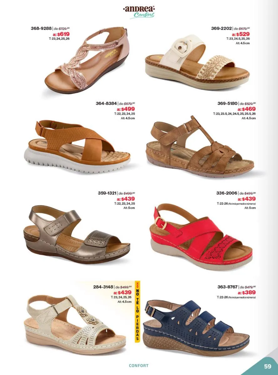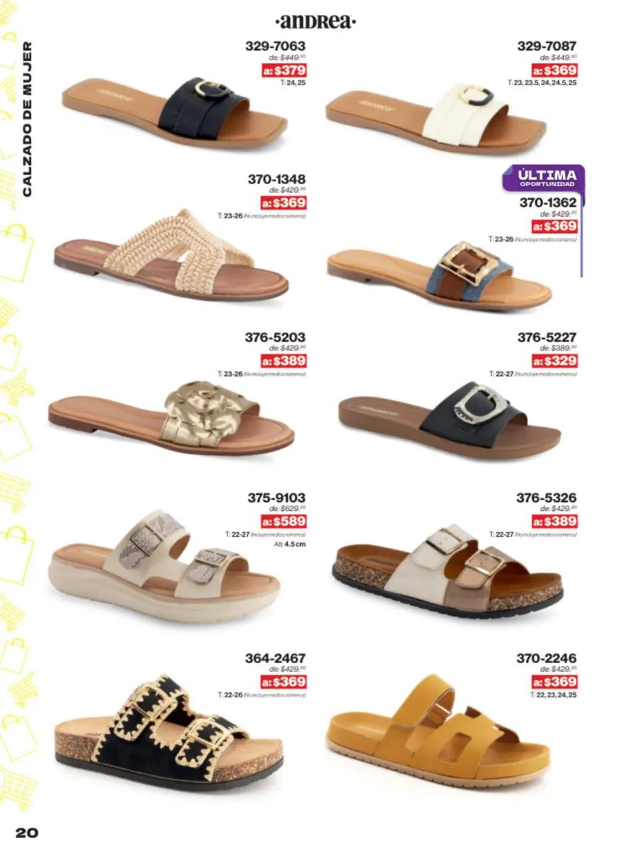 Las sandalias son un elemento esencial en cualquier guardarropa, y Andrea lo sabe muy bien. Este catálogo presenta una selección de sandalias con tacón que combinan comodidad y estilo. Destacan las sandalias en tonos vibrantes como el fucsia y el verde limón, perfectas para darle un toque de color a tus outfits veraniegos. Con detalles de correas ajustables y tacones de diferentes alturas, estas sandalias aseguran un ajuste perfecto y un look sofisticado.