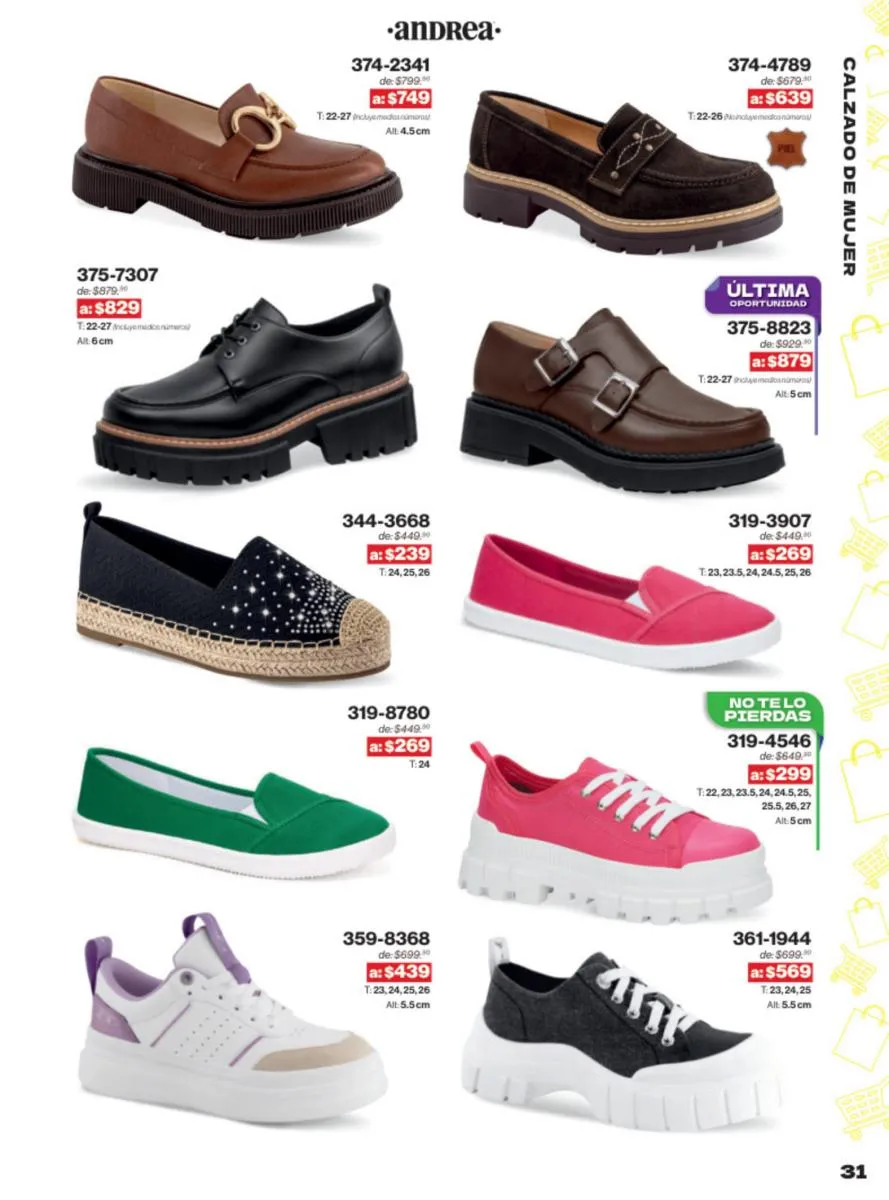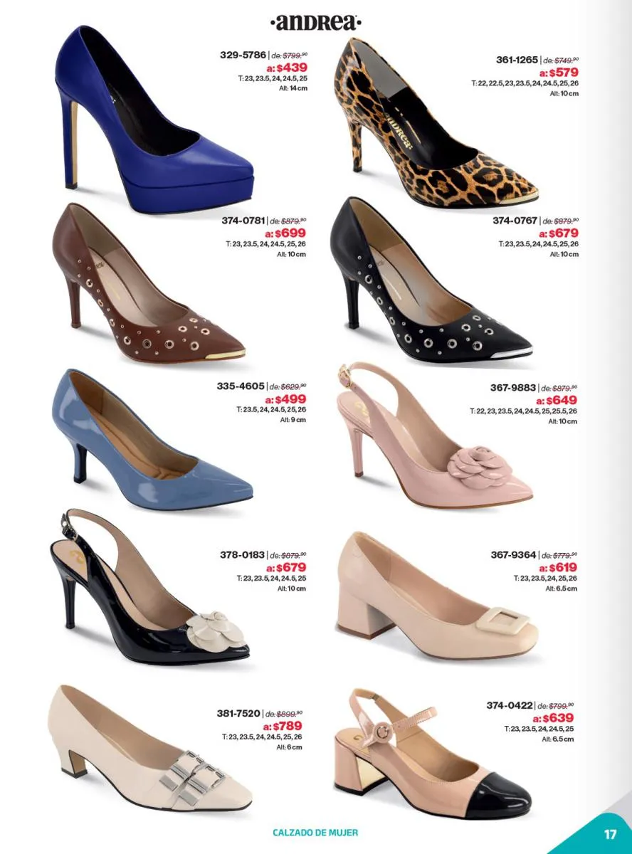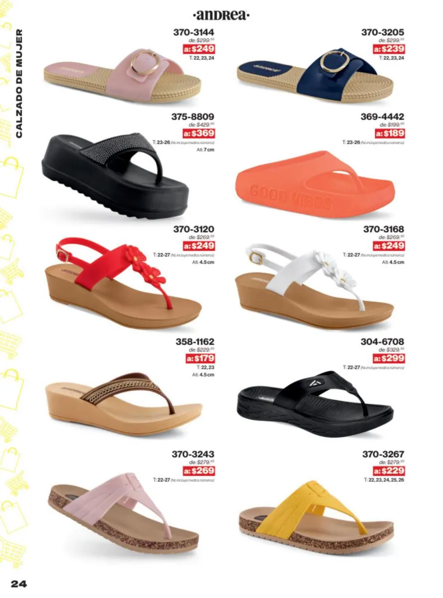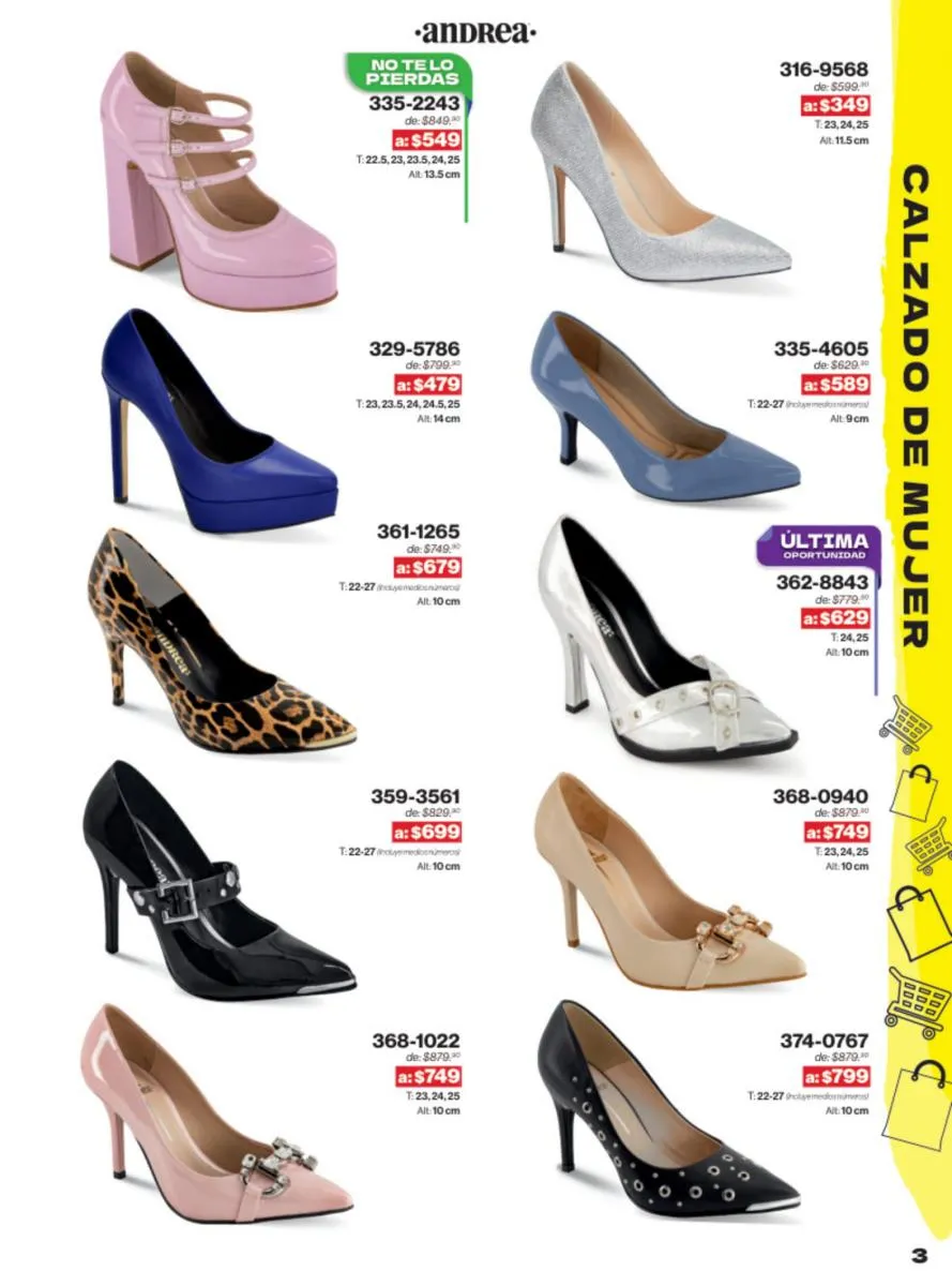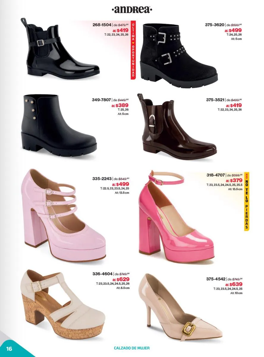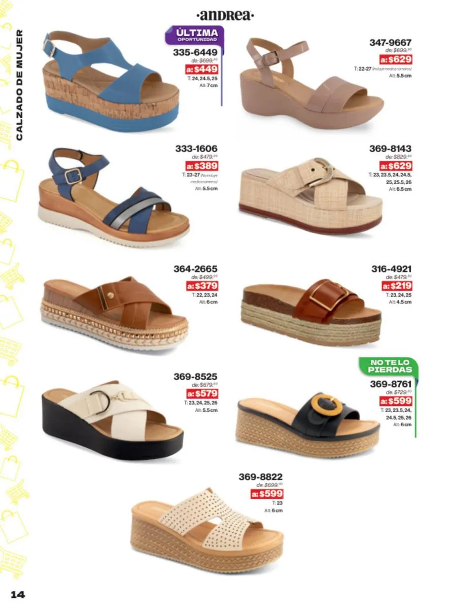 Las sandalias son un elemento esencial en cualquier guardarropa, y Andrea lo sabe muy bien. Este catálogo presenta una selección de sandalias con tacón que combinan comodidad y estilo. Destacan las sandalias en tonos vibrantes como el fucsia y el verde limón, perfectas para darle un toque de color a tus outfits veraniegos. Con detalles de correas ajustables y tacones de diferentes alturas, estas sandalias aseguran un ajuste perfecto y un look sofisticado.