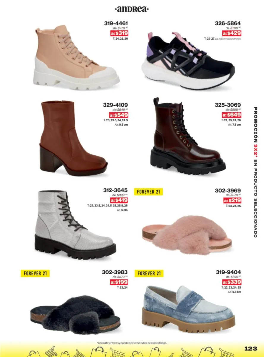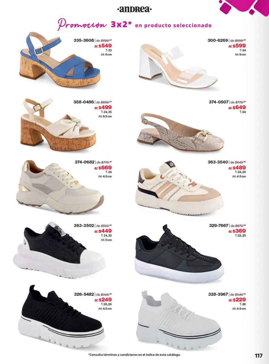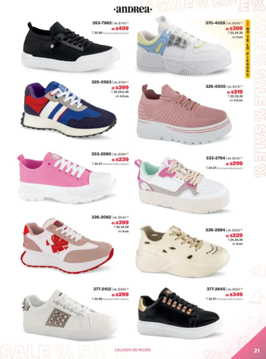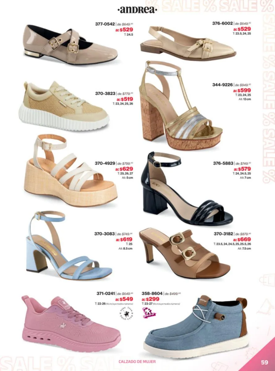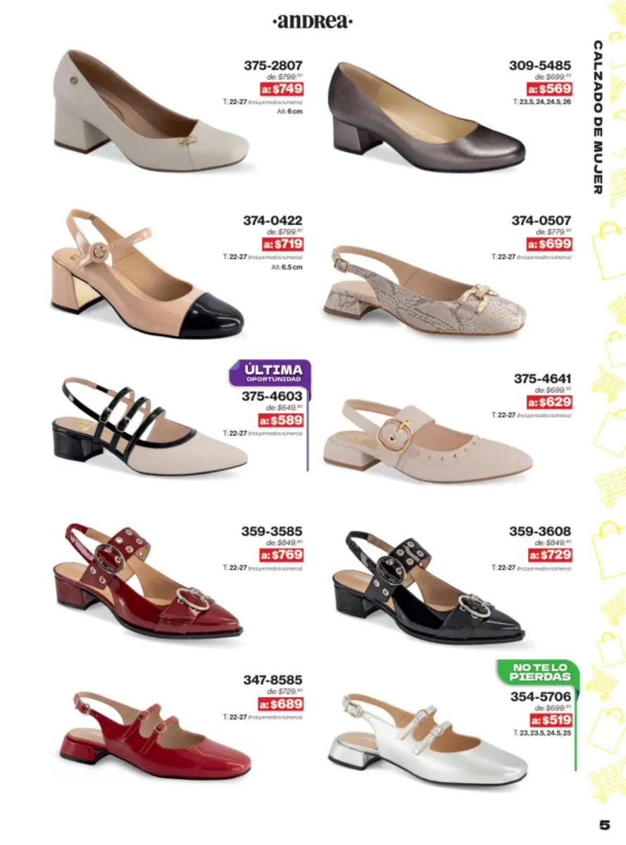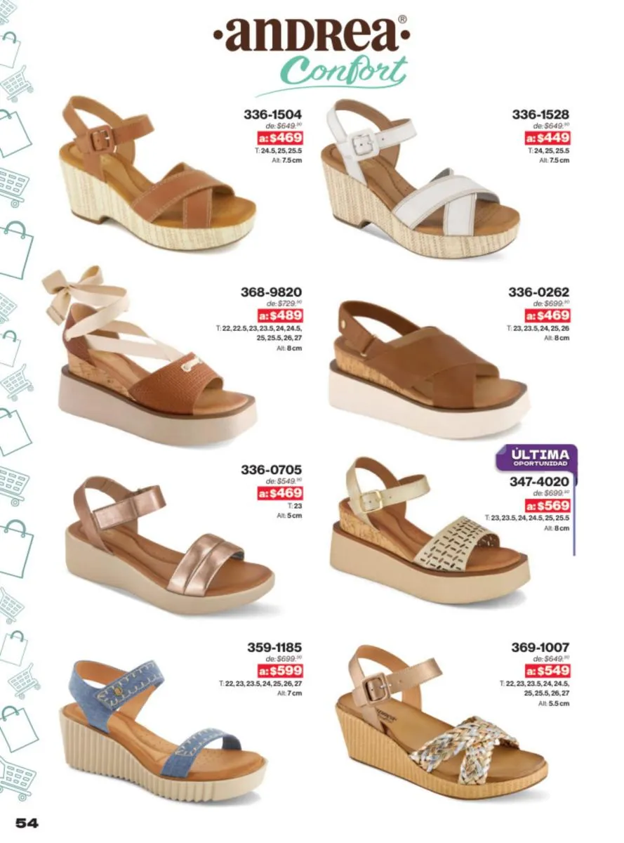 Las sandalias son un elemento esencial en cualquier guardarropa, y Andrea lo sabe muy bien. Este catálogo presenta una selección de sandalias con tacón que combinan comodidad y estilo. Destacan las sandalias en tonos vibrantes como el fucsia y el verde limón, perfectas para darle un toque de color a tus outfits veraniegos. Con detalles de correas ajustables y tacones de diferentes alturas, estas sandalias aseguran un ajuste perfecto y un look sofisticado.