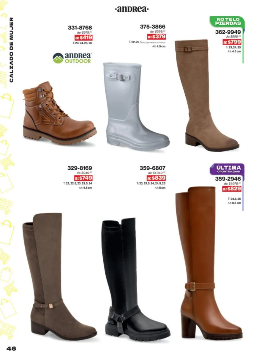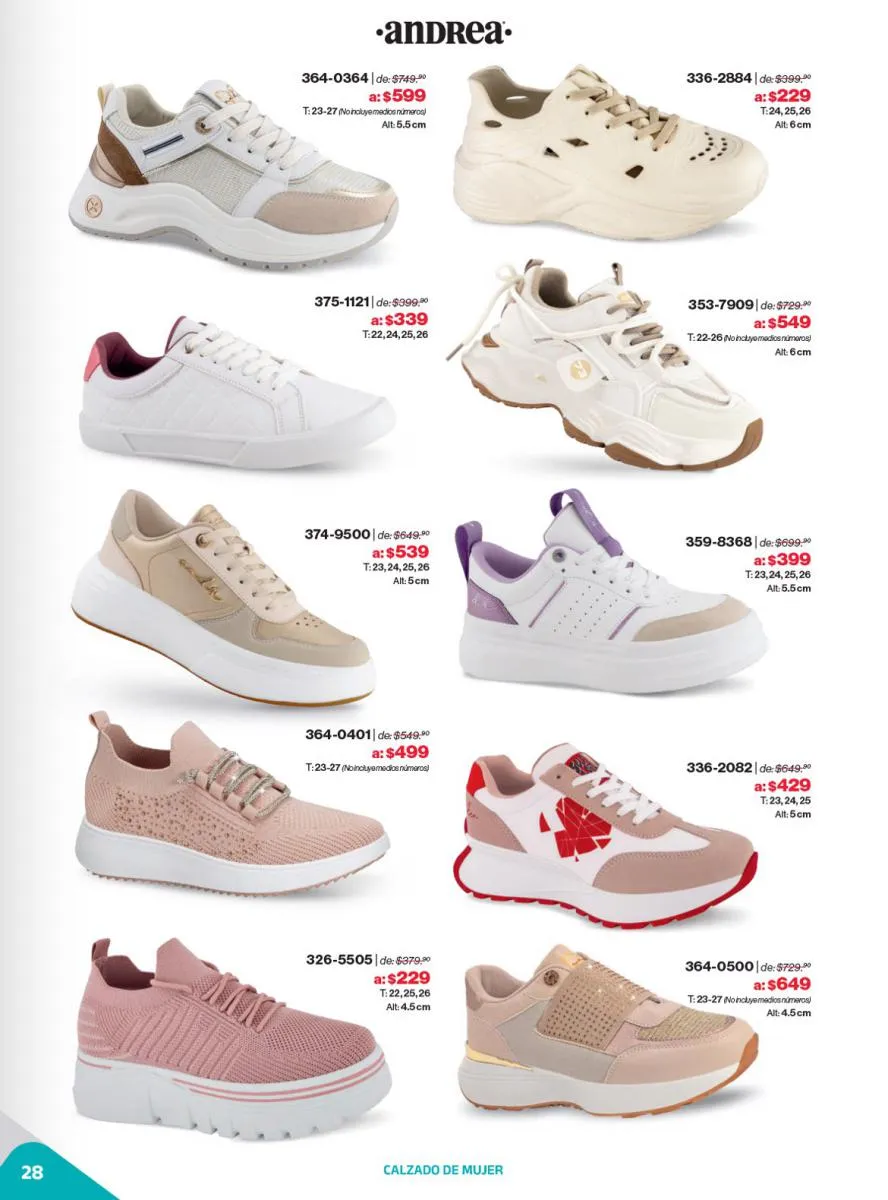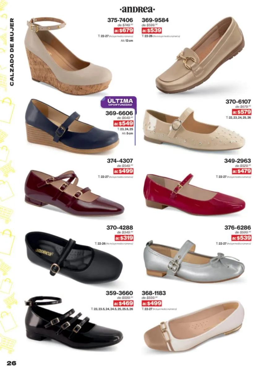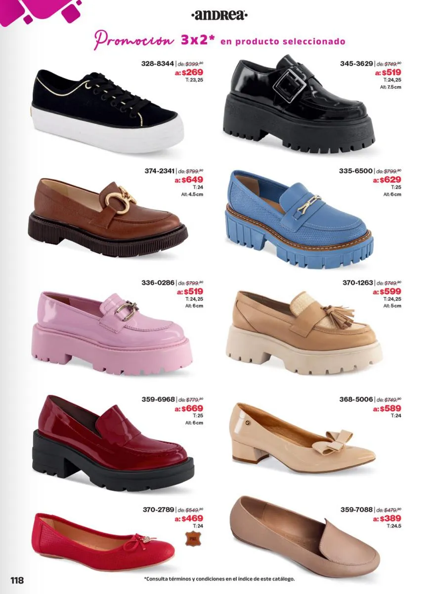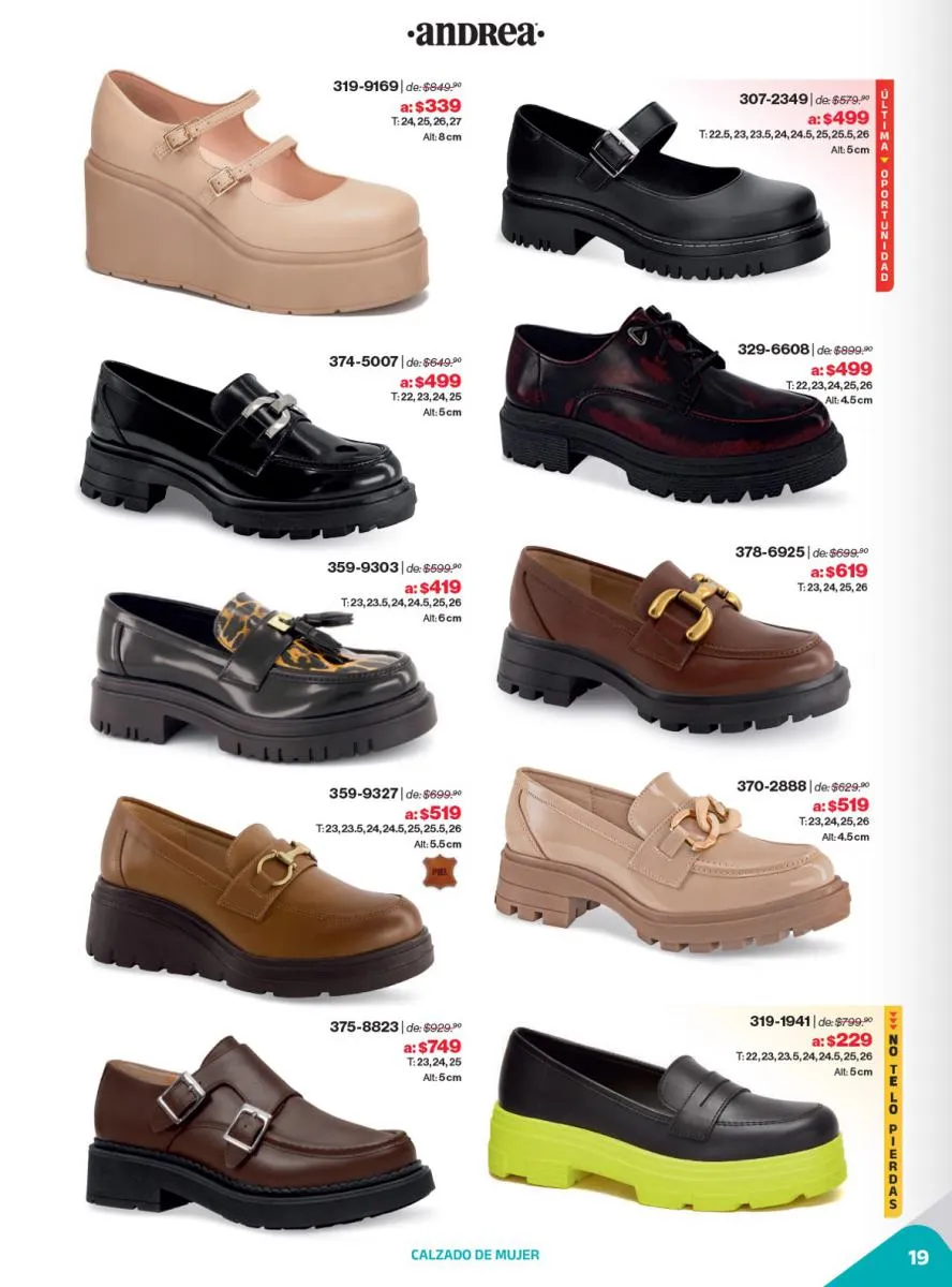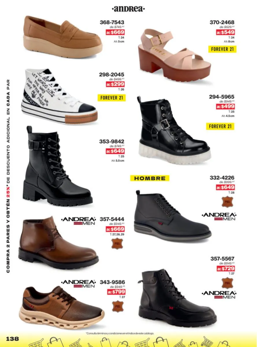 Las sandalias son un elemento esencial en cualquier guardarropa, y Andrea lo sabe muy bien. Este catálogo presenta una selección de sandalias con tacón que combinan comodidad y estilo. Destacan las sandalias en tonos vibrantes como el fucsia y el verde limón, perfectas para darle un toque de color a tus outfits veraniegos. Con detalles de correas ajustables y tacones de diferentes alturas, estas sandalias aseguran un ajuste perfecto y un look sofisticado.